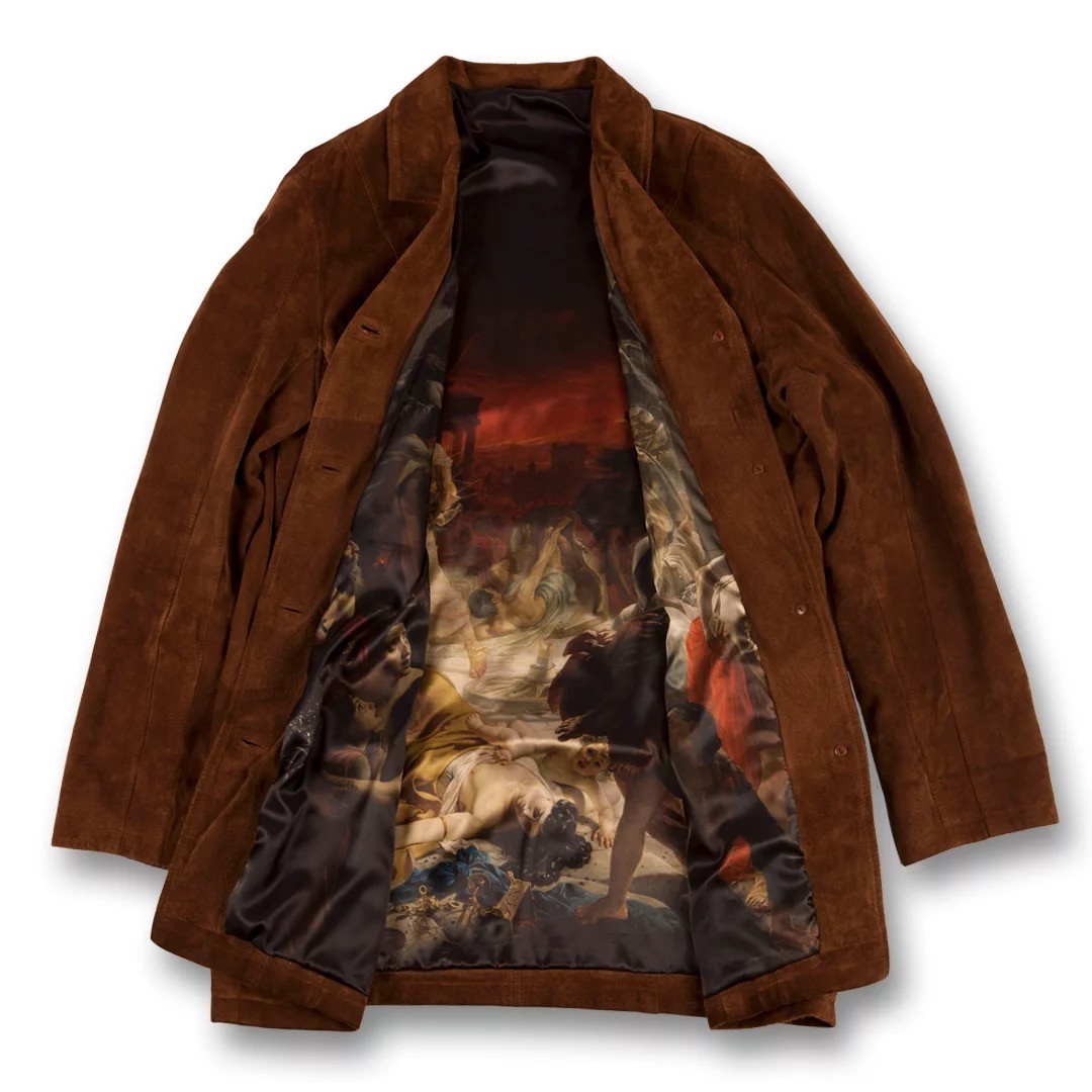 Дизайнер из Петербурга Стас Никатанов для своего бренда, победителя нашего конкурса «Новые имена в моде-2019», создал итальянскую замшевую куртку с атласной подкладкой – репродукцией картины Карла Брюлова «Последний день Помпеи». Ответственно заявляем, что это лучшая униформа для походов в Русский музей – экскурсоводы с первого взгляда поймут, что в вопросах искусства вы не дилетант.