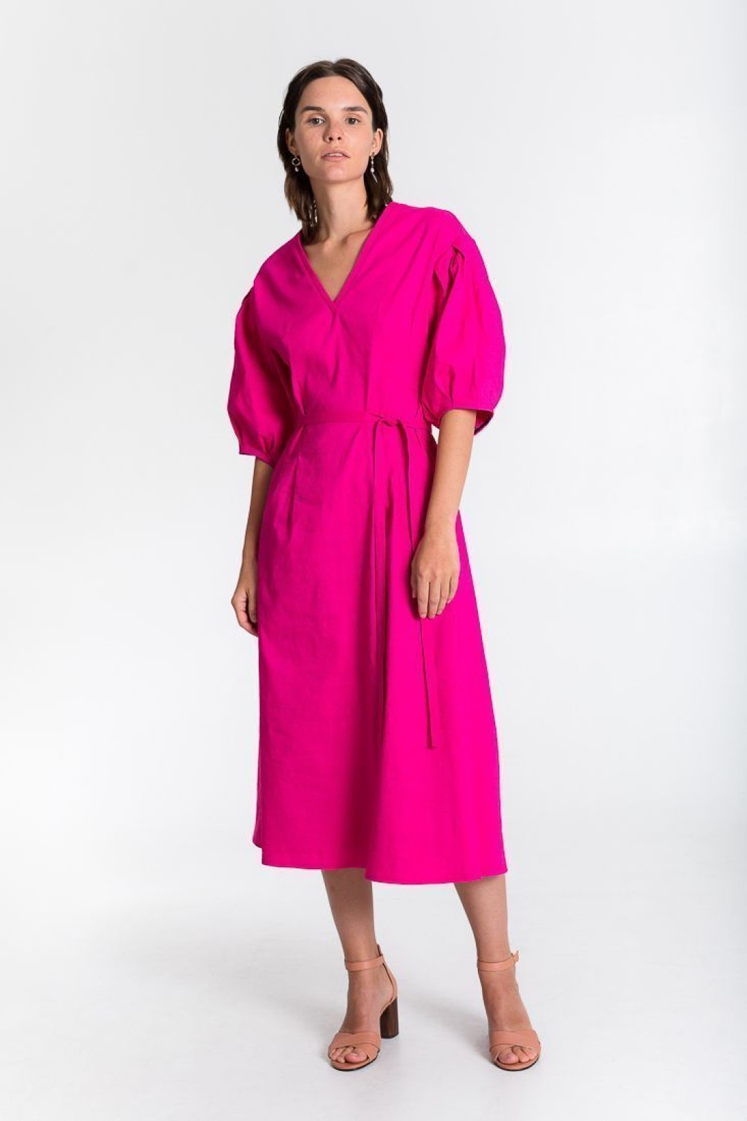 Платье с объемными рукавами подойдет для долгих закатных променадов и поездок на пикники загород, а свободный крой и яркий оттенок превращают его в вещь, которую не захочется снимать и дома во время карантина.