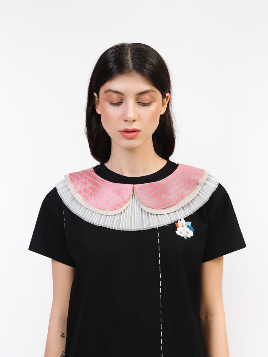 Полосатый розовый воротничок на завязках с нижним слоем из гофре в новой коллекции бренда Оли Гинзбург – вещь, перед покупкой которой трудно устоять.