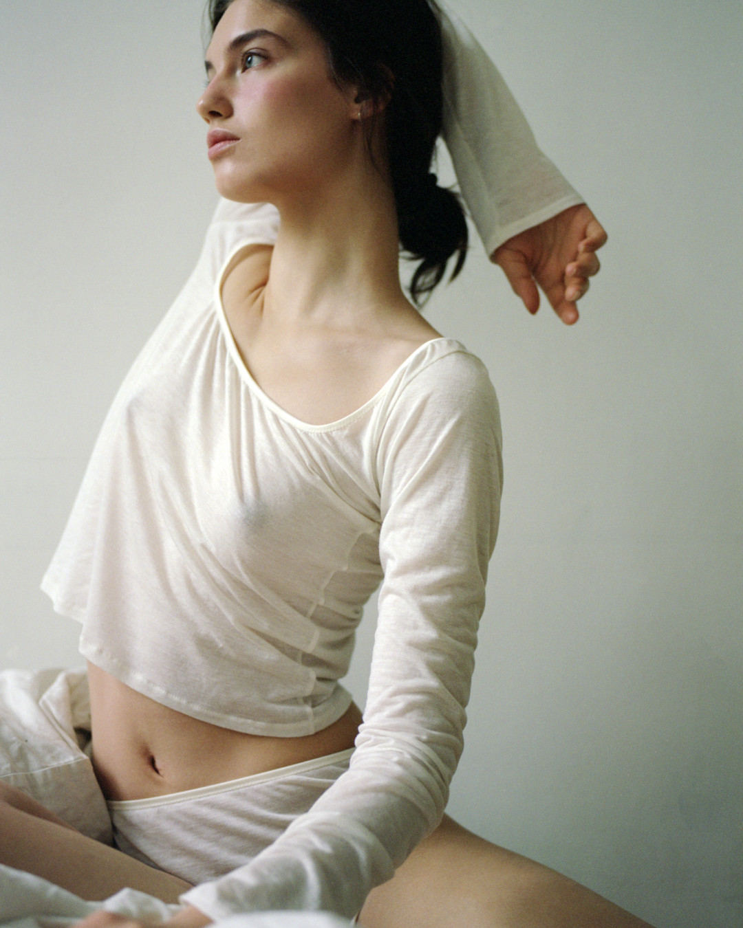 Петербургский бренд нижнего белья Corporelle Lingerie – наш ответ Petra и Victoria's Secret. Топ и трусики из полупрозрачного джерси из шерсти и шелка сделаны вручную – настоящий предмет портного искусства.