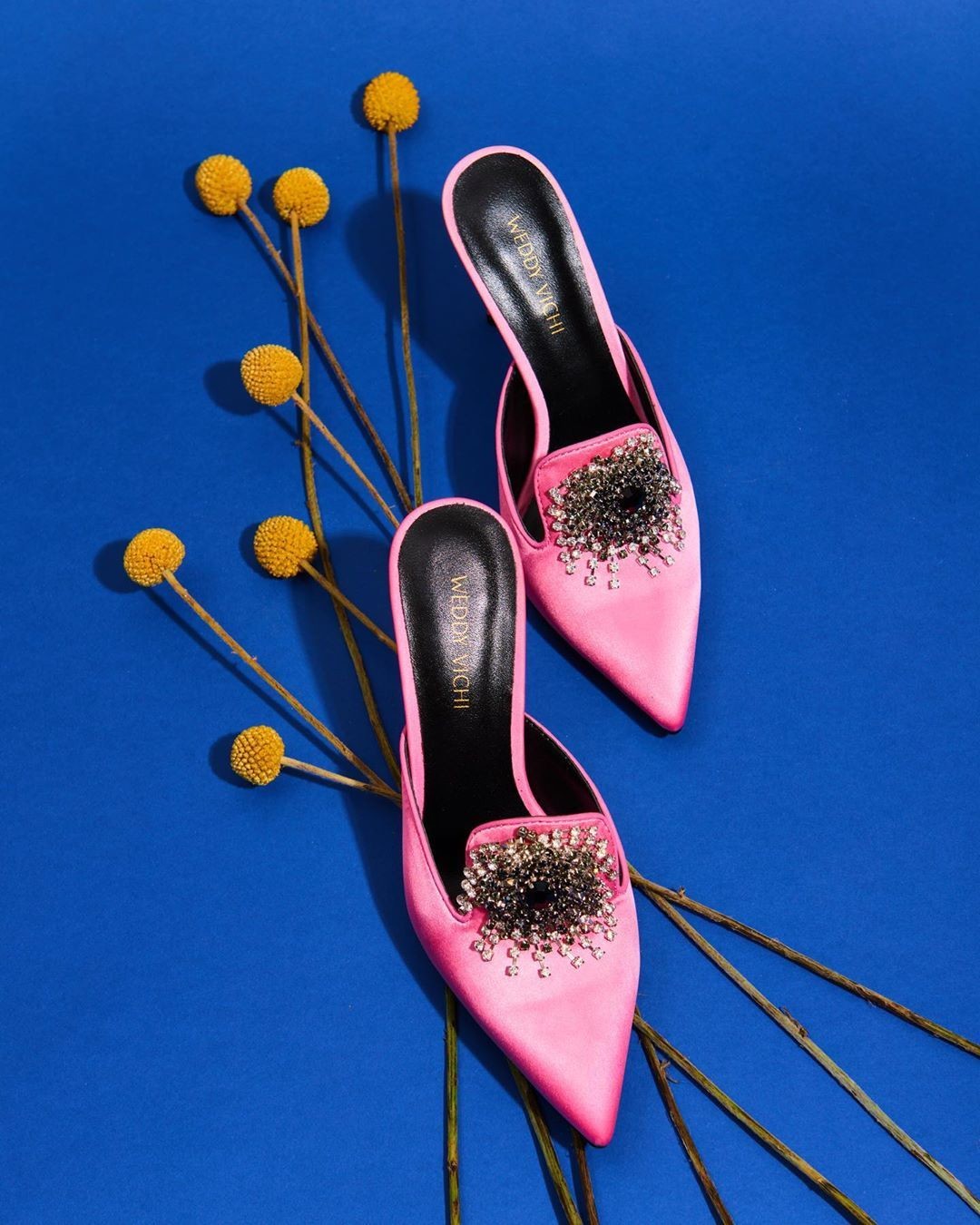 В шоуруме Юлии Большаковой и Юлии Осиповой берем розовые мюли с брошкой – для первых светских выходов этим летом.