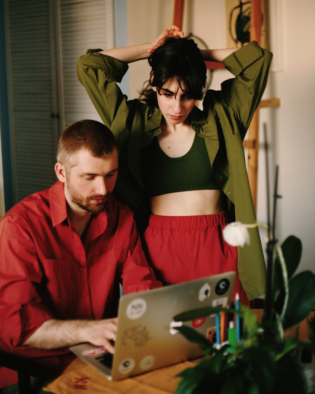 Бренд Нелли Недре NNedre в свою очередь снял лукбук дома – на кадрах модель в новой коллекции марки работает за ноутбуком, рисует, красится и пьет кофе вместе с молодым человеком.