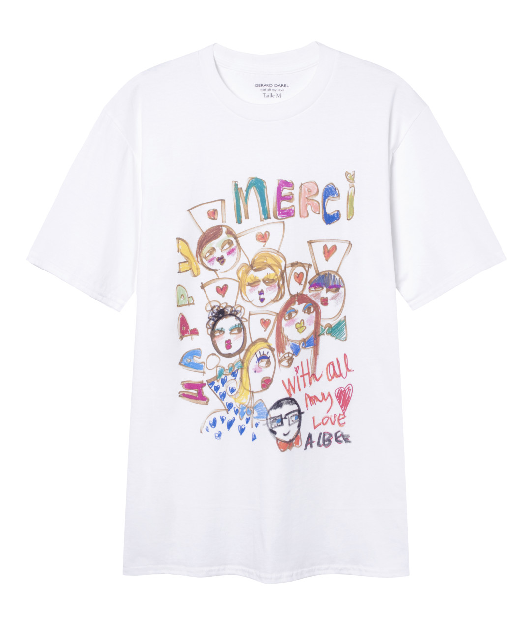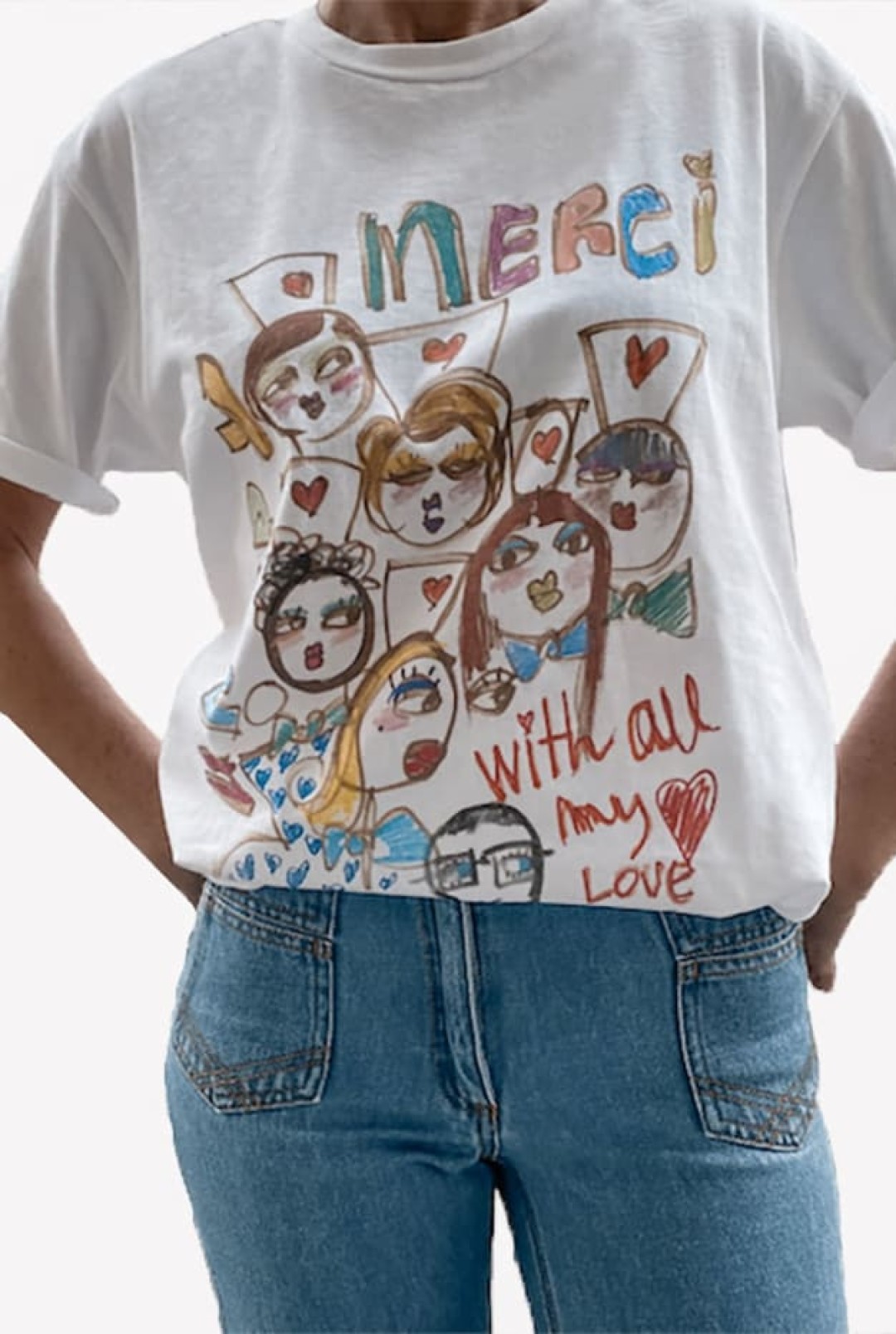 В знак благодарности медсестрам и врачам, которые уже несколько месяце борются с пандемией коронавируса, дизайнер Альбер Эльбаз и французский бренд Gerard Darel выпустили футболку Merci.
