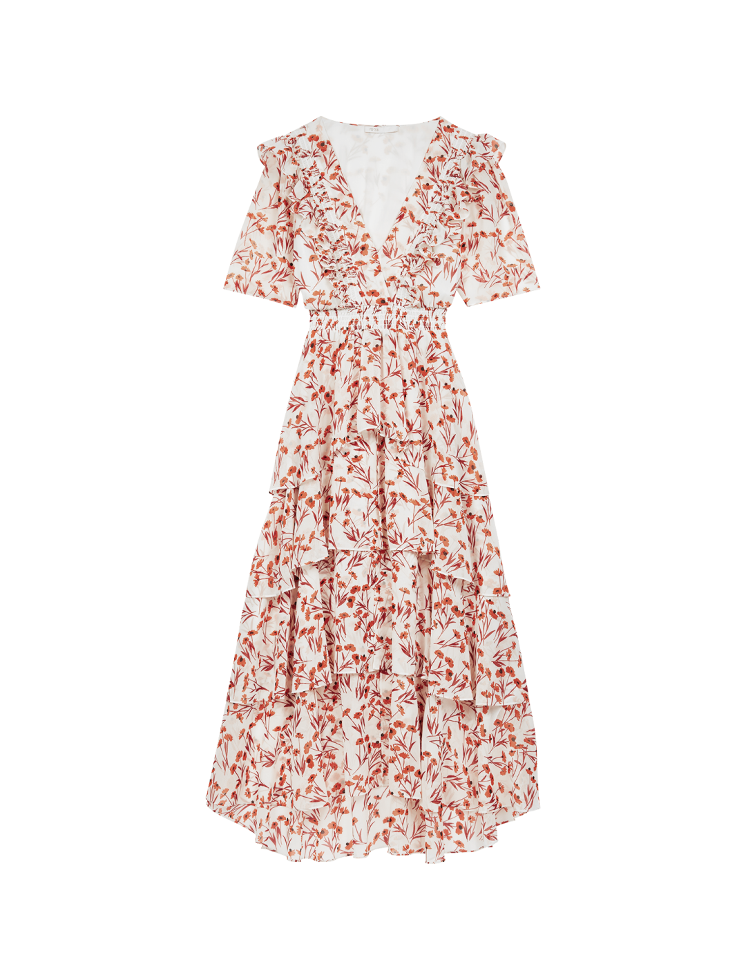 Почетное место отведено и цветочным узорам, они украшают макси и мини-платья с оборками, воланами, V-образными вырезами и воротниками стойкой.