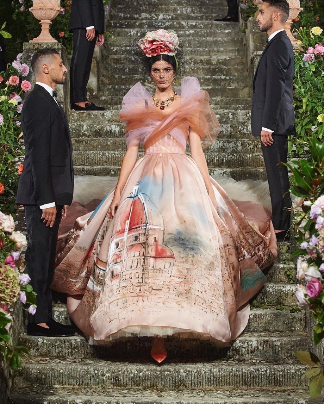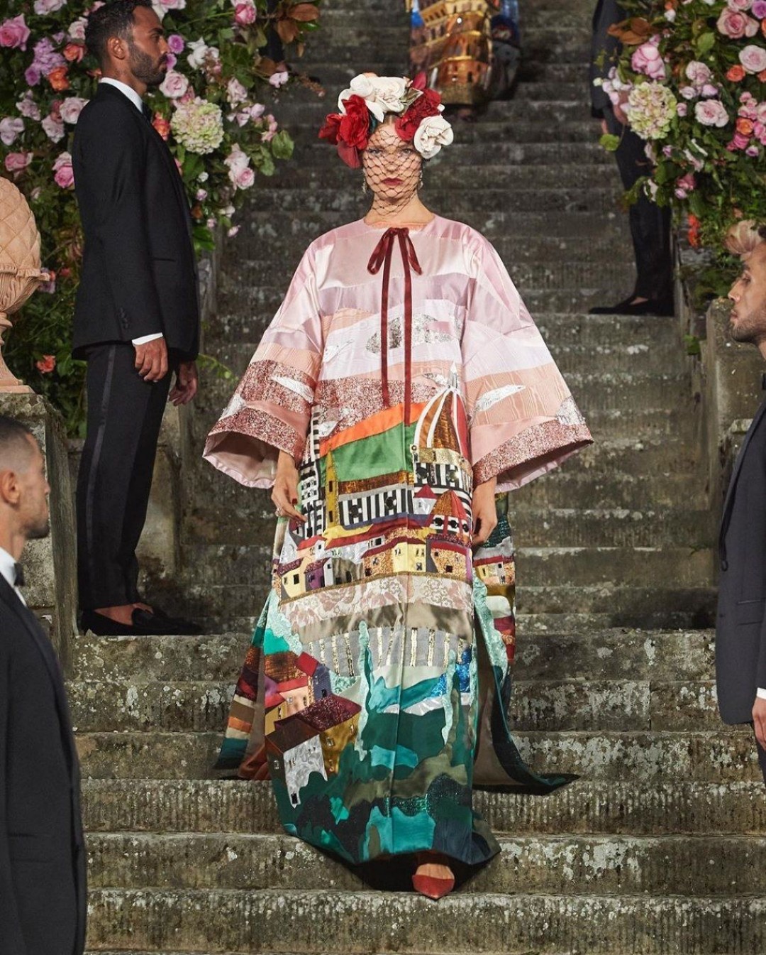 Платья с цветочными принтами и искусственными растениями на шоу Dolce & Gabbana Alta Moda