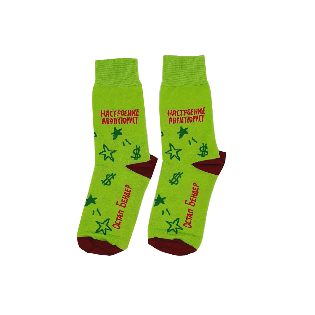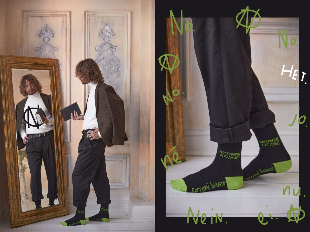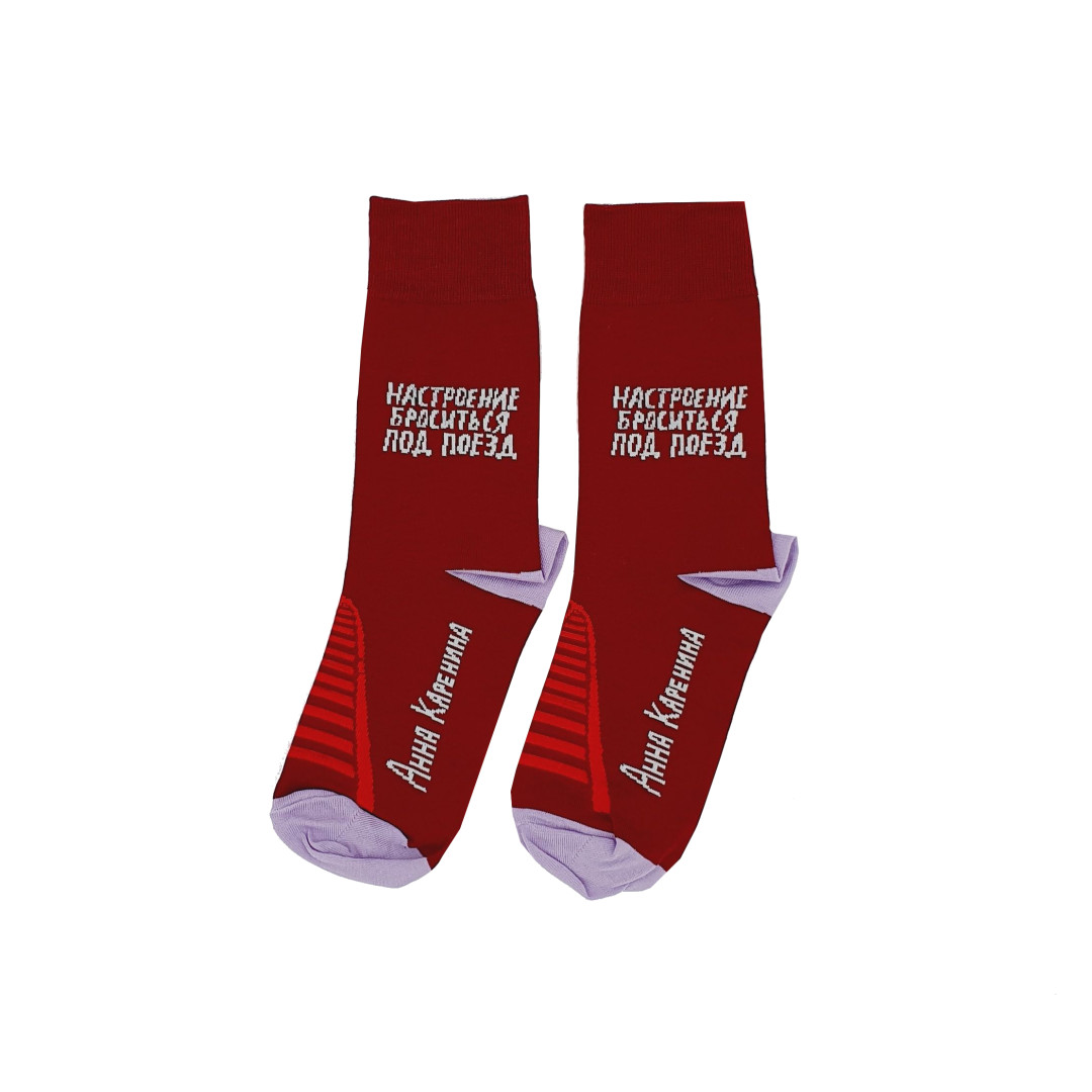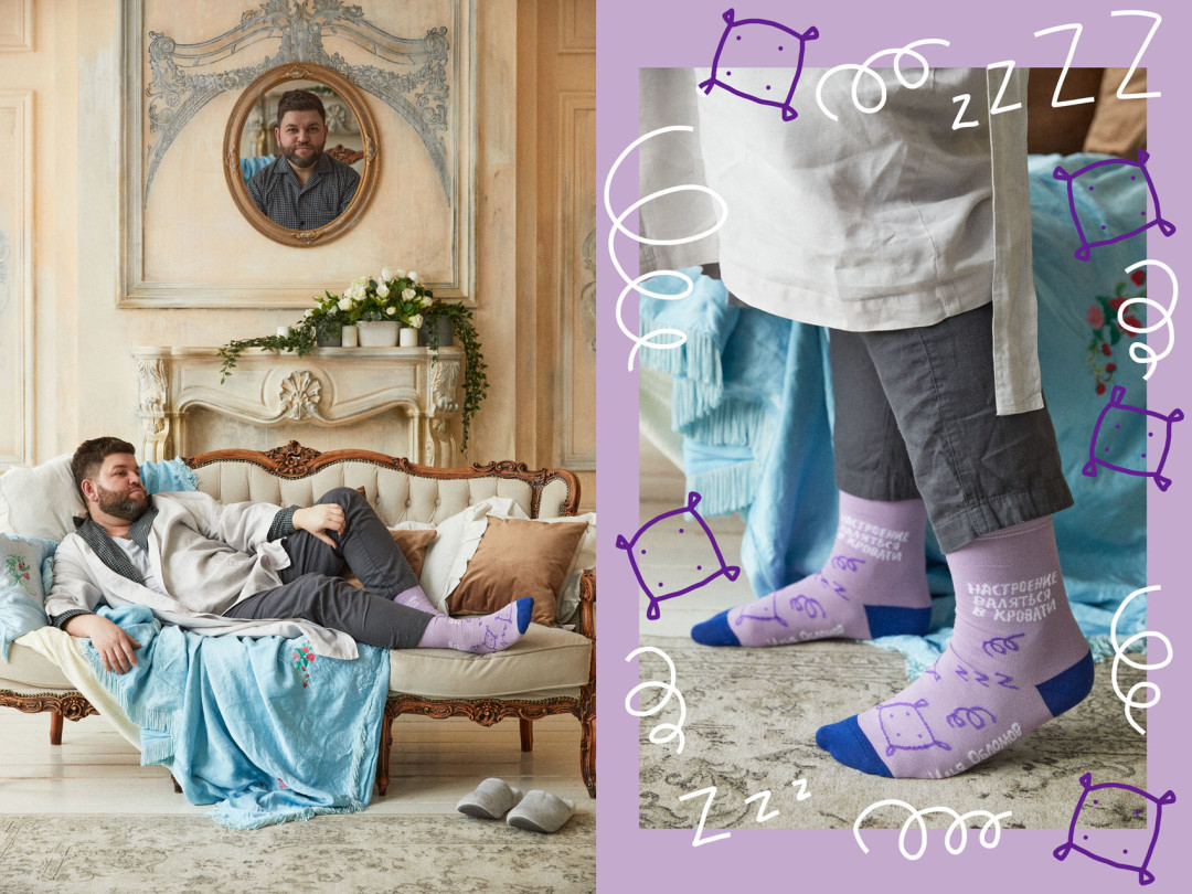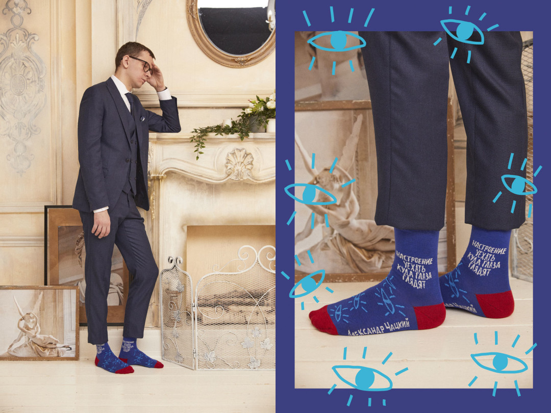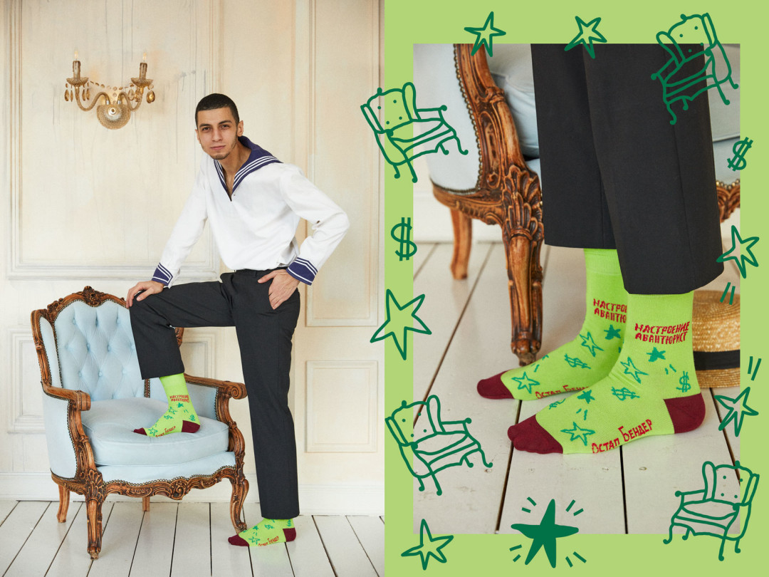 Кроме реверанса произведениям российских классиков, носки из коллаба St. Friday Socks x MyBook — это еще и индикатор вашего настроения для окружающих. Например, носки, посвященные Анне Карениной, дадут сигнал, что к их владельцу сегодня лучше не подходить, так как у него «настроение броситься под поезд», пара салатового цвета со звездами и символами доллара, отсылающая к Остапу Бендеру, намекнет на авантюристский настрой, а если вы сами не в состоянии разобраться со своими эмоциями, это отразит модель «Родион Раскольников». Другие носки из коллекции подойдут к конкретному случаю: «Наташу Ростову» можно надеть на свидание — пусть потенциальный кандидат не расслабляется, у вас таких еще целый вагон, «Илья Обломов» — идеальный вариант для выходного дня, «Евгений Базаров» в черном цвете — для встречи с заказчиком или начальством.