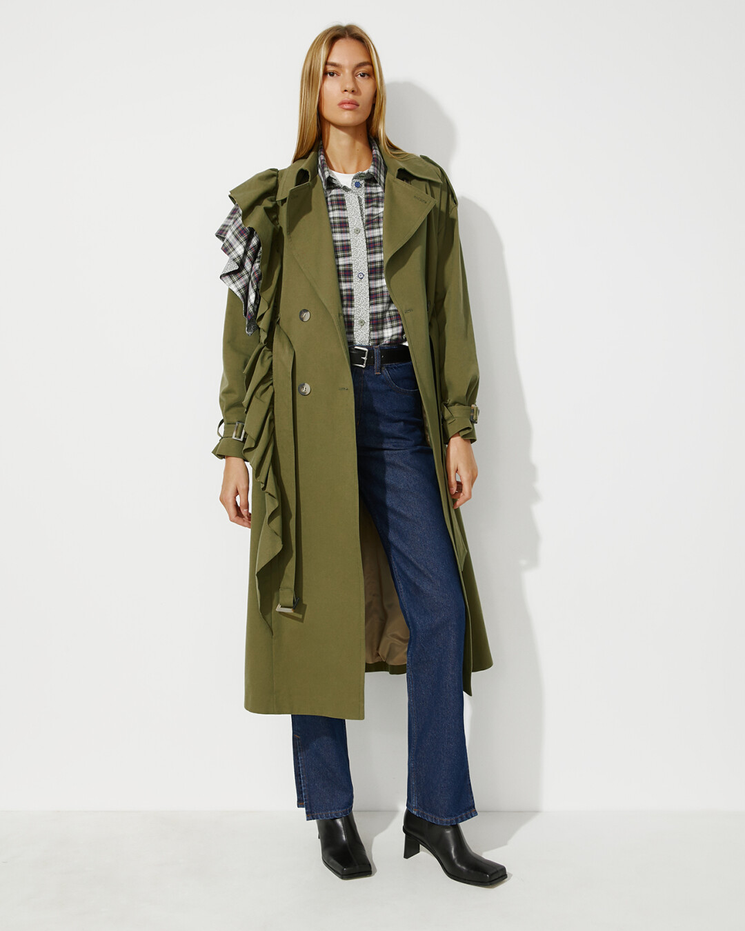 Локальные бренды тоже не дремлют. Они как никто понимают городскую проблематику бежевых тренчей и предлагают свои решения: тренч в оттенке темного шоколада Nnedre, черный вариант из эко-кожи Gate31, дождевик с неброским леопардовым принтом Ola Ola и ресайкл-плащ Rishi. Есть еще один в оттенке хаки с бешеной клетчатой рюшей 2Mood, они хоть и москвичи, но говорят, у них на Патриках тоже сквозь тренчи не протолкнуться.