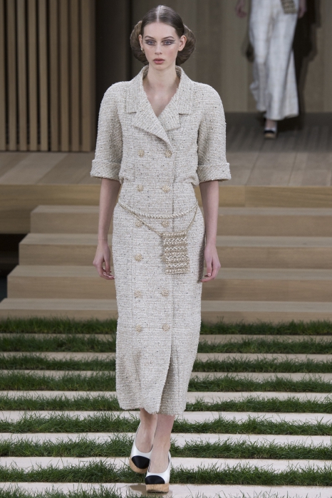 Внутри Grand Palais — деревянный дом, из которого выходили модели и прогуливались по искусственным лужайкам. В коллекции — наряды со сложнейшими вышивками, из шелка, уложенного волнами, и накидки, усыпанные тысячами бусин. Каждый из семидесяти пяти луков сопровождала одна и та же модель обуви, но в разном цвете: туфли с круглым носом и фигурной танкеткой. В модельном составе — подруги Кендалл Дженнер и Джиджи Хадид, Саша Пивоварова, и сестры из Петербурга Юля и Вика Павловы. «Невестой» шоу стала Мика Арганаз, которую сопровождал Батист Джиабикони, муза Лагерфельда.