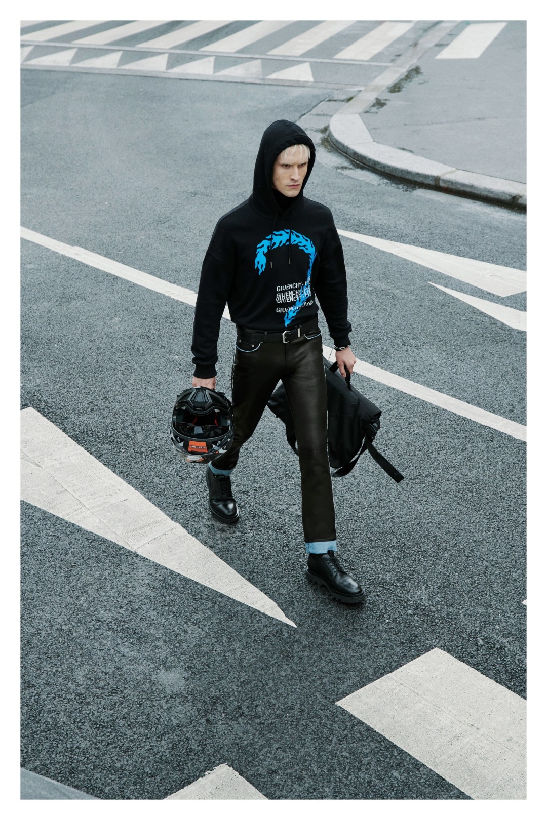 Также за атмосферу коллекции, снятую на улицах Парижа с нанесенным на асфальт логотипом Givenchy, отвечал стайлинг в виде ультрамодных нагрудных сумок и брендированных мотоциклетных шлемов. Последние, как показывают в лукбуке мужчины, можно носить и на голове (в целях безопасности), и в руках как сумку (ради красивого стритстайл-отчета). Pitti Uomo, на котором Клэр Уэйт Келлер устроит первый мужской показ, не за горами!
