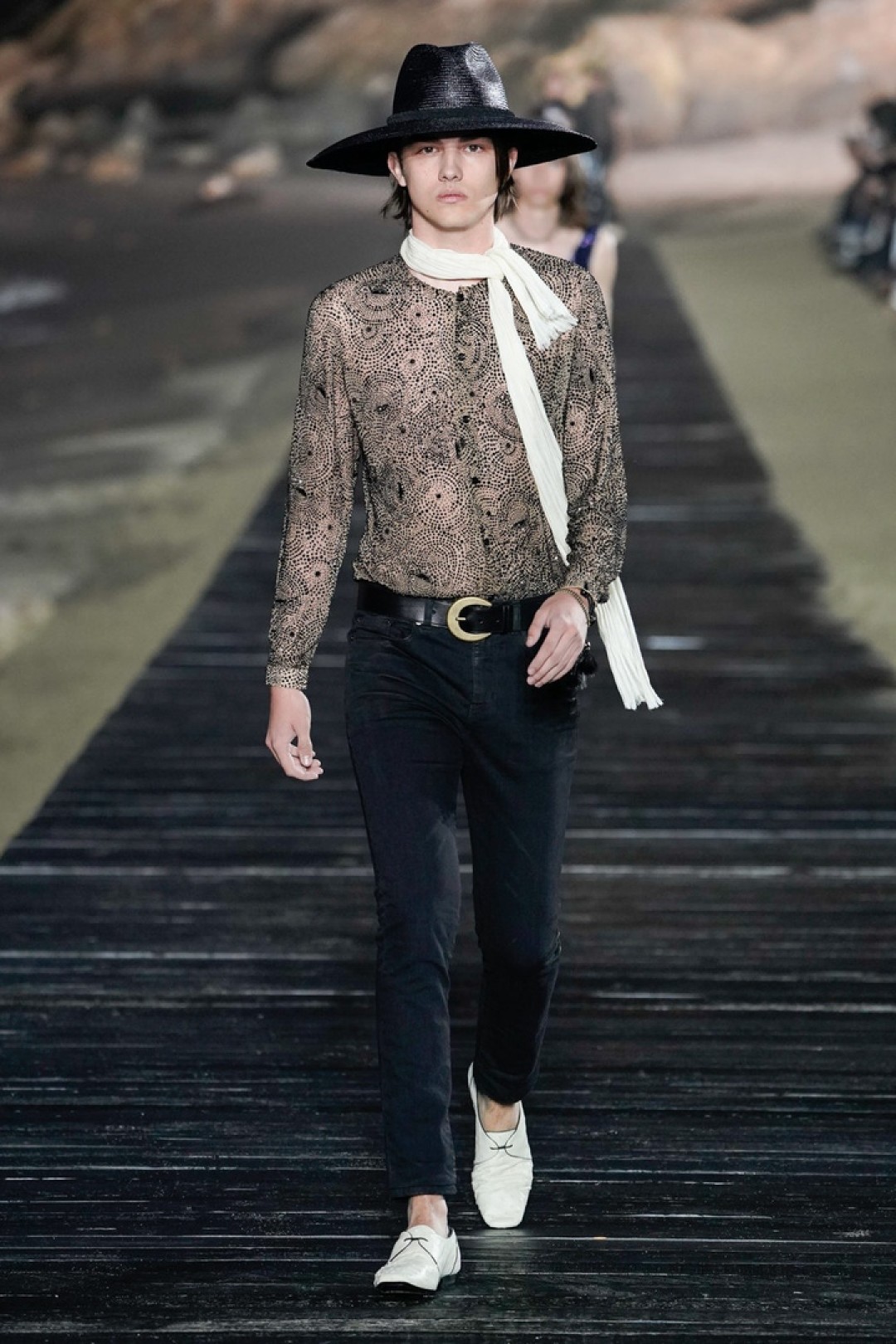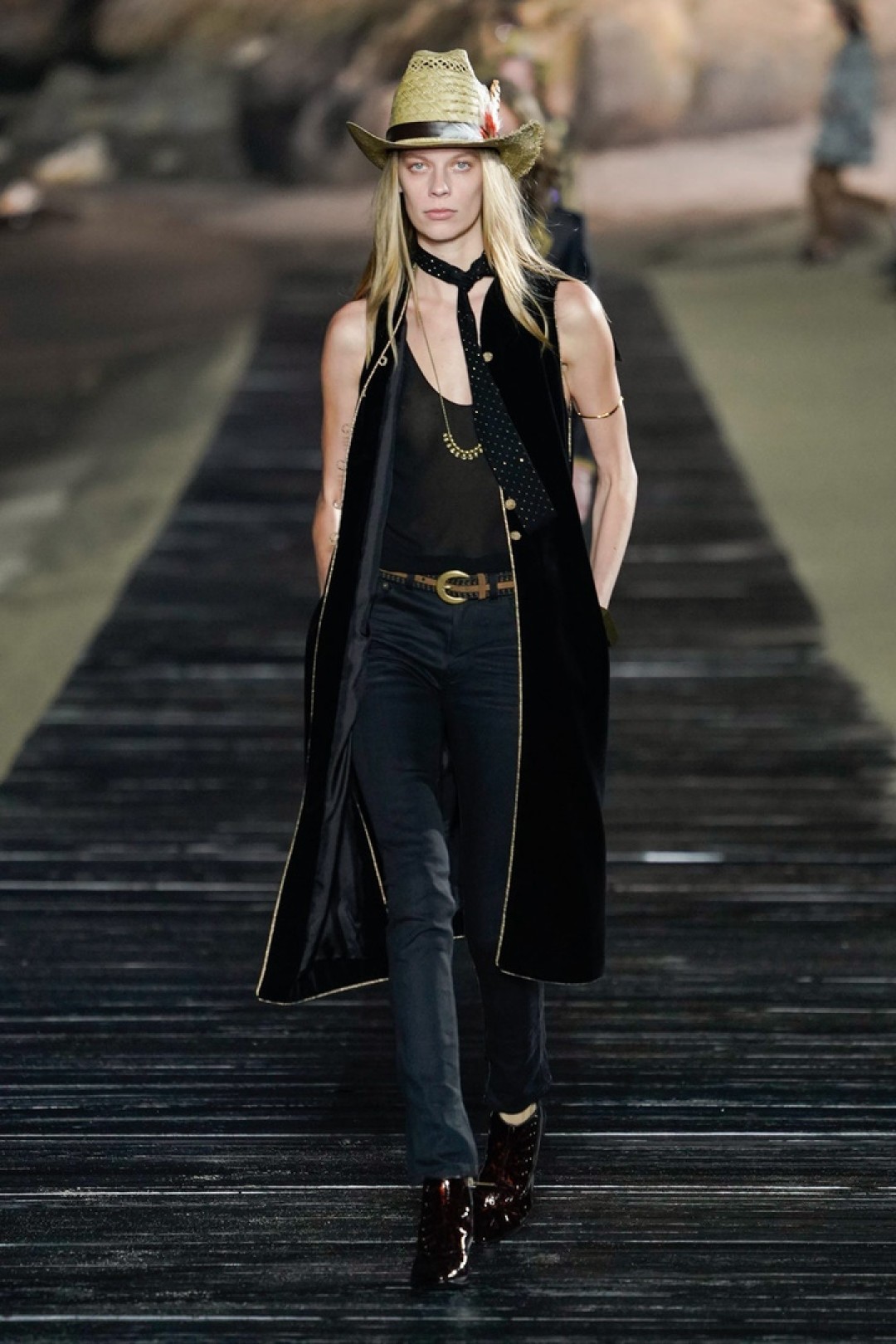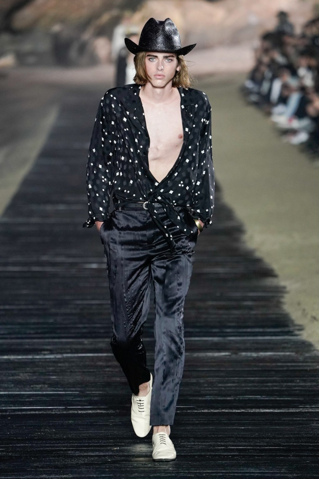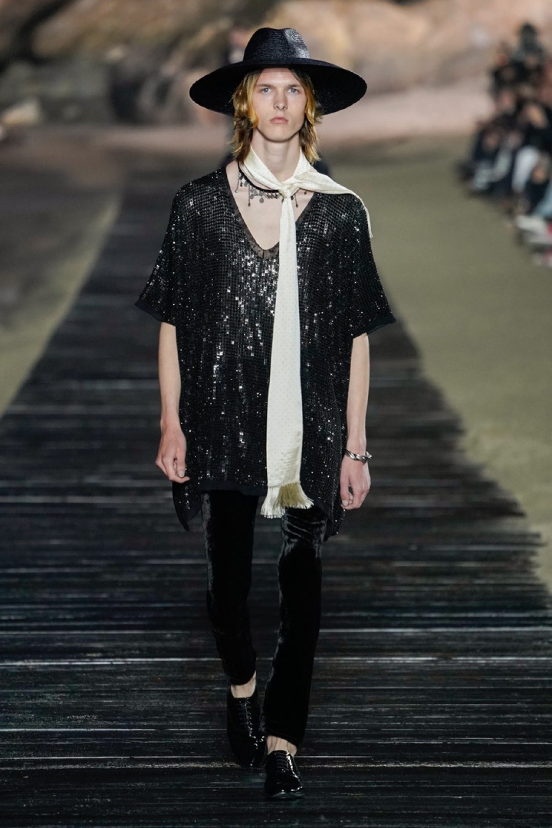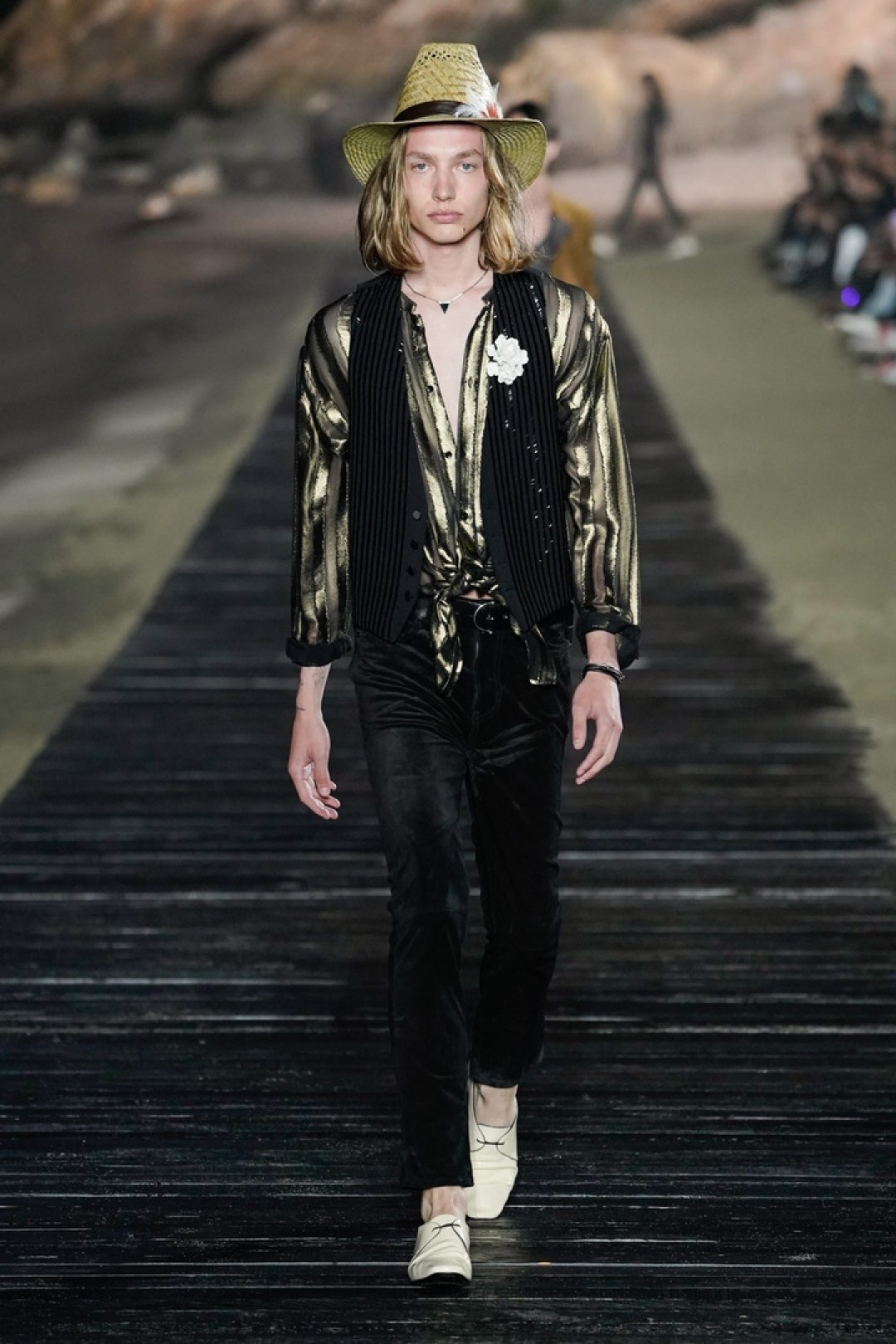 В мудборд коллекции Антони Ваккарелло легли Марракеш 1970-х годов, перенесенный в современный Лос-Анджелес (место силы Ива Сен-Лорана можно узнать по плетеным шляпам, рубашкам-джеллабам и кафтанам с завязками-кисточками), а также сценические костюмы Мика Джаггера из тура The Rolling Stones 1975 года (по их образу и подобию были сделаны полупрозрачные футболки, бархатные брюки и полосатые пиджаки).