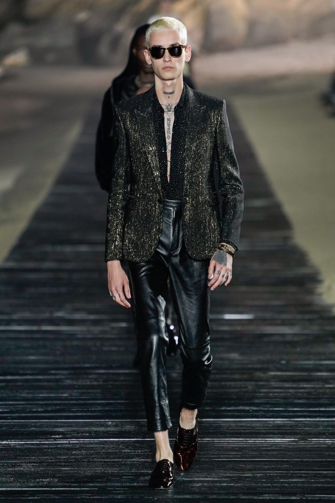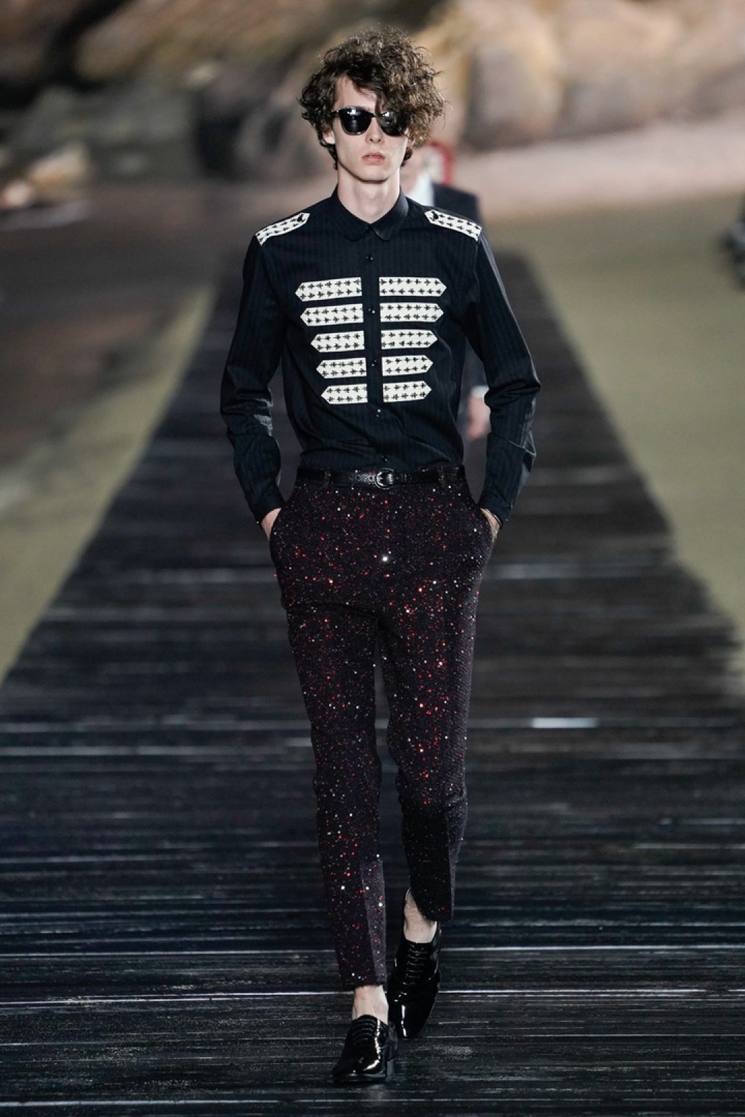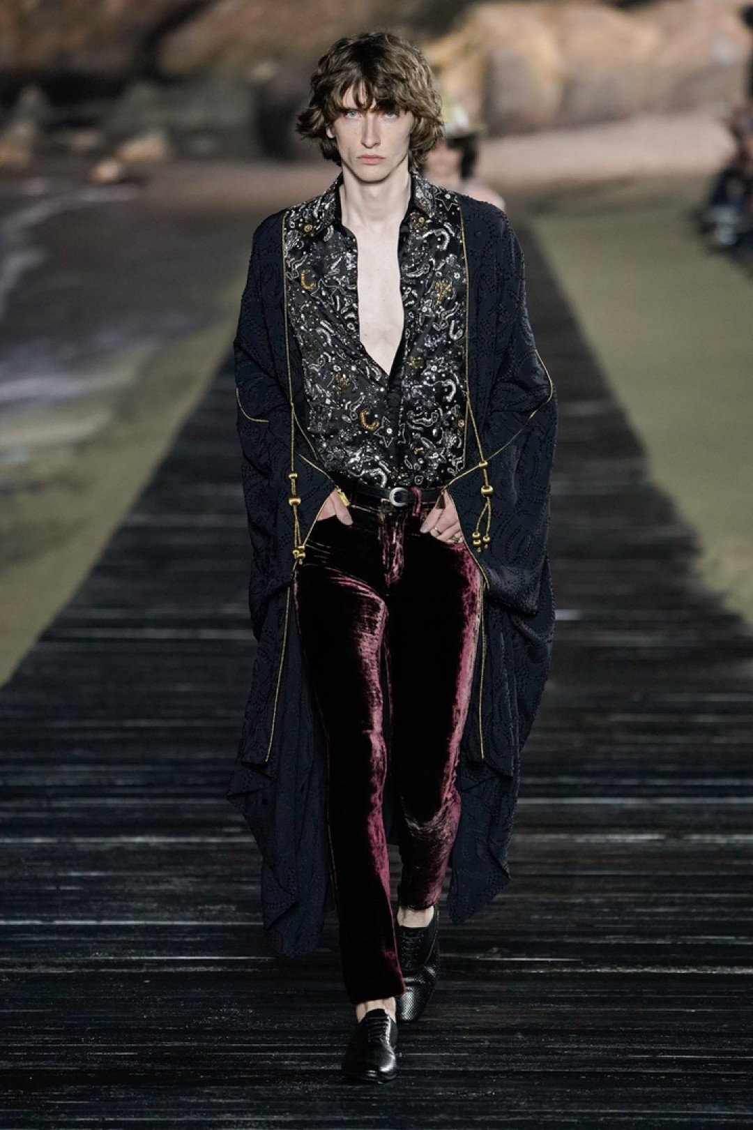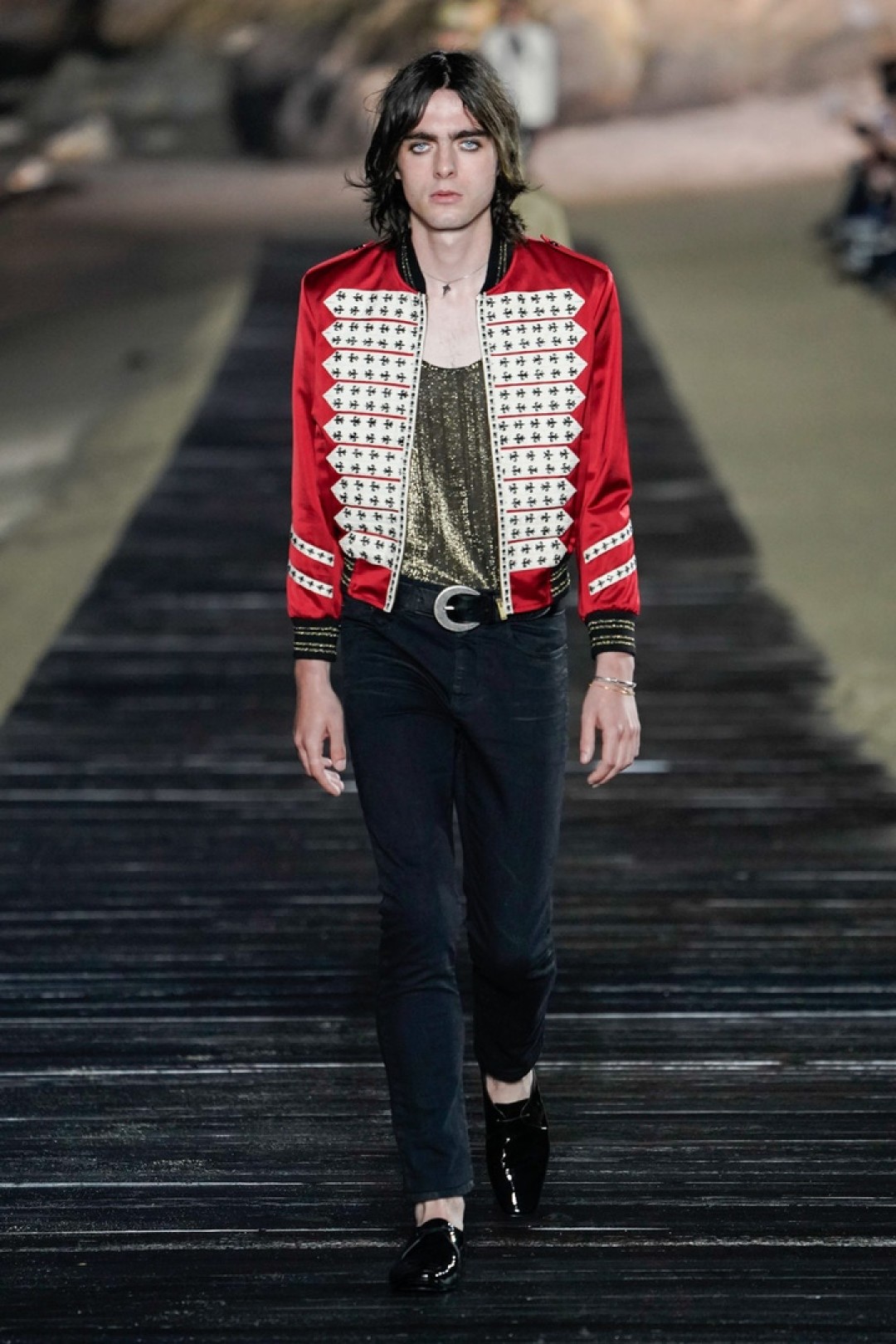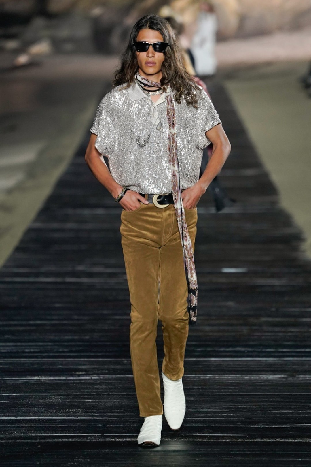 В мудборд коллекции Антони Ваккарелло легли Марракеш 1970-х годов, перенесенный в современный Лос-Анджелес (место силы Ива Сен-Лорана можно узнать по плетеным шляпам, рубашкам-джеллабам и кафтанам с завязками-кисточками), а также сценические костюмы Мика Джаггера из тура The Rolling Stones 1975 года (по их образу и подобию были сделаны полупрозрачные футболки, бархатные брюки и полосатые пиджаки).