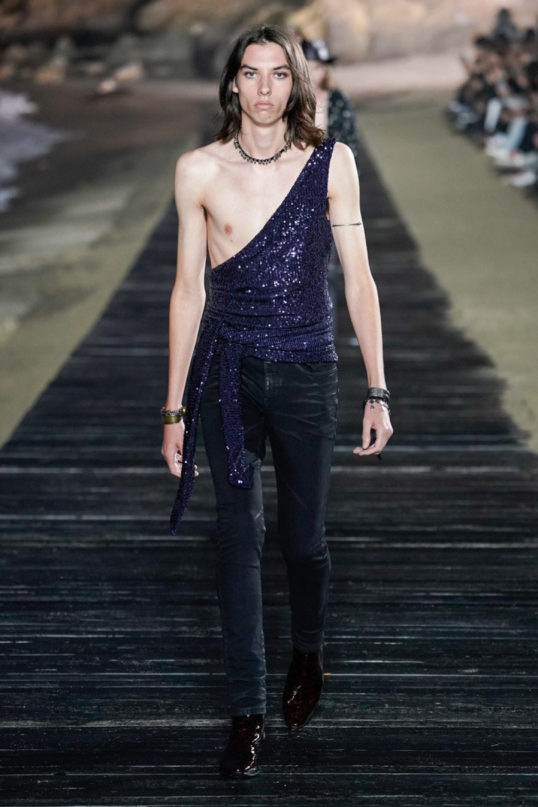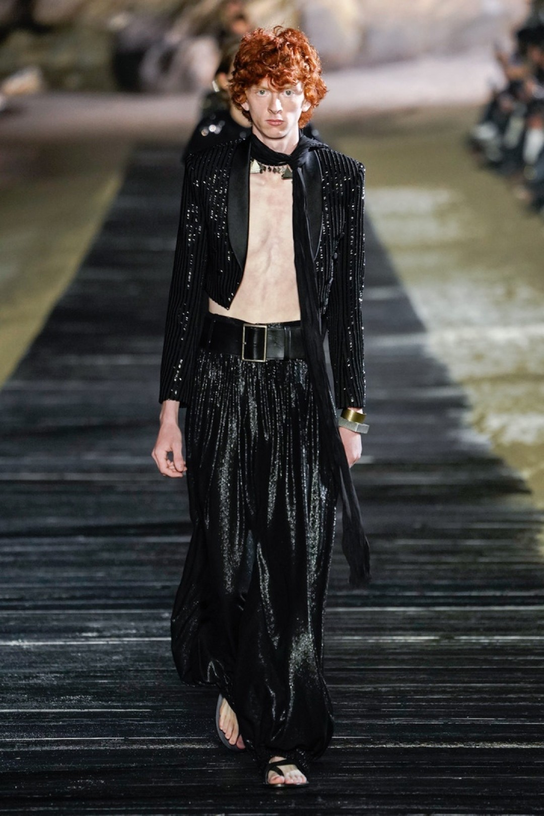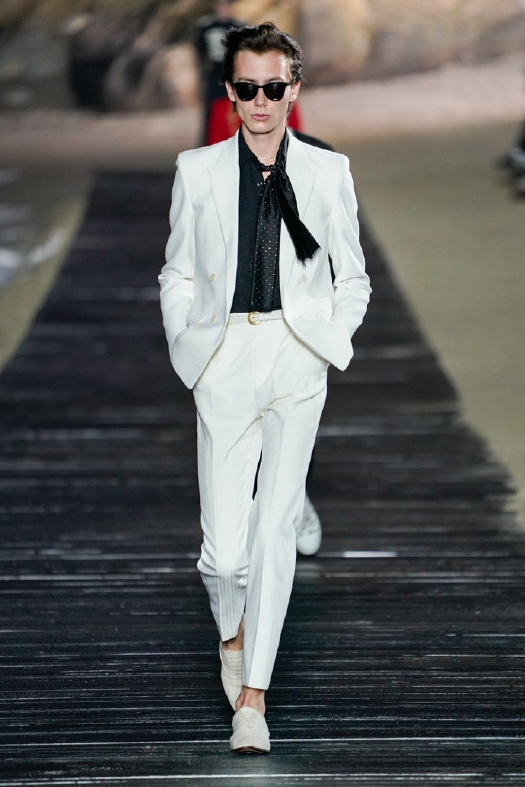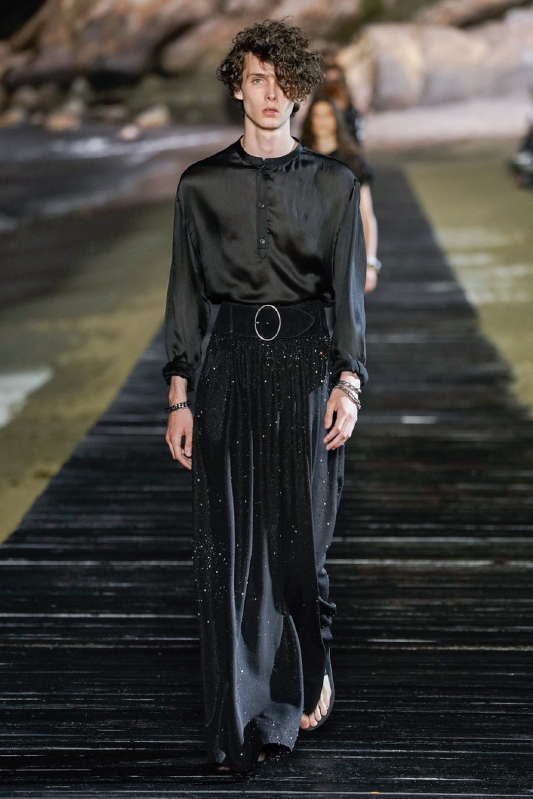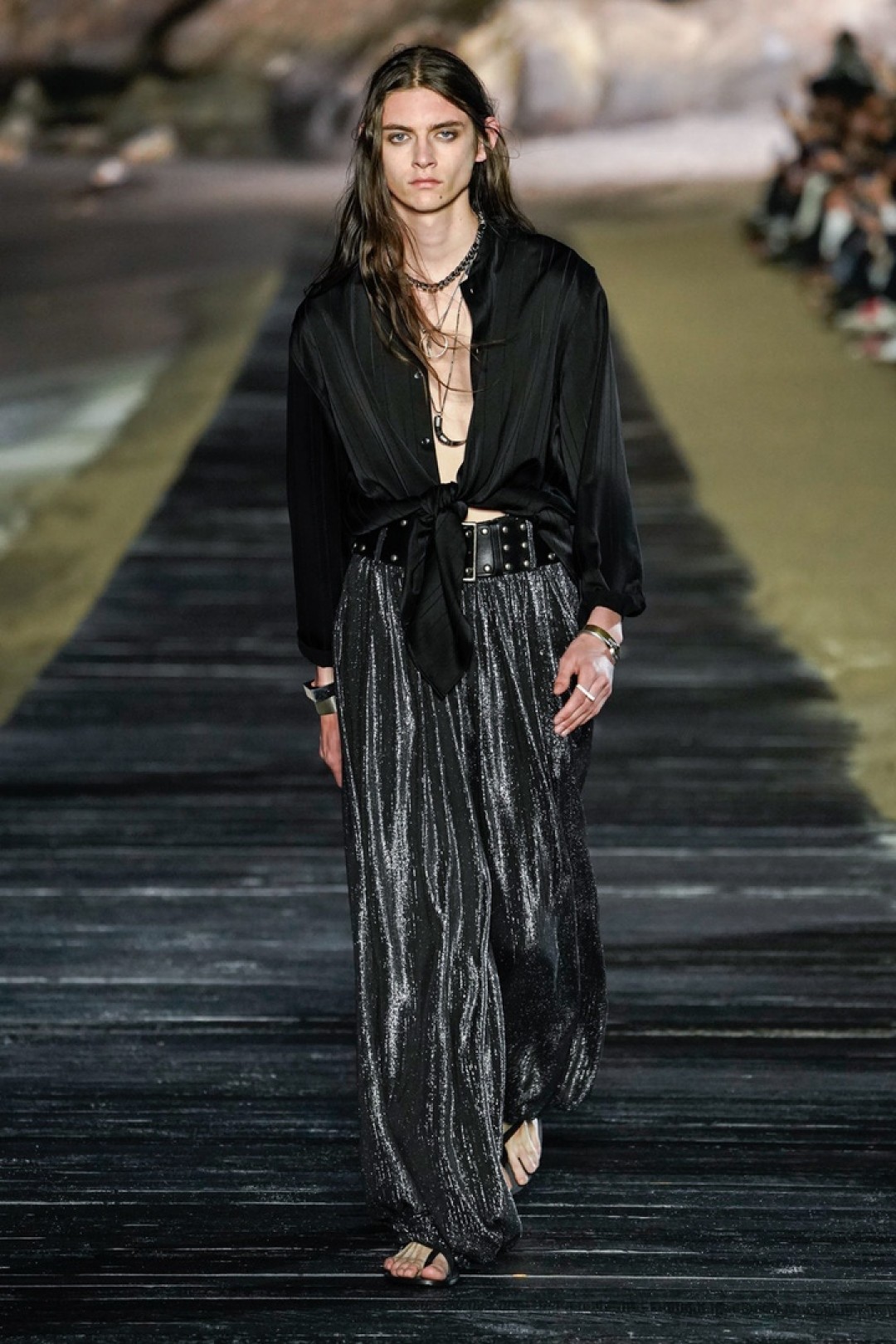 Показ мужской коллекции Saint Laurent, недавно прошедший на пляже в Малибу, объединил в себе все, что нужно модникам этим летом. Причем и парням, и девушкам: в линейку вошли приталенные костюмы, блестящие топы, укороченные жакеты, блузы свободного кроя и плиссированные юбки в пол.