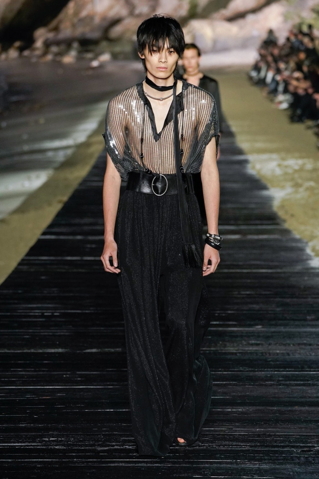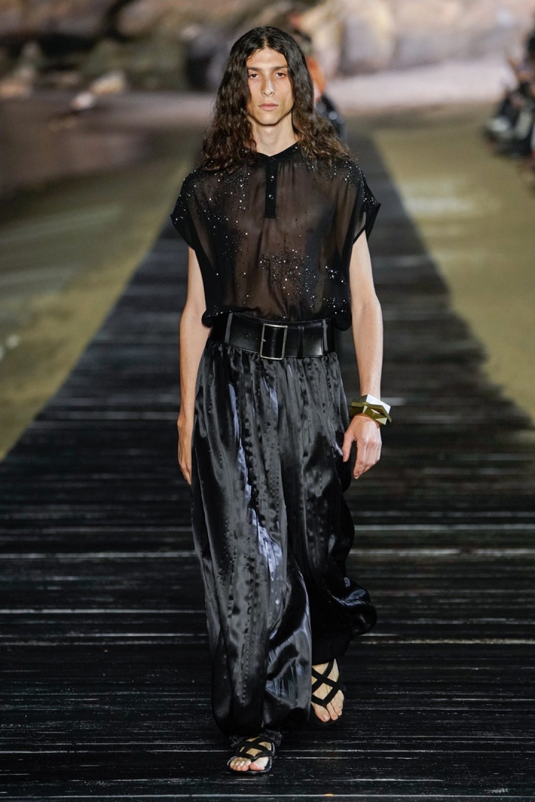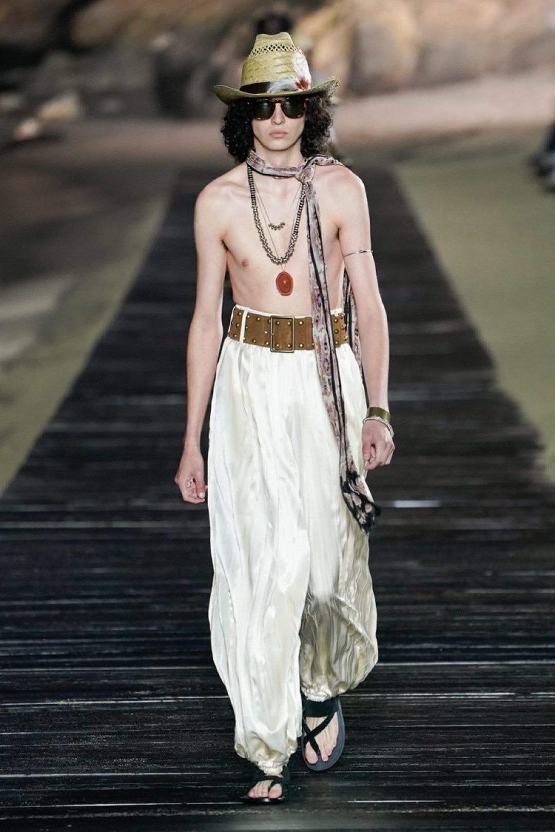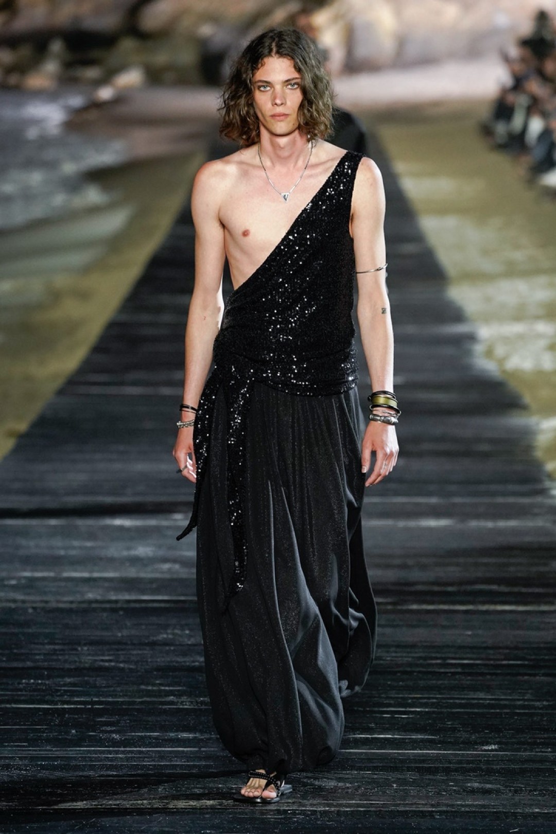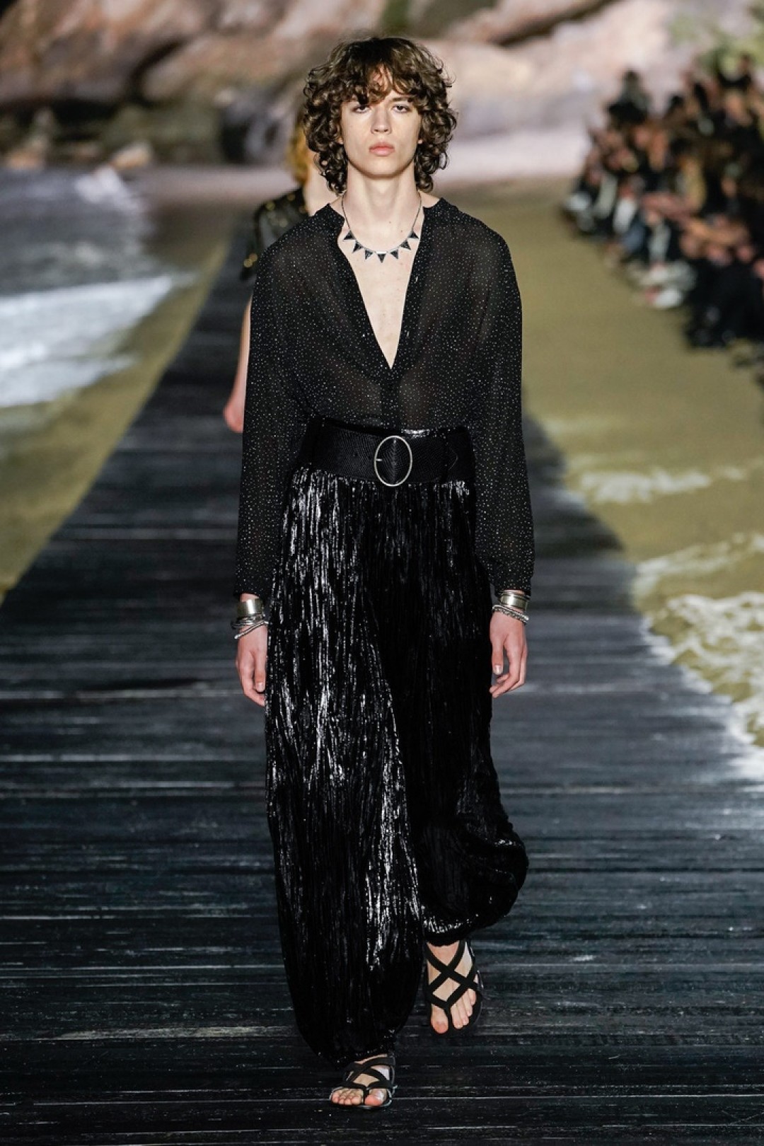 Показ мужской коллекции Saint Laurent, недавно прошедший на пляже в Малибу, объединил в себе все, что нужно модникам этим летом. Причем и парням, и девушкам: в линейку вошли приталенные костюмы, блестящие топы, укороченные жакеты, блузы свободного кроя и плиссированные юбки в пол.