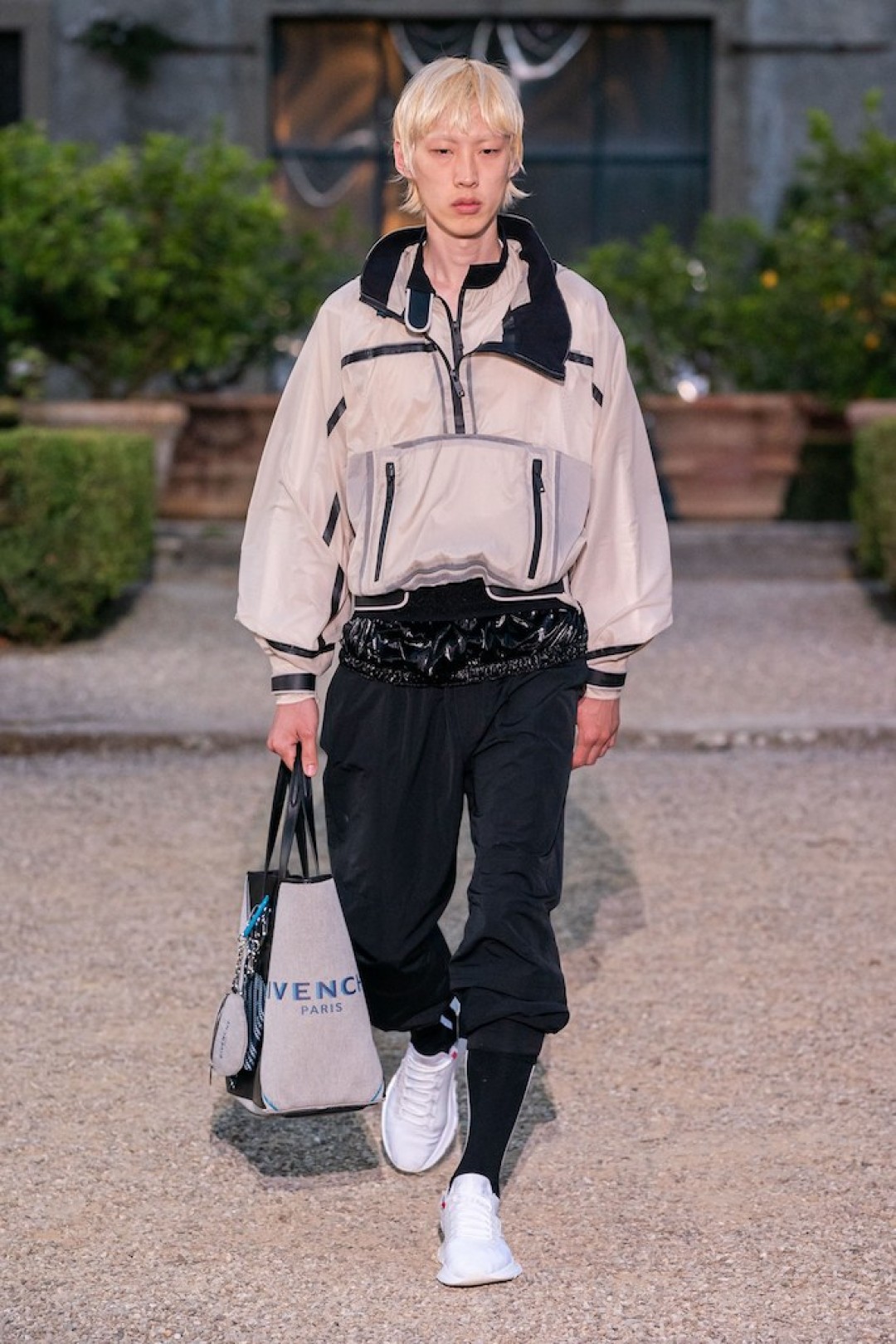 На шоу практически не было виниловых плащей, оверсайзовых пуховиков, пиджаков, богато расшитых пайетками, и костюмов, стирающих границы между «мужским» и «женским», которые Клэр показала в лукбуке осенне-зимней коллекции Givenchy. Вместо них — дождевики цвета индиго, джемперы с цветочным принтом, сумки-баулы с логотипом бренда и разноцветные кроссовки практически во всех образах, стилизованных жемчужными сережками, но больше напоминающих эстетику Вирджила Абло.