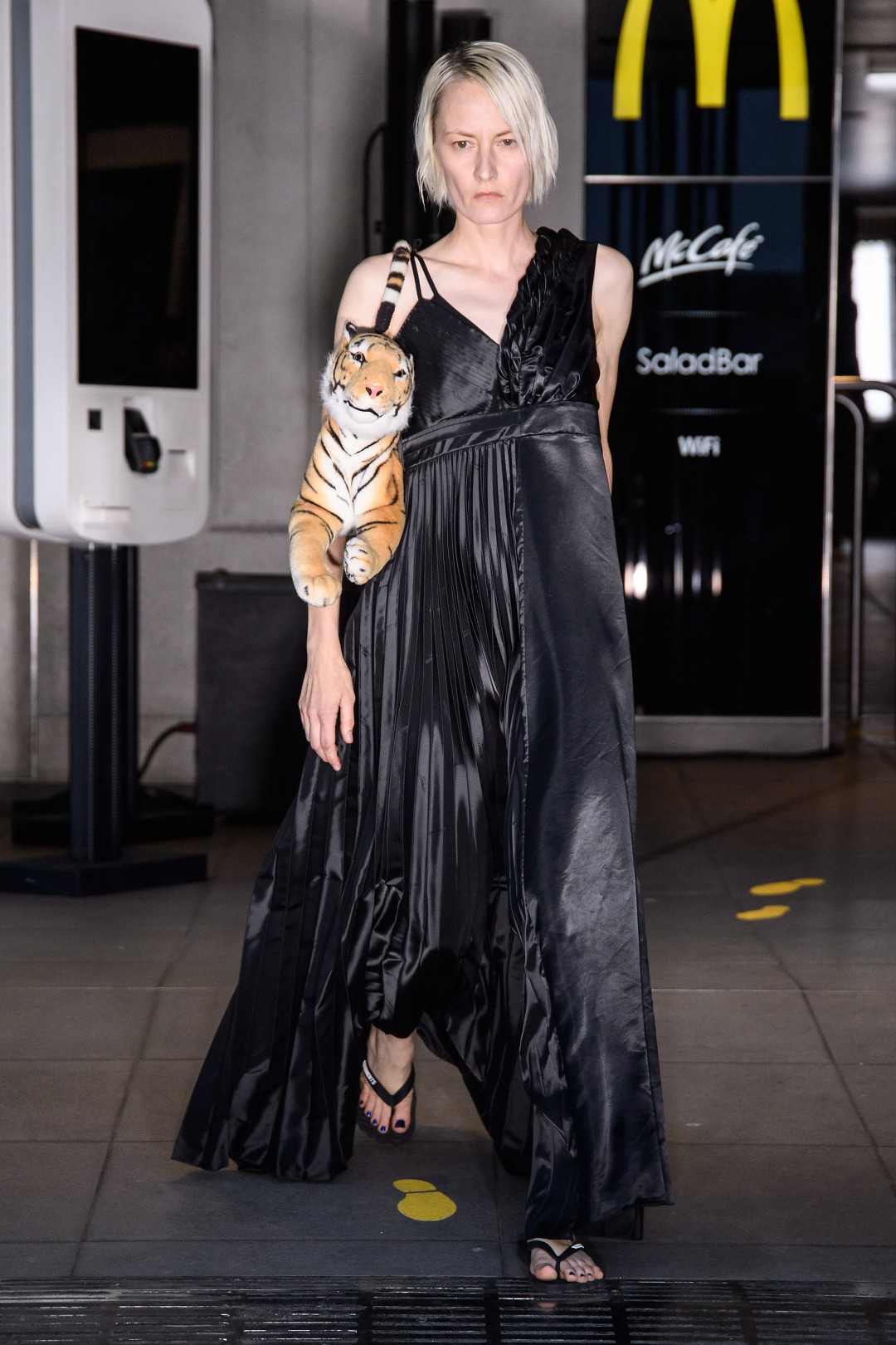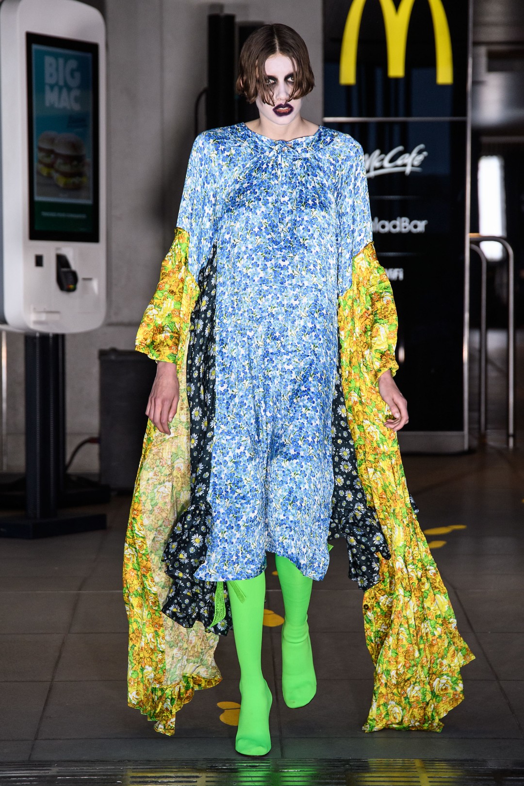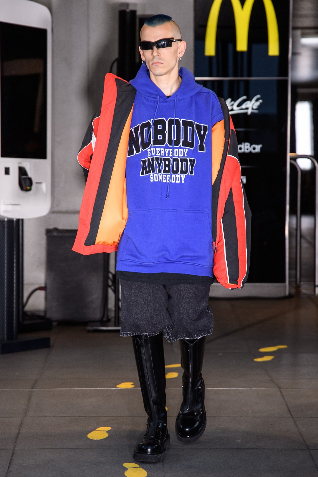 Вчера в одном из парижских «Макдональдсов» прошел показ весенне-летней коллекции Vetements. Модели перевоплотились в сотрудников и посетителей ресторана быстрого питания: невыспавшегося полицейского (в соответствующей экипировке), простого первокурсника (в рубашке, велосипедках и с AirPods), типичного айтишника (в футболке с логотипом браузера Internet Explorer), освобожденного преступника (в оранжевом комбинезоне с надписью «Капитализм») и даже сбежавшую невесту (в платье с фатой и рюшами).