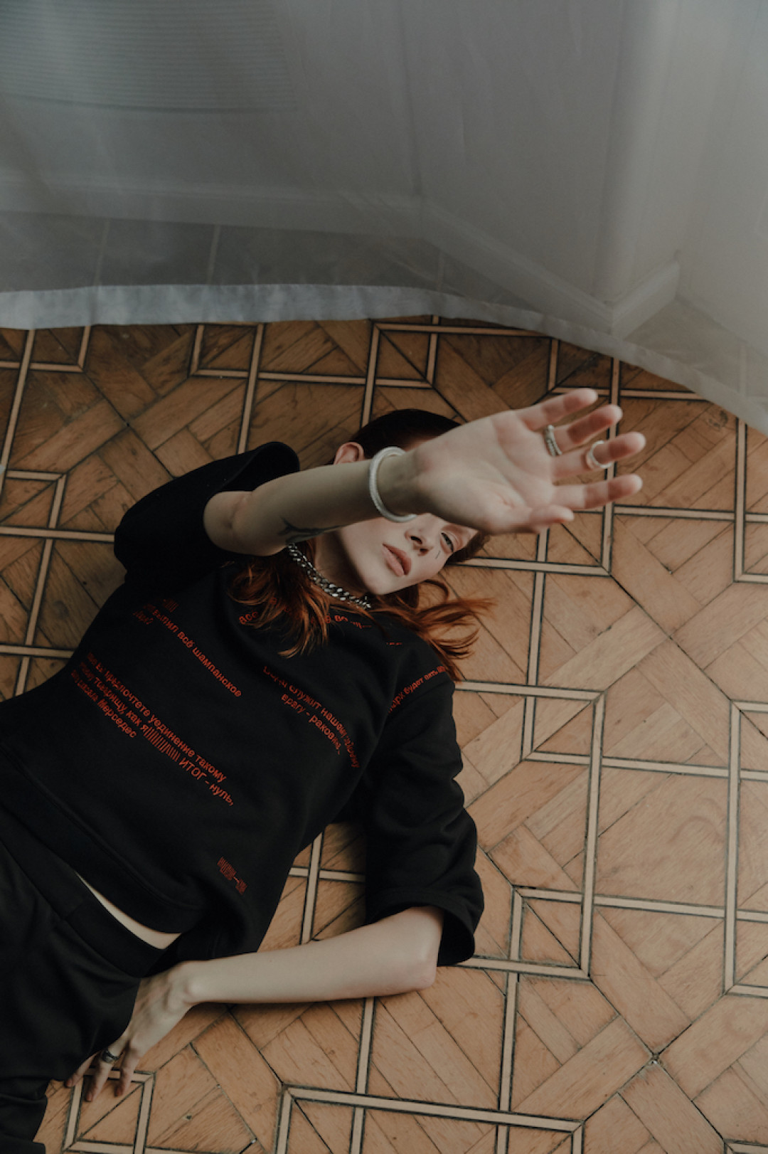 Принты я тоже придумала сама, они представляют собой фразы, которые как бы замаскированы под камуфляжные пятна. Фразы — моя личная коллекция, которую собираю уже много лет. Там есть и что-то из наших приколов с друзьями, и фразы из книг, которые запали мне в душу, и какие-то предложения из театральных программок».
