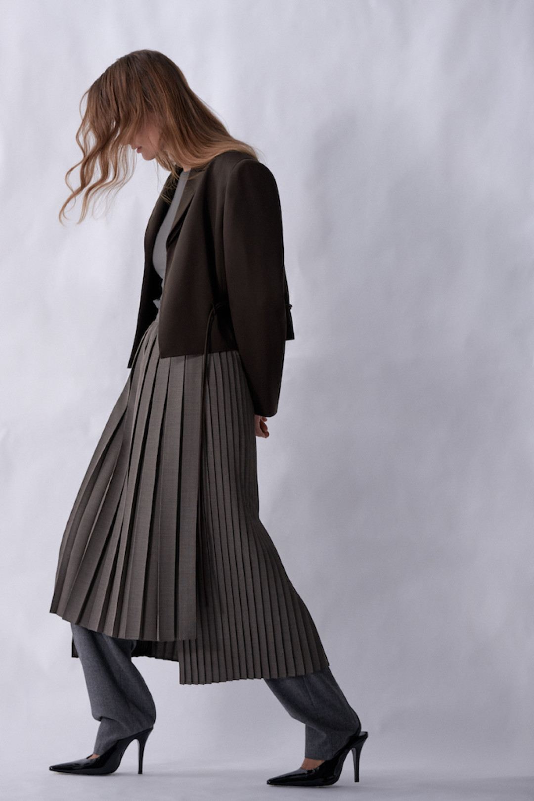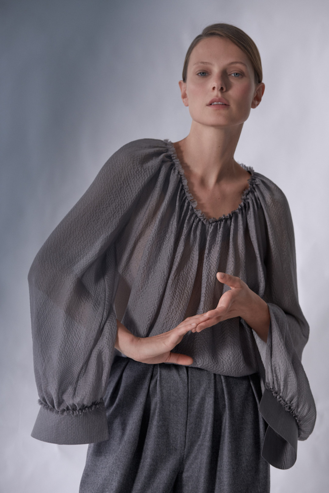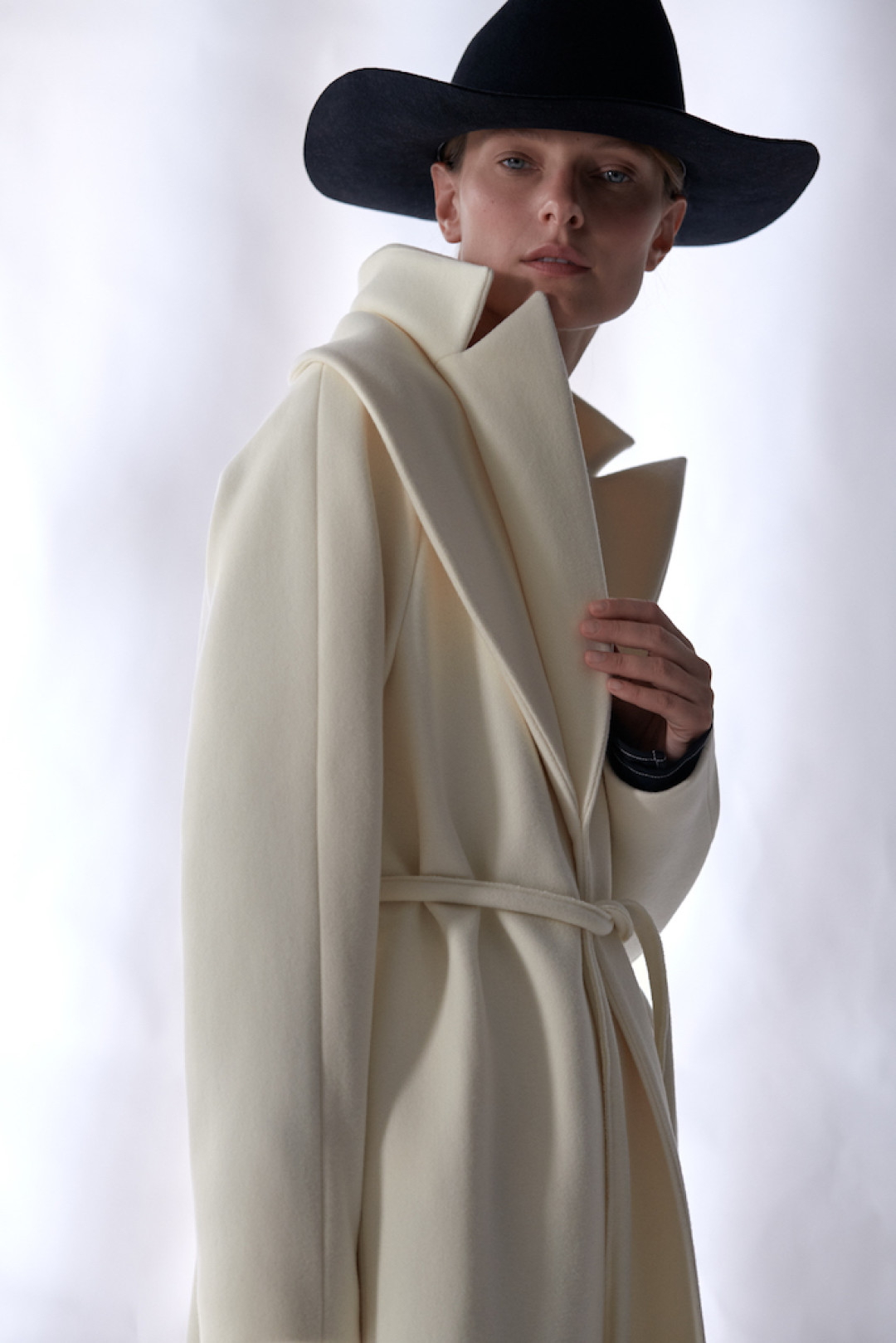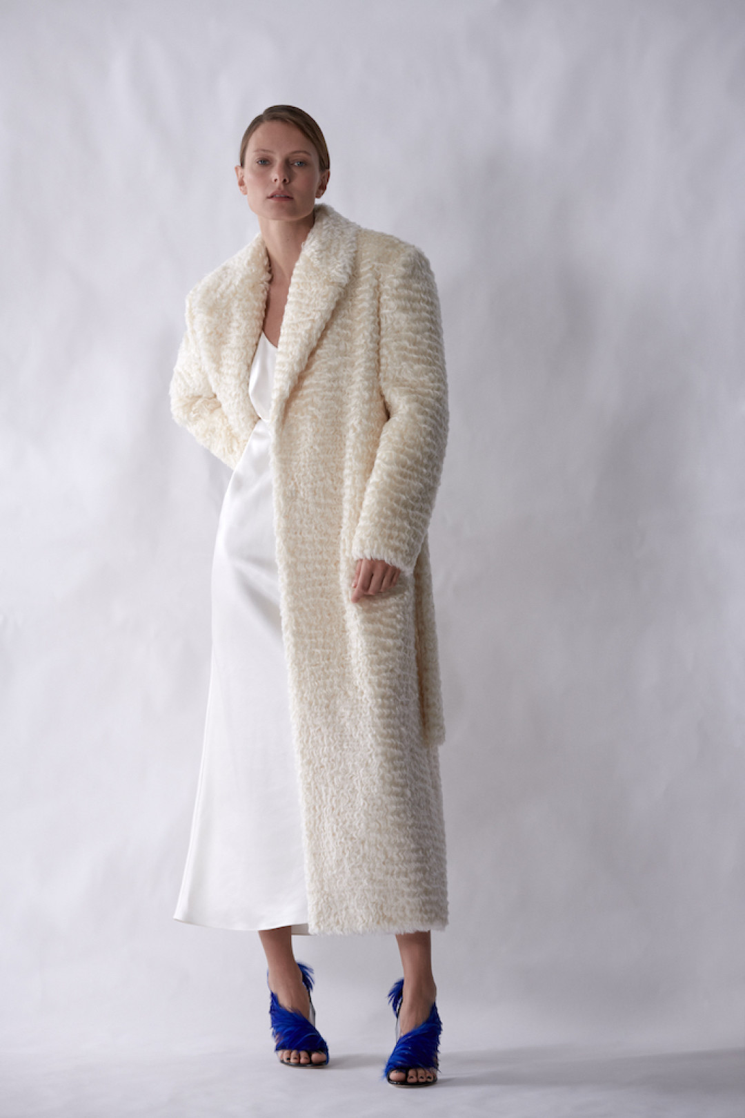 У каких российских дизайнеров искать одежду в стиле «старого Celine»? У Анны Андриенко и Натальи Бузаковой из osome2some! Мало того, что девушки делают отличные лаконичные вещи (только посмотрите на разноуровневую плиссированную юбку, «деформированный» оверсайзовый жакет и белоснежное платье с чашками-бюстье, которое может сойти за свадебное), так еще и мастерски конструируют верхнюю одежду! В их осенне-зимней коллекции — минималистичные пальто с двойным воротником, на одной пуговице и превращенное в домашний халат, а также шуба бежевого цвета, выполненная из верблюжьей шерсти и шелка.