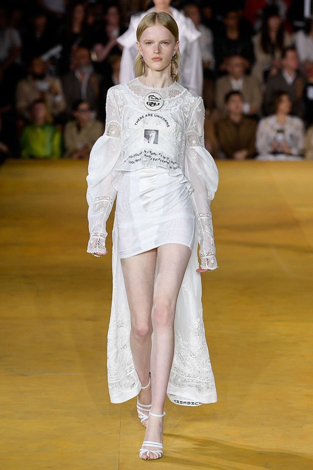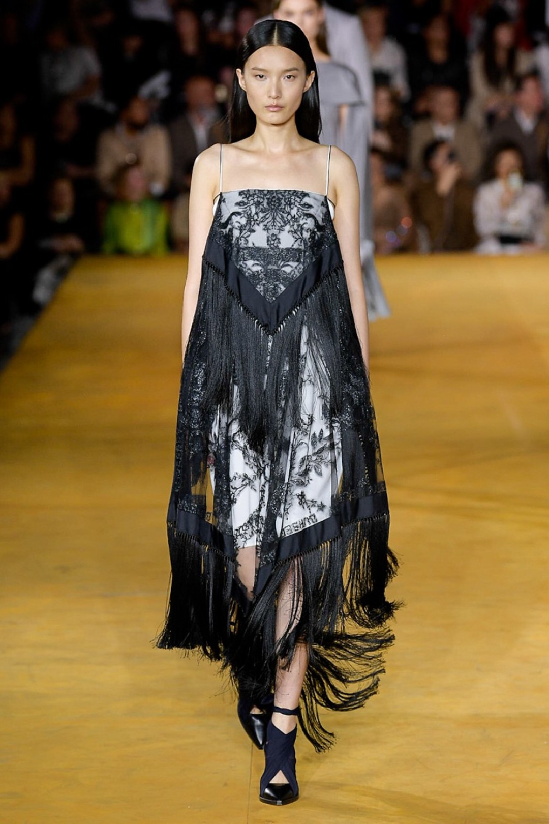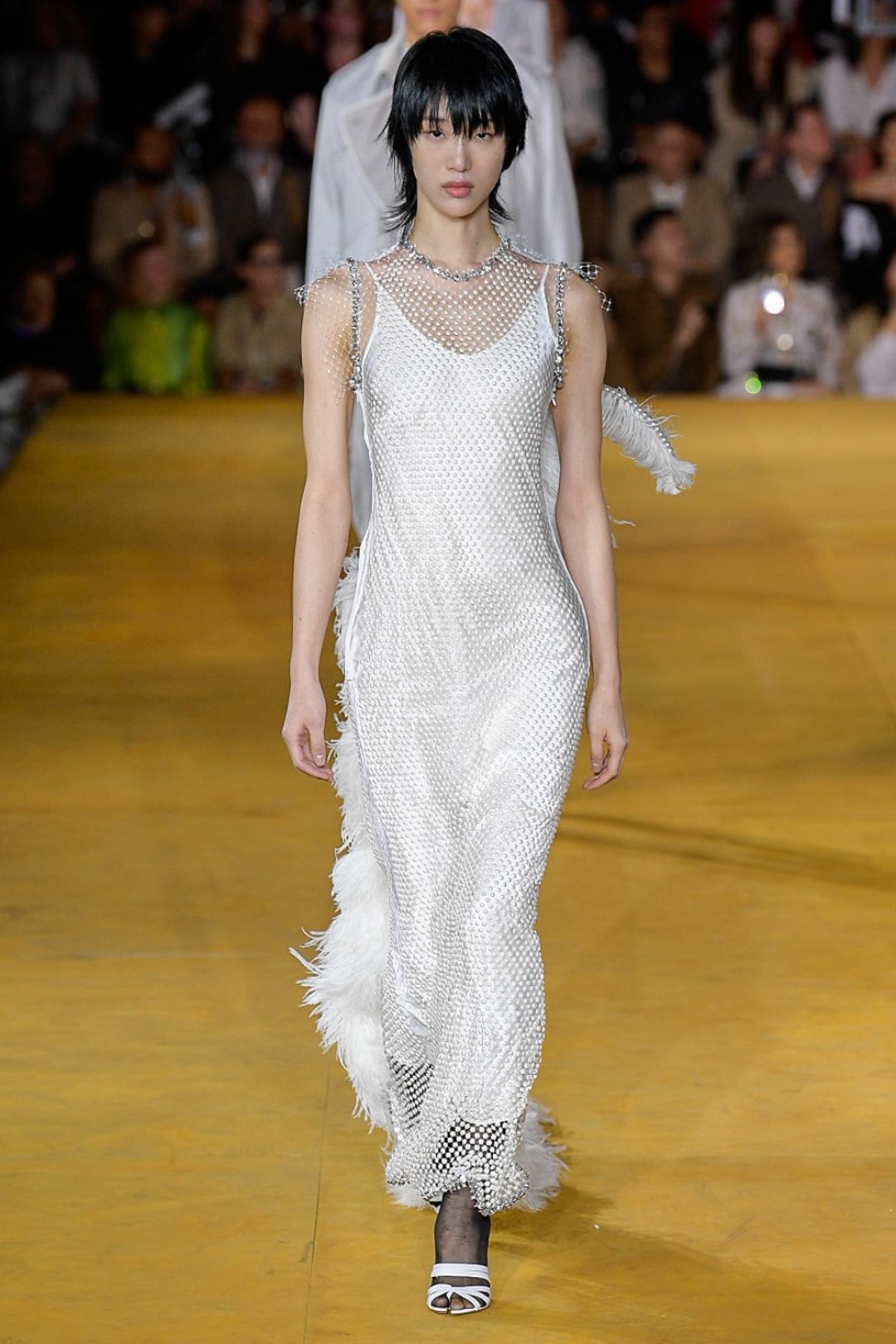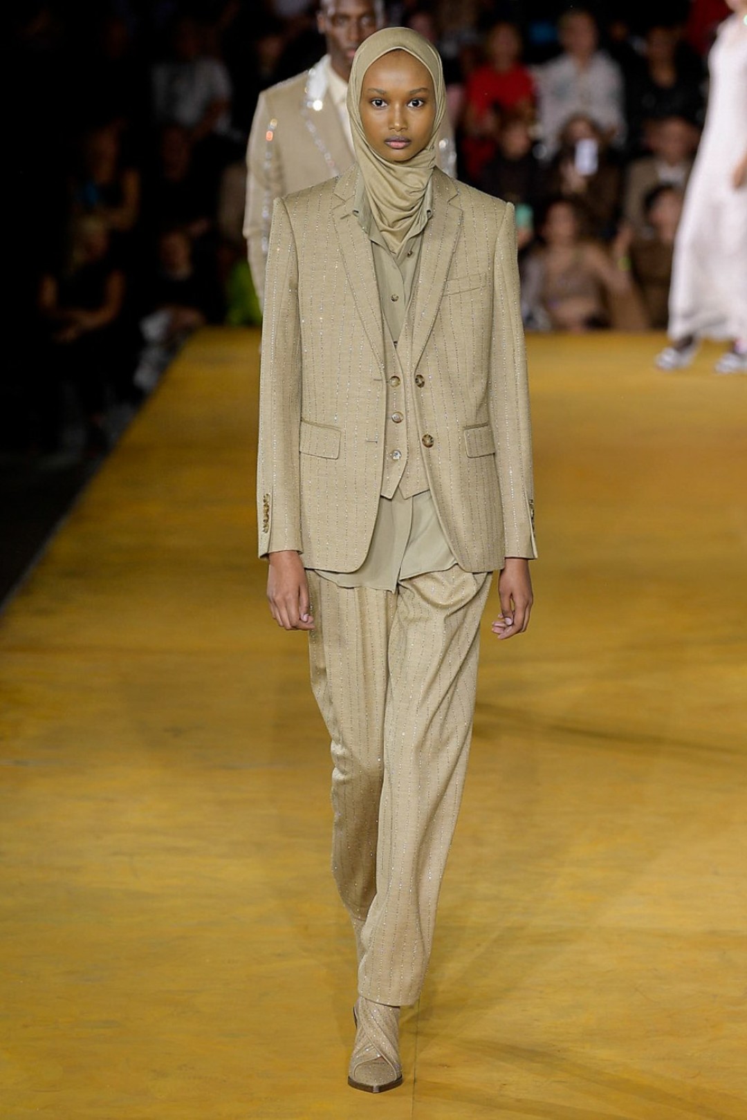 Кружевные платья с рюшами здесь украшены фотопринтами с изображением лебедей, головные уборы, как из сериала «Рассказ служанки» (похожие были в коллекции Louis Vuitton сезона весна-лето 2019), стилизуют оверсайзовые футболки, а платья с рисунками, напоминающими набивки старинных ширм, дополнены остроносыми кожаными туфлями. Однако о встрече прошлого с будущим Рикардо Тиши говорит не только через одежду, но и через девушек, которые представляли ее на подиуме. Одной из них стала модель суданского происхождения Угбад Абди, которая вышла в костюме-тройке и хиджабе.