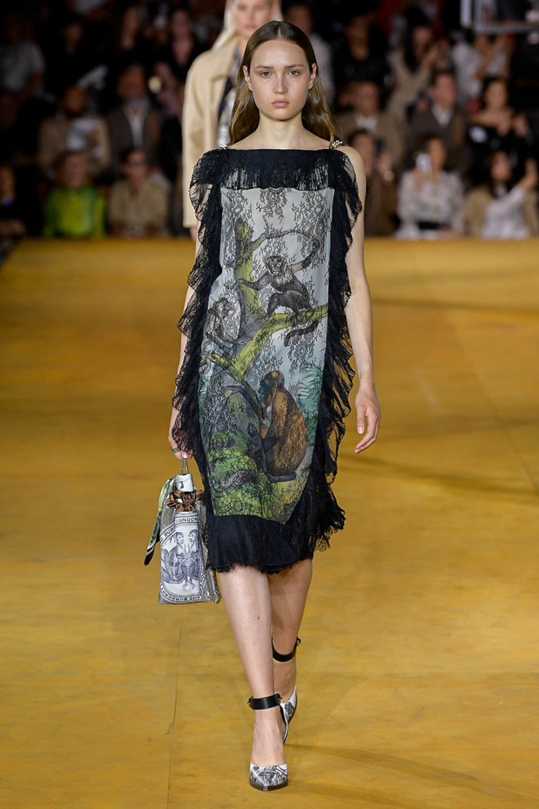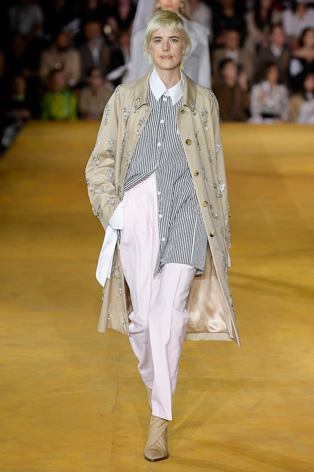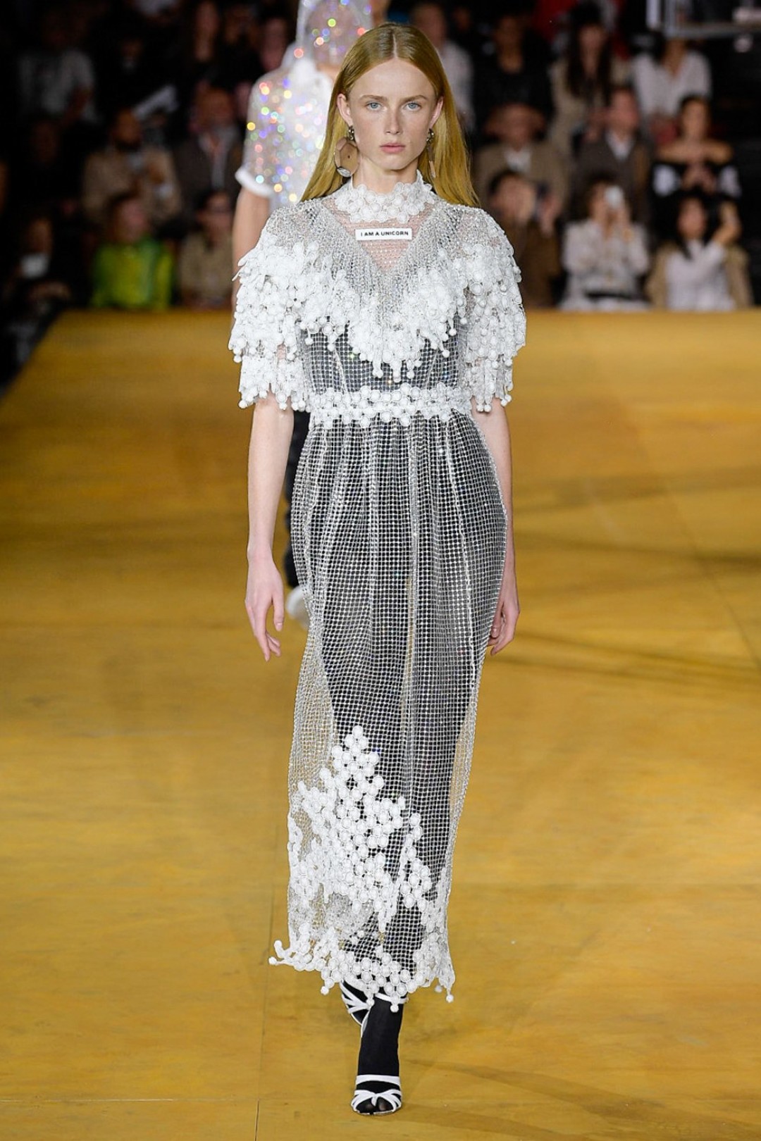 Кружевные платья с рюшами здесь украшены фотопринтами с изображением лебедей, головные уборы, как из сериала «Рассказ служанки» (похожие были в коллекции Louis Vuitton сезона весна-лето 2019), стилизуют оверсайзовые футболки, а платья с рисунками, напоминающими набивки старинных ширм, дополнены остроносыми кожаными туфлями. Однако о встрече прошлого с будущим Рикардо Тиши говорит не только через одежду, но и через девушек, которые представляли ее на подиуме. Одной из них стала модель суданского происхождения Угбад Абди, которая вышла в костюме-тройке и хиджабе.