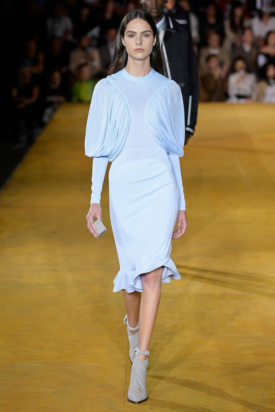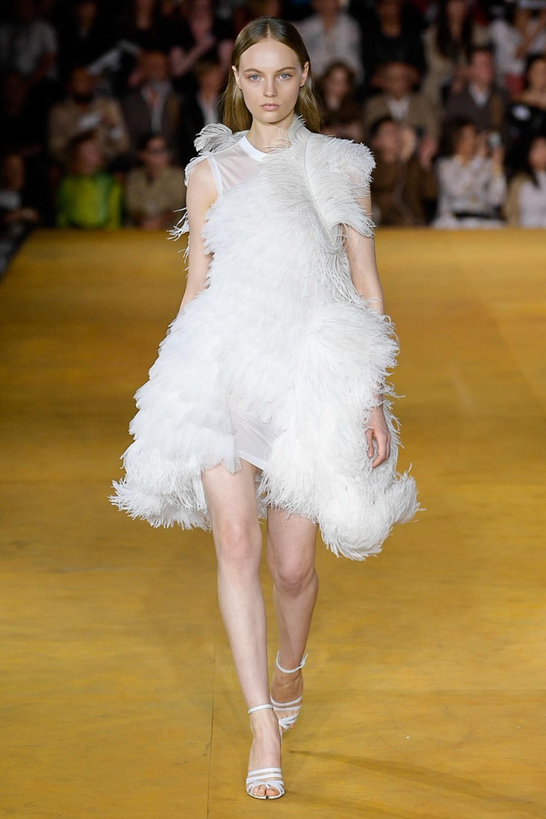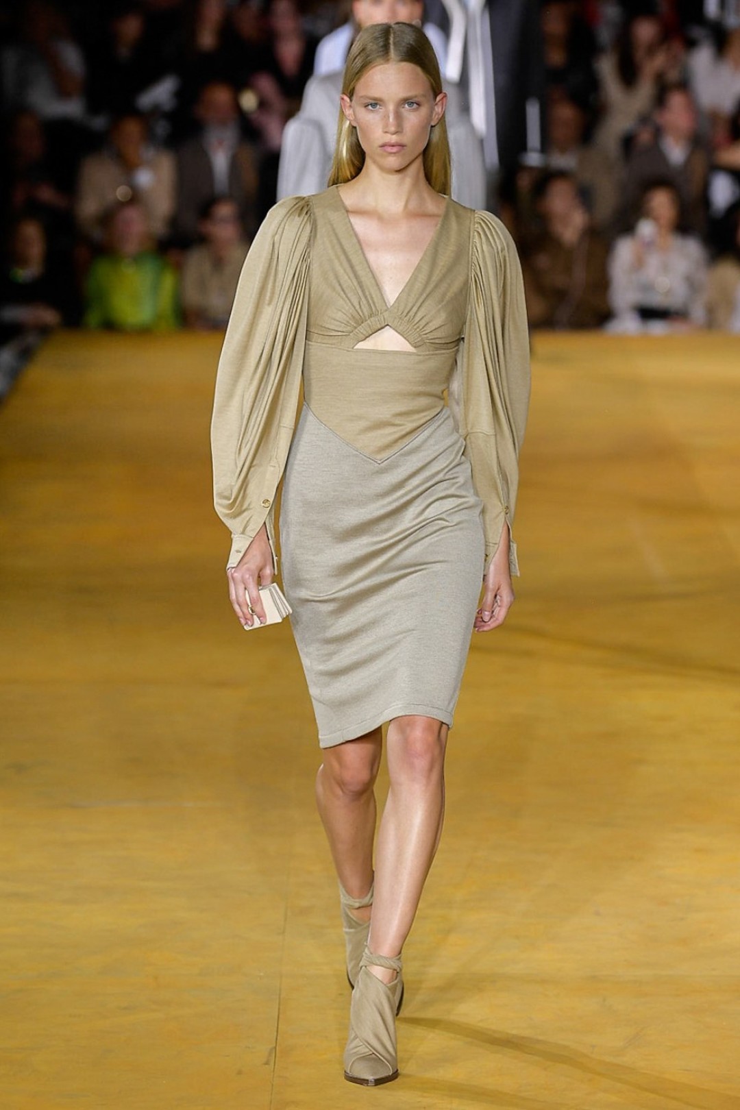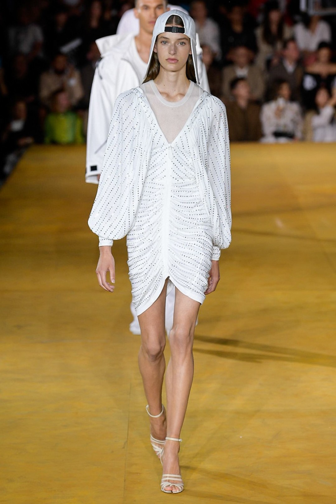 Кружевные платья с рюшами здесь украшены фотопринтами с изображением лебедей, головные уборы, как из сериала «Рассказ служанки» (похожие были в коллекции Louis Vuitton сезона весна-лето 2019), стилизуют оверсайзовые футболки, а платья с рисунками, напоминающими набивки старинных ширм, дополнены остроносыми кожаными туфлями. Однако о встрече прошлого с будущим Рикардо Тиши говорит не только через одежду, но и через девушек, которые представляли ее на подиуме. Одной из них стала модель суданского происхождения Угбад Абди, которая вышла в костюме-тройке и хиджабе.