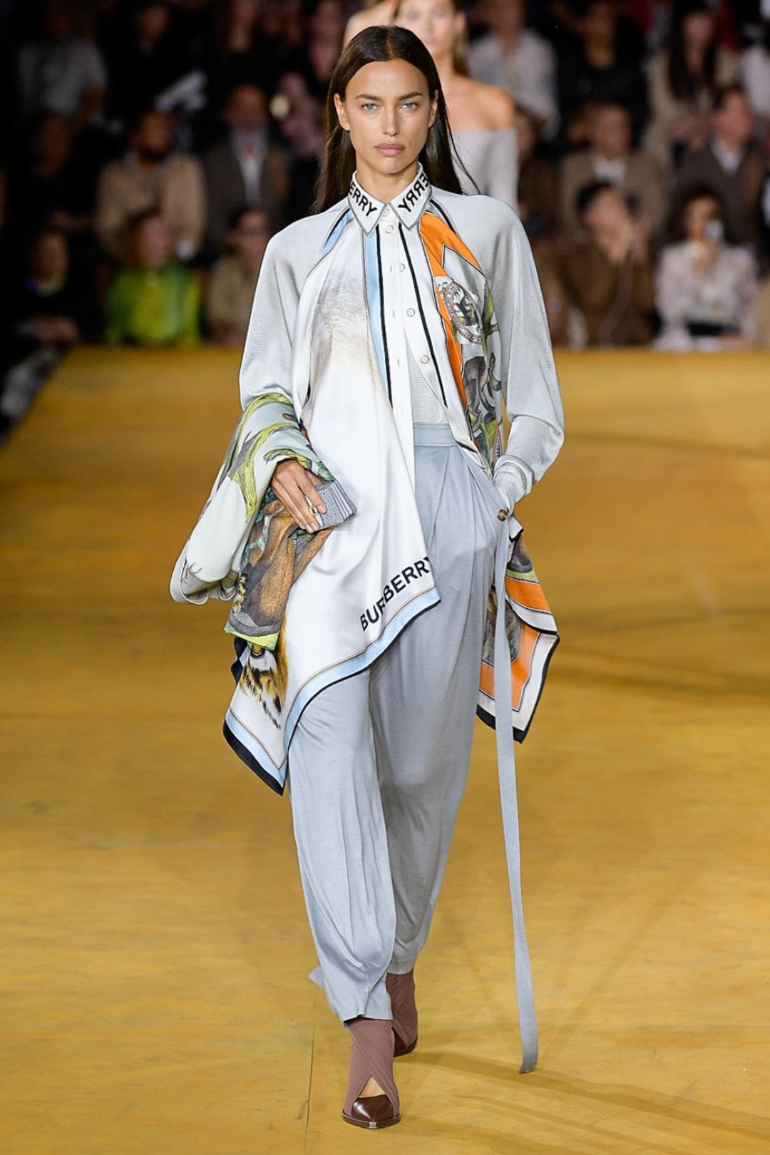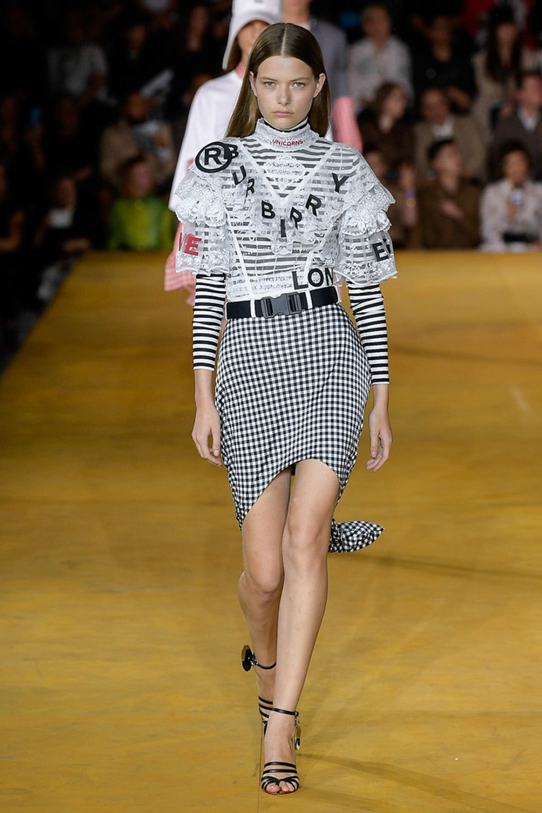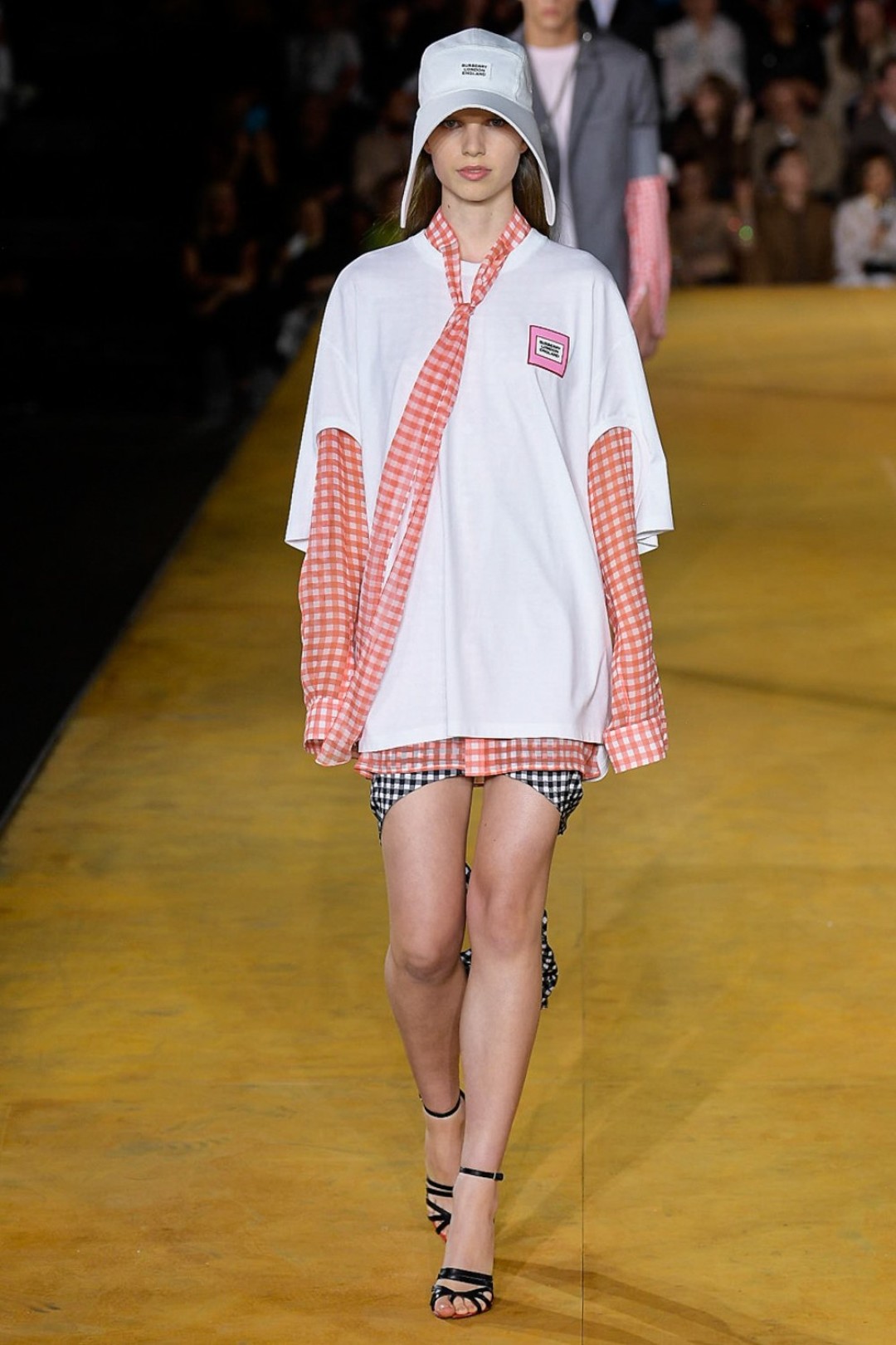 Если у креативного директора Louis Vuitton Николя Гескьера ретрофутуризм — это смесь викторианских платьев и свитшотов с изображением космических кораблей, то у дизайнера Burberry Рикардо Тиши — это синтез классических кодов полуторавекового бренда и форм, которые раньше в его контексте было невозможно представить. С приходом Рикардо у Burberry изменился логотип, появилась монограмма (и даже посвященная ей отдельная линия), а теперь практически исчезла фирменная клетка. Образы стали более монохромными и минималистичными, а клетка если и появляется в качестве принта на одежде, то уже в совершенно других размерах и цветах (обратите внимание на рубашки, торчащие из-под футболок, и мини-юбки на кулисках).