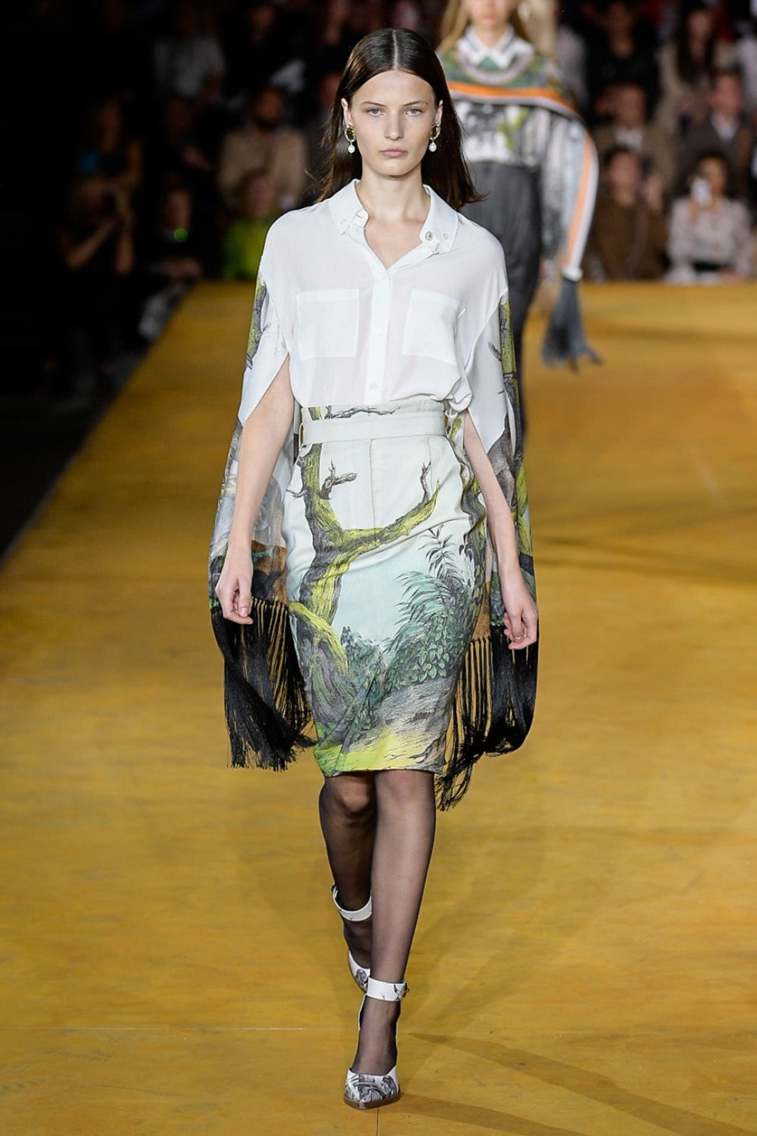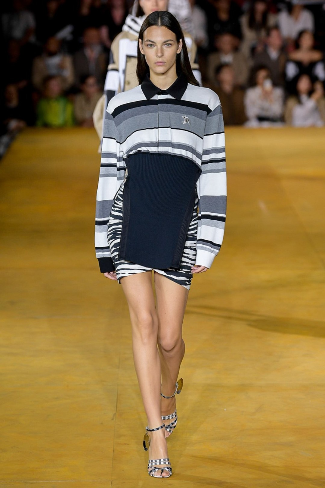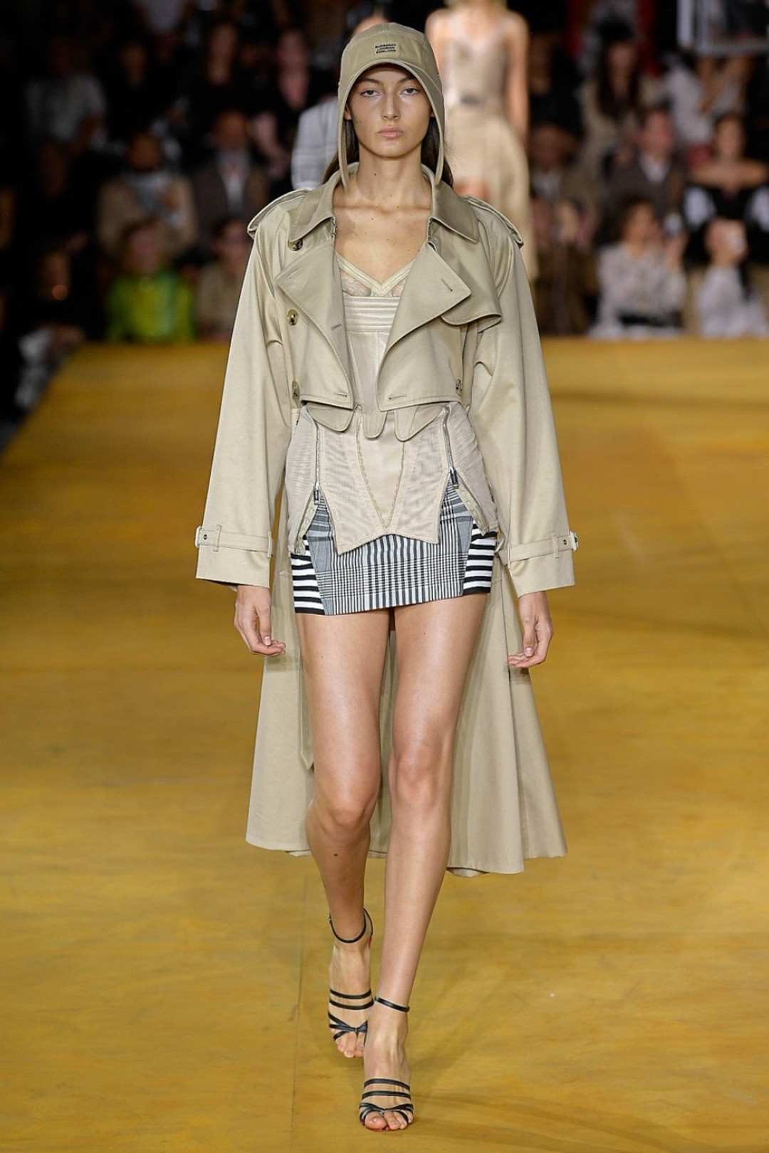 Если у креативного директора Louis Vuitton Николя Гескьера ретрофутуризм — это смесь викторианских платьев и свитшотов с изображением космических кораблей, то у дизайнера Burberry Рикардо Тиши — это синтез классических кодов полуторавекового бренда и форм, которые раньше в его контексте было невозможно представить. С приходом Рикардо у Burberry изменился логотип, появилась монограмма (и даже посвященная ей отдельная линия), а теперь практически исчезла фирменная клетка. Образы стали более монохромными и минималистичными, а клетка если и появляется в качестве принта на одежде, то уже в совершенно других размерах и цветах (обратите внимание на рубашки, торчащие из-под футболок, и мини-юбки на кулисках).