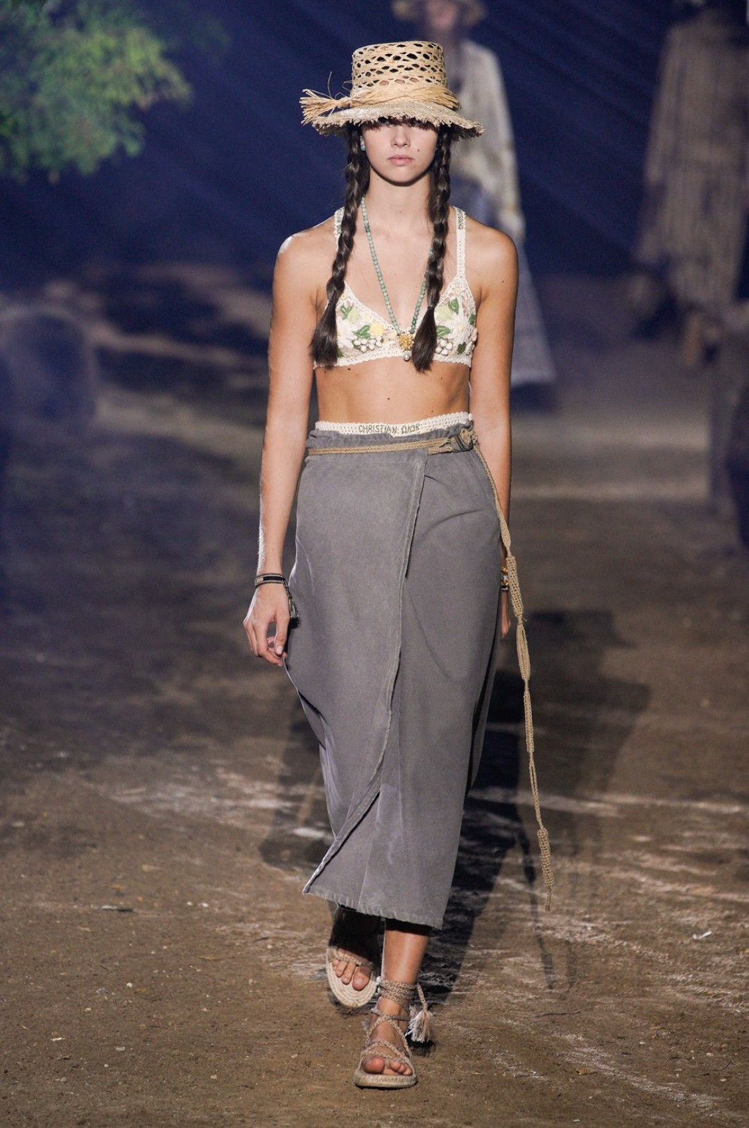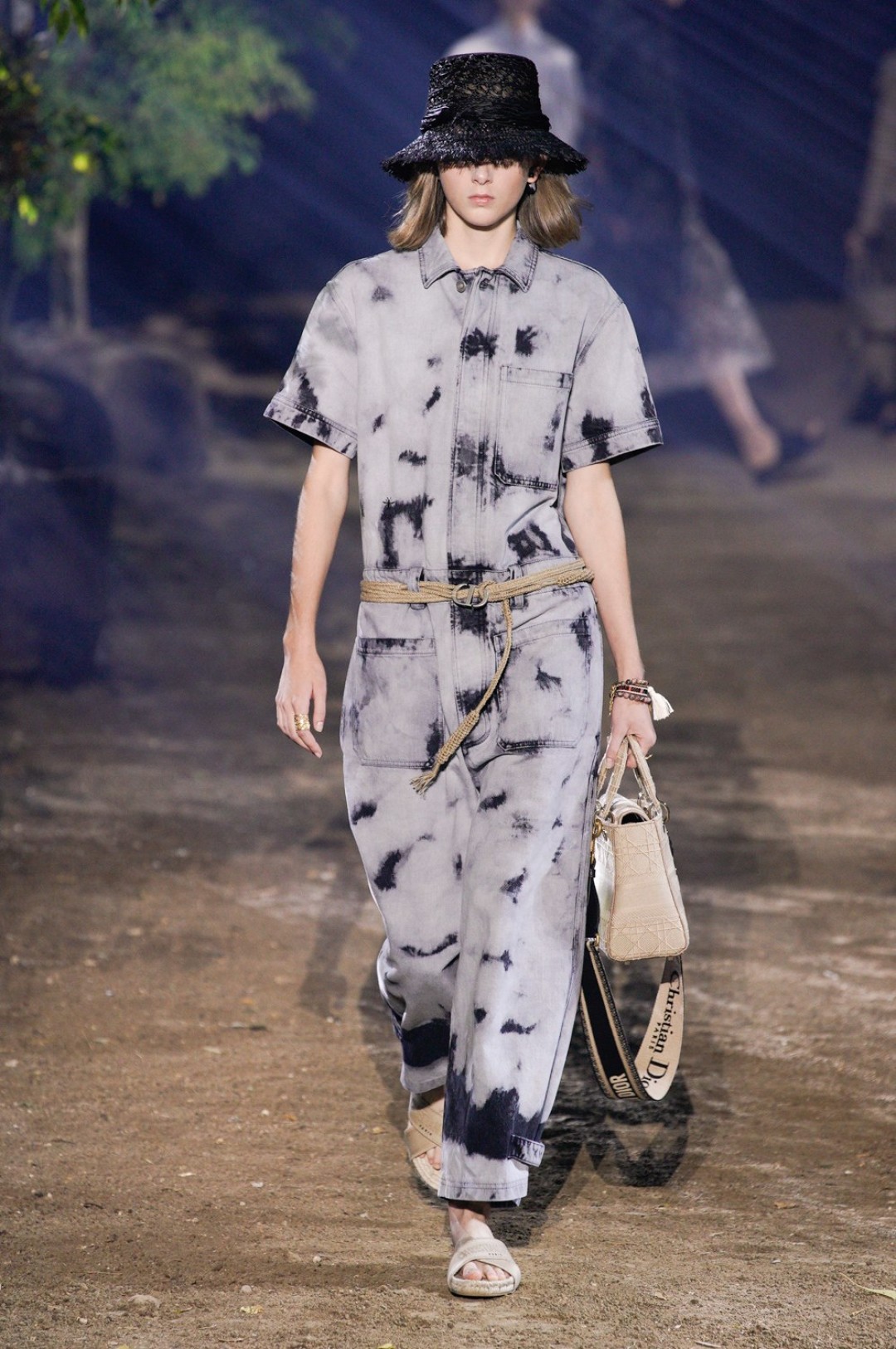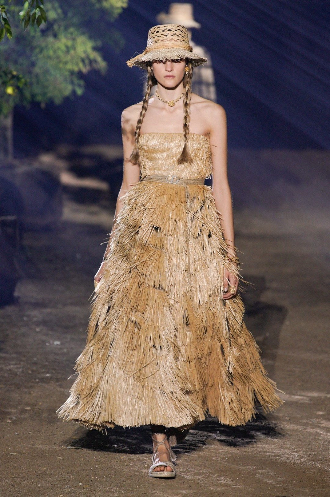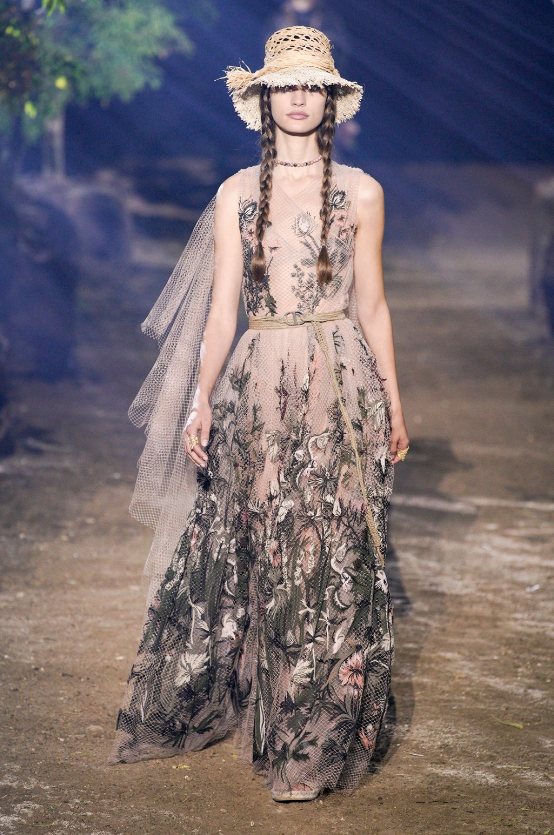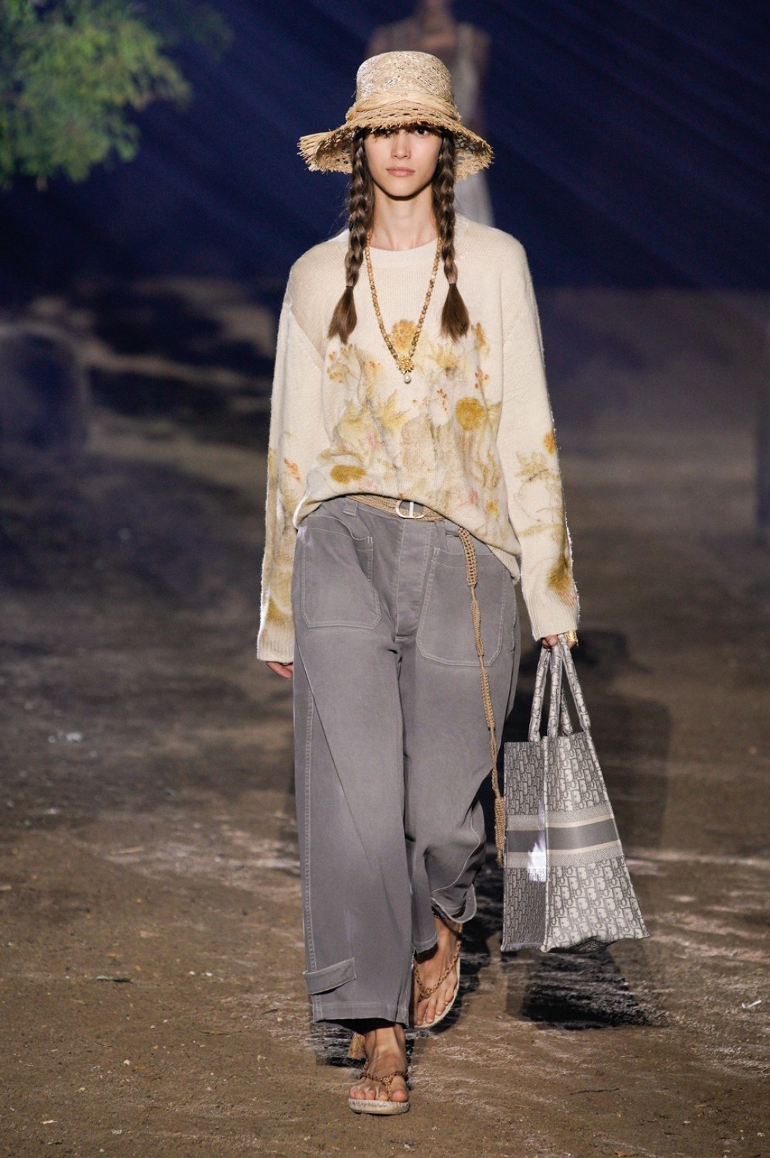 Многие вещи дополняли плетеные панамы, надетые на две косички, а также сетчатые перчатки и каучуковые сапоги. Именно в таком образе удобнее работать в цветочном саду, который к показу, кстати, тоже прилагался. По периметру ипподрома Longchamp, над сценографией которого работала студия ландшафтного дизайна Atelier Coloco, были расставлены 164 дерева — после весенне-летнего шоу их, по словам представителей Dior, высадят в разных районах Парижа.