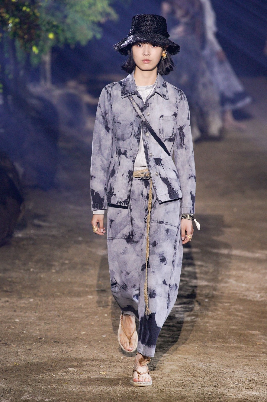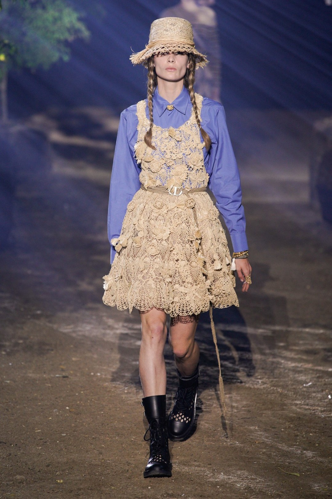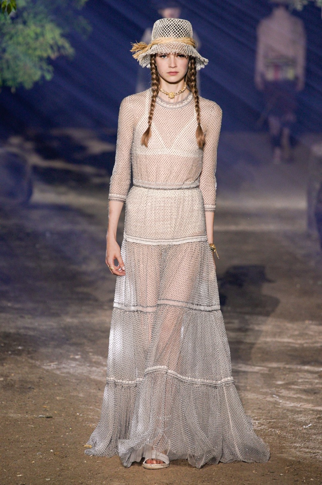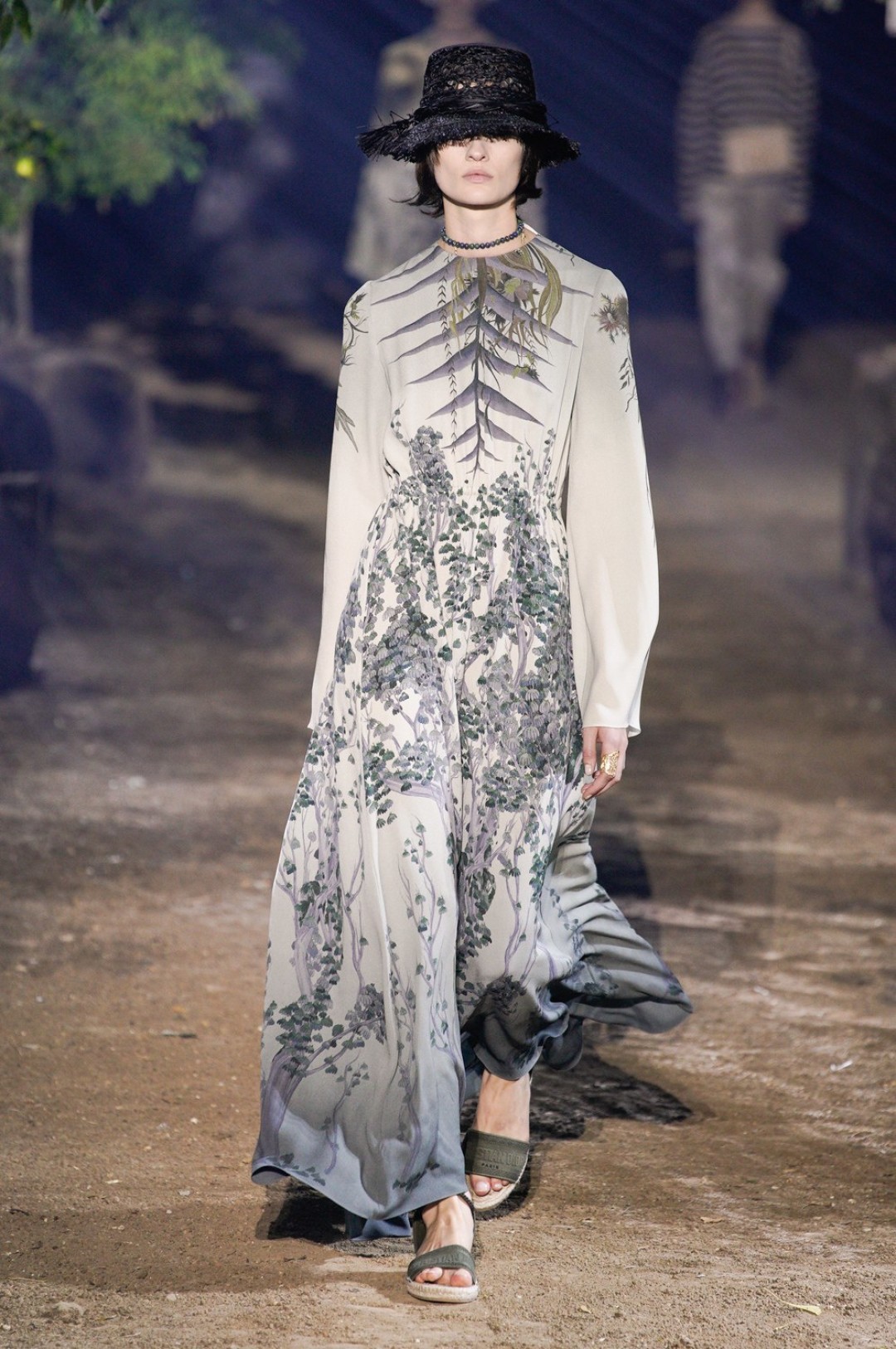 Многие вещи дополняли плетеные панамы, надетые на две косички, а также сетчатые перчатки и каучуковые сапоги. Именно в таком образе удобнее работать в цветочном саду, который к показу, кстати, тоже прилагался. По периметру ипподрома Longchamp, над сценографией которого работала студия ландшафтного дизайна Atelier Coloco, были расставлены 164 дерева — после весенне-летнего шоу их, по словам представителей Dior, высадят в разных районах Парижа.