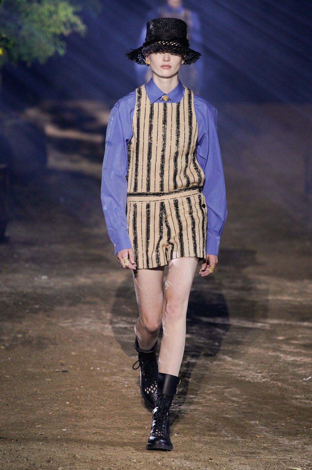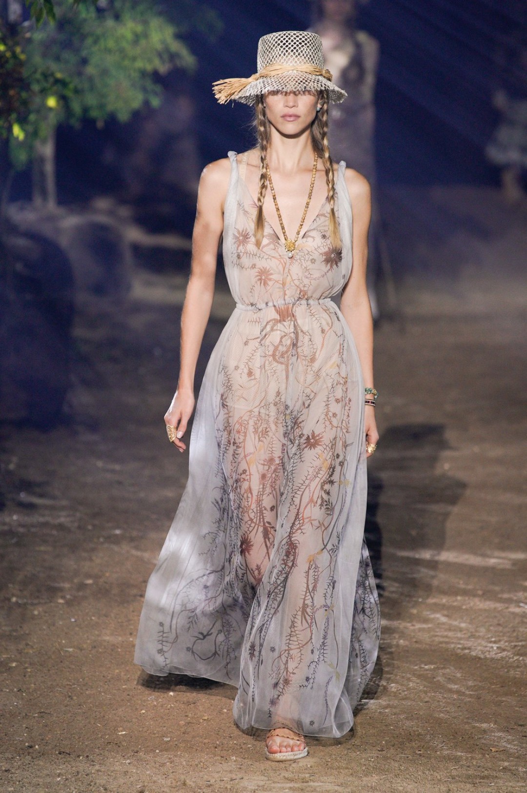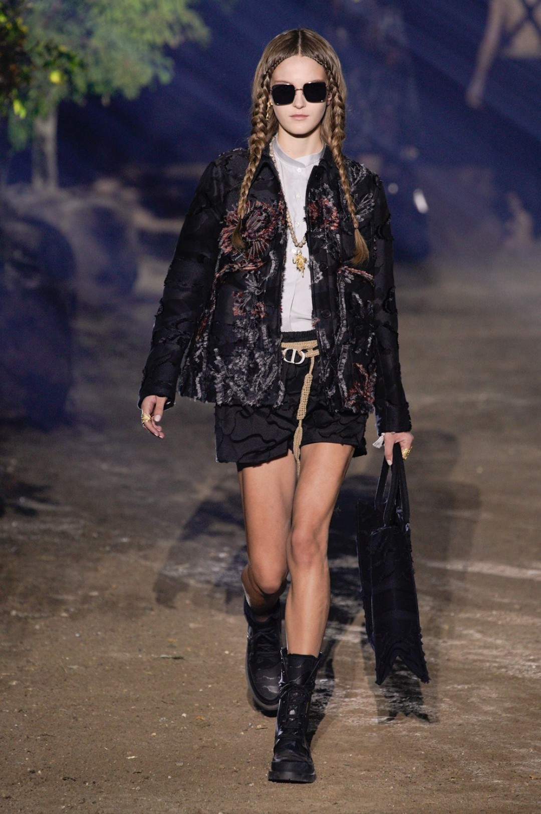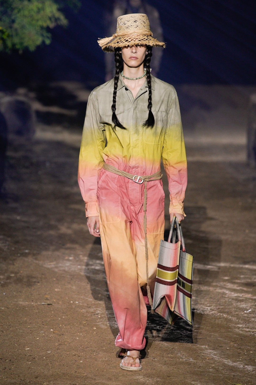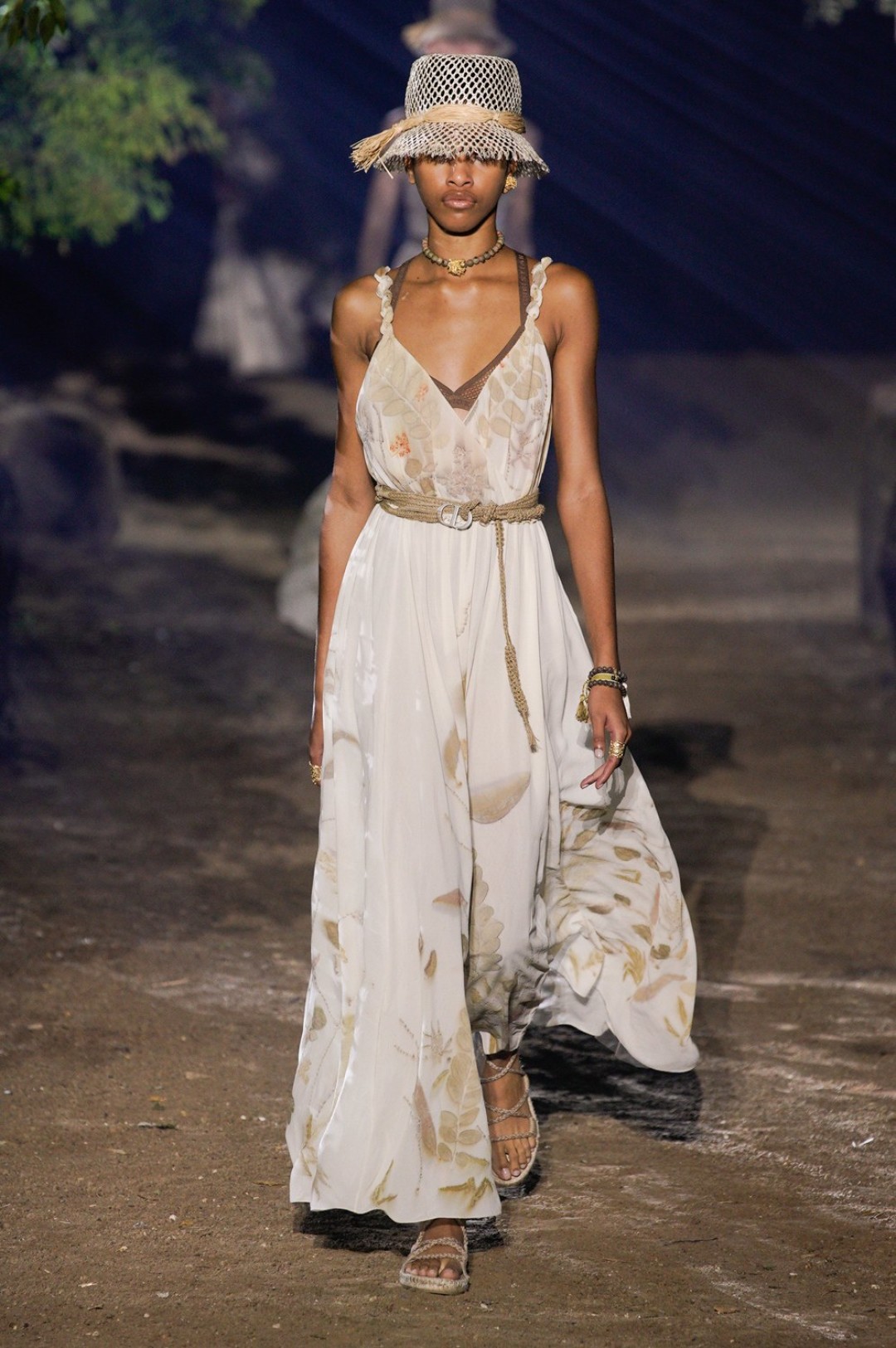 Многие вещи дополняли плетеные панамы, надетые на две косички, а также сетчатые перчатки и каучуковые сапоги. Именно в таком образе удобнее работать в цветочном саду, который к показу, кстати, тоже прилагался. По периметру ипподрома Longchamp, над сценографией которого работала студия ландшафтного дизайна Atelier Coloco, были расставлены 164 дерева — после весенне-летнего шоу их, по словам представителей Dior, высадят в разных районах Парижа.