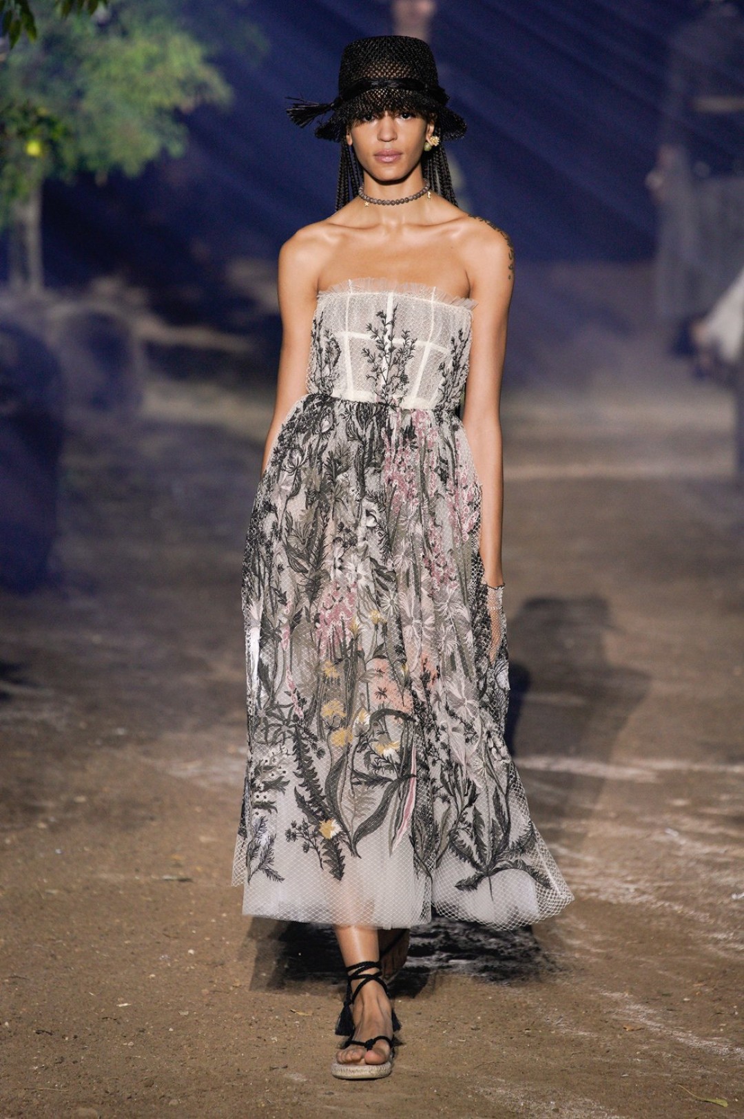 О семье Кристиана Диора креативный директор Мария Грация Кьюри рассказывает на подиуме не впервые. В своей первой кутюрной коллекции для французского бренда она переосмыслила платье Miss Dior, добавив к нему вышивки луговых цветов по образцам из того самого нормандского музея. Теперь же дизайнер искала вдохновение в архивах Сада растений Национального музея естественной истории в Париже и нанесла придуманные рисунки не только на романтичные платья, но и на костюмы свободного кроя, кружевные бралетты, кашемировые свитеры и белоснежные пальто.