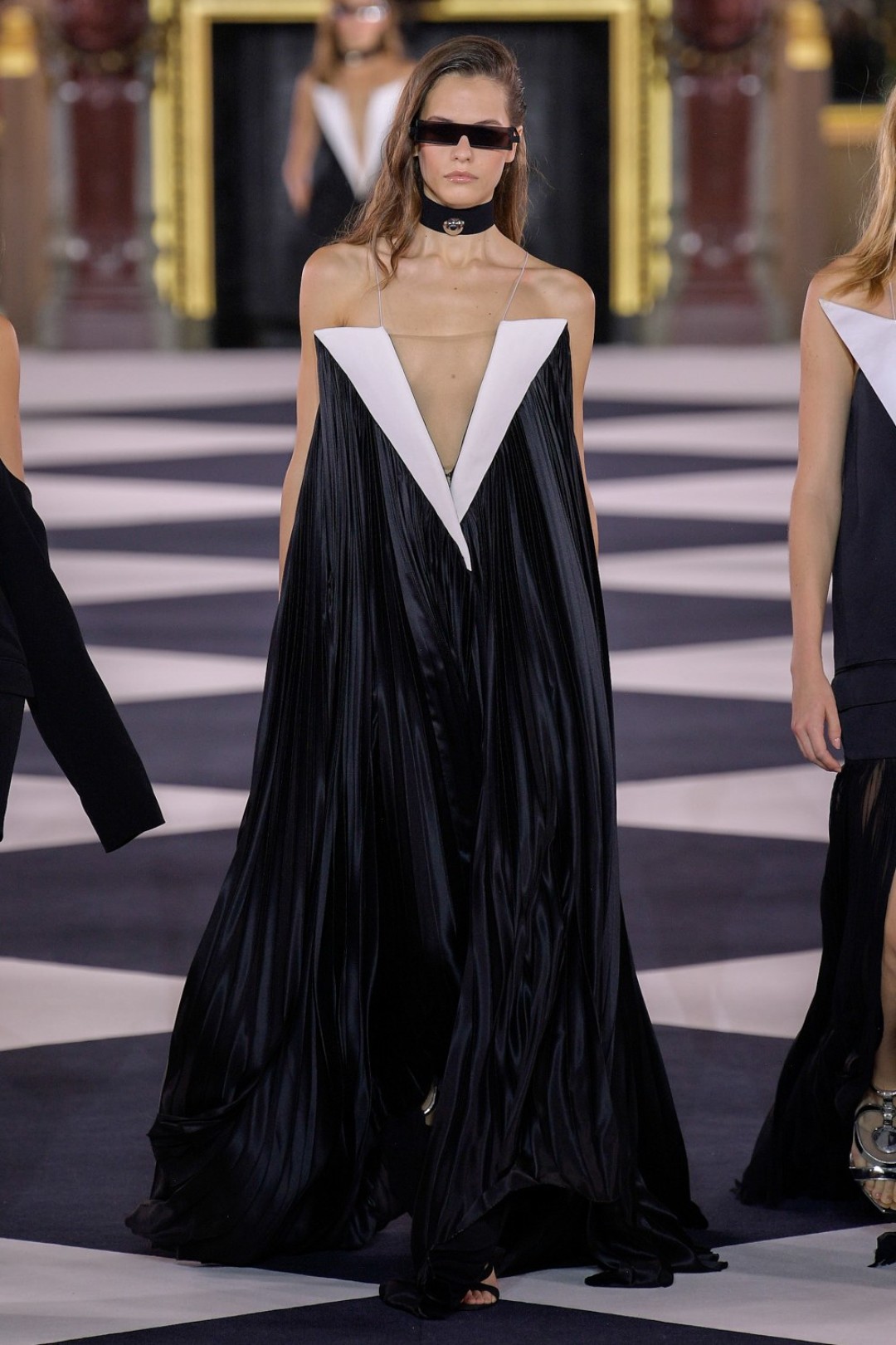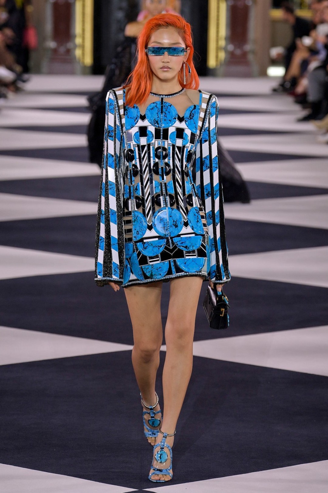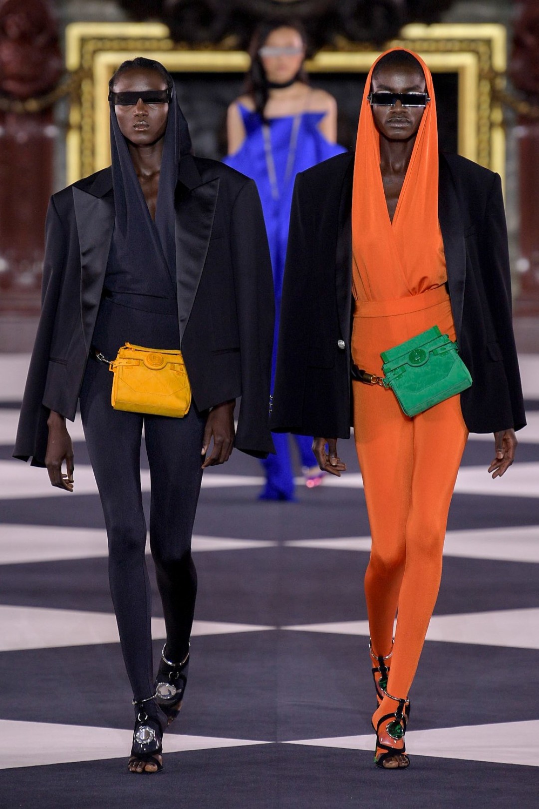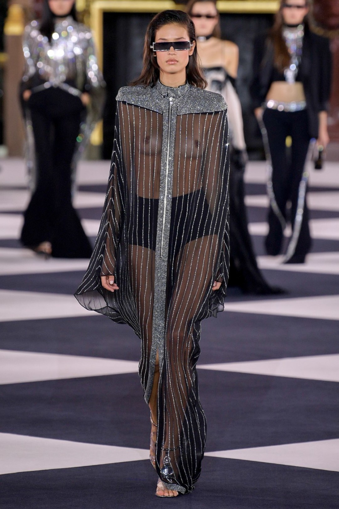 Все это выглядело как оммаж 1970-м и конкретно иконе моды тех лет — Грейс Джонс. Некоторые наряды дословно цитировали образы исполнительницы (например, платье с «капюшоном», который делал для нее Аззедин Алайя), только были дополнены футуристичными — в духе Balmain — элементами: сумками из металлизированной кожи, чокерами с крупными камнями и объемными шарами-браслетами.
