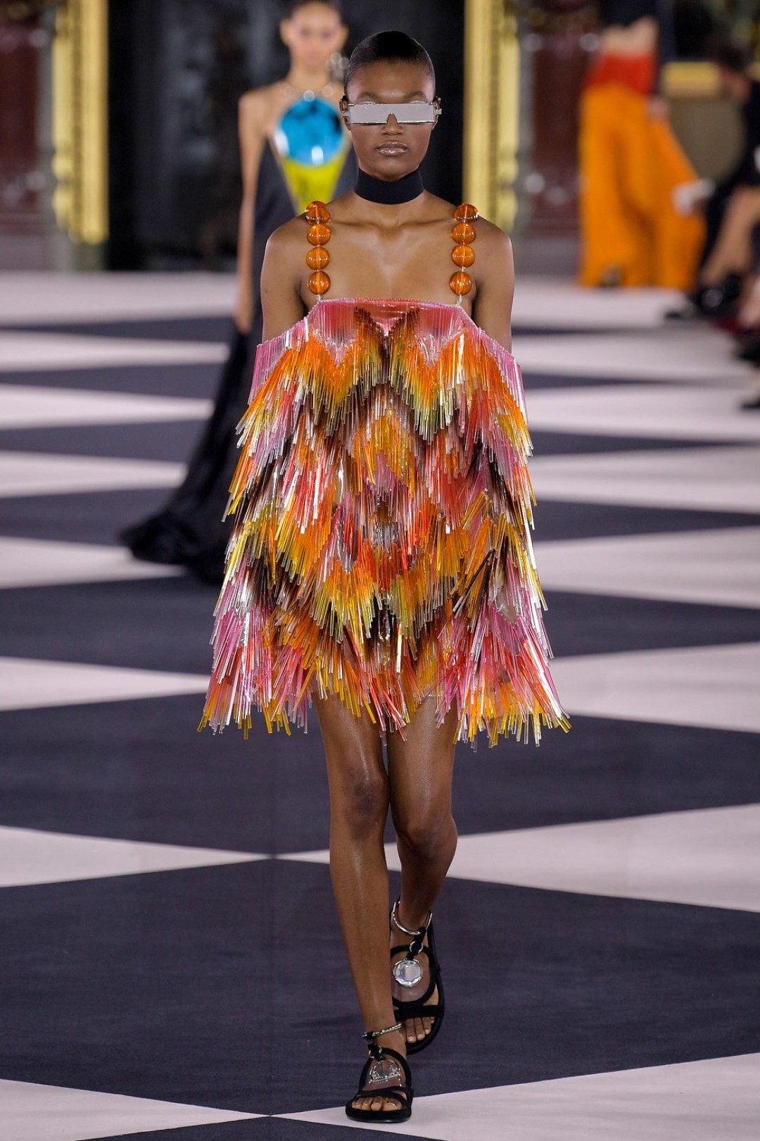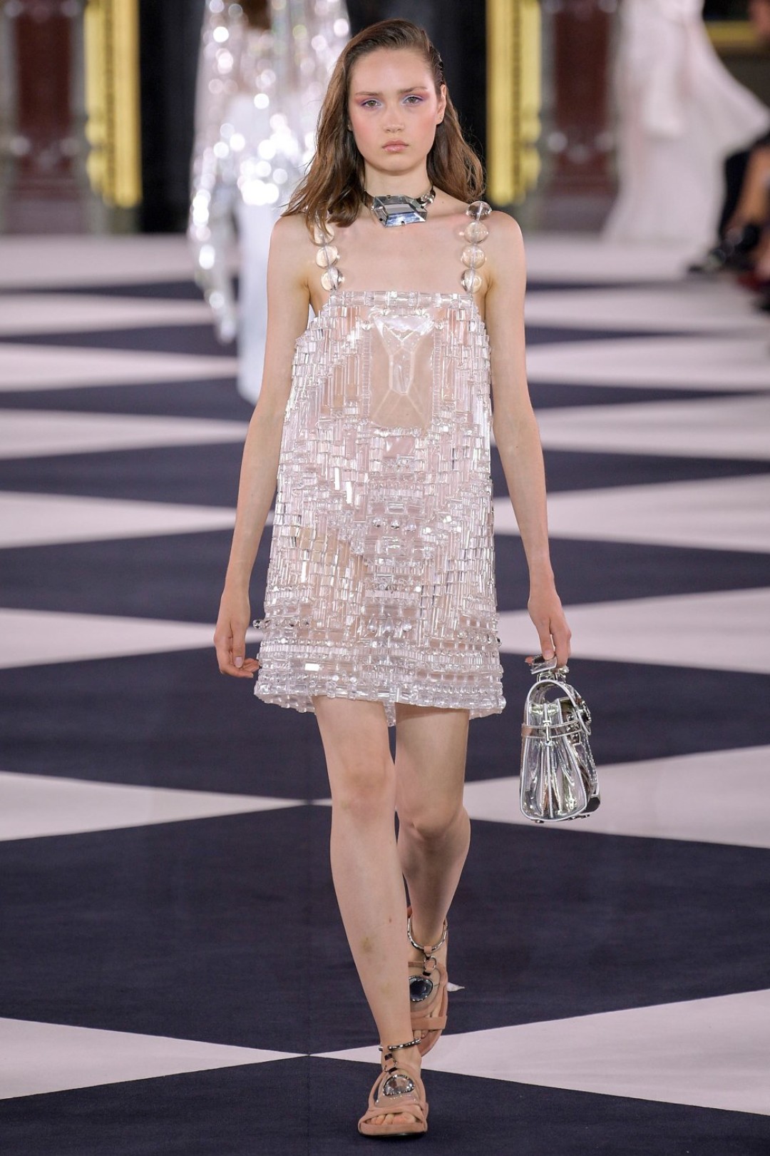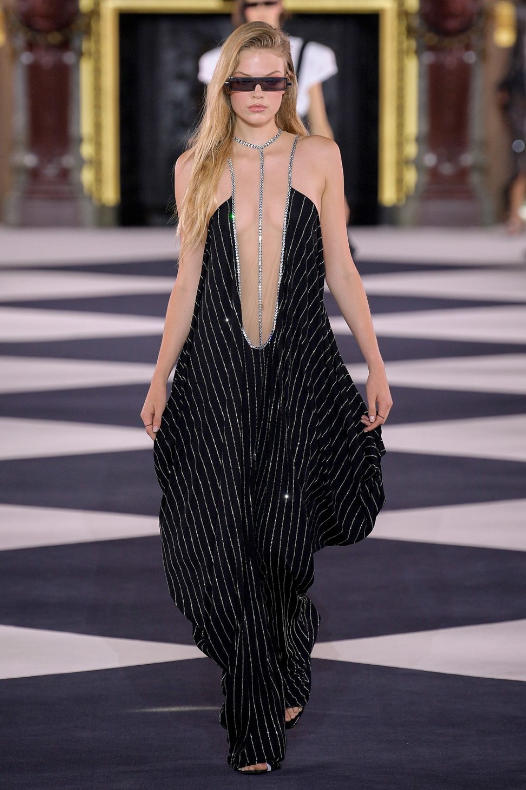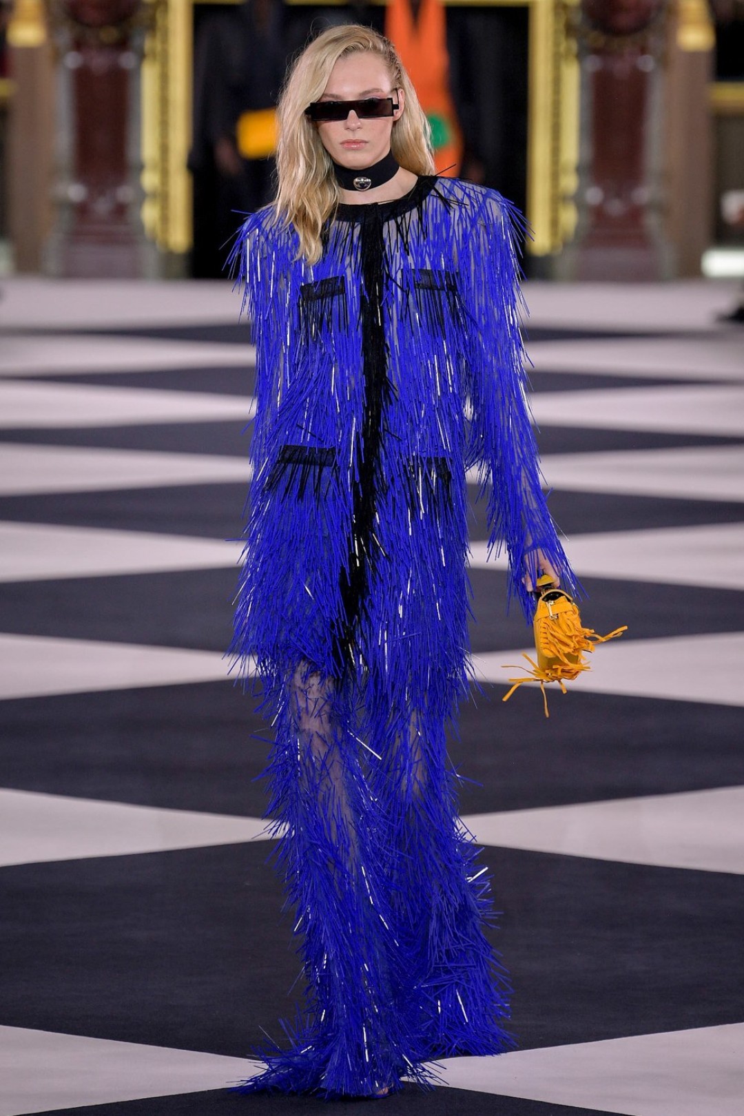 Все это выглядело как оммаж 1970-м и конкретно иконе моды тех лет — Грейс Джонс. Некоторые наряды дословно цитировали образы исполнительницы (например, платье с «капюшоном», который делал для нее Аззедин Алайя), только были дополнены футуристичными — в духе Balmain — элементами: сумками из металлизированной кожи, чокерами с крупными камнями и объемными шарами-браслетами.