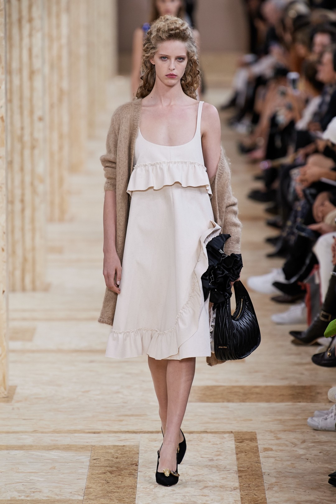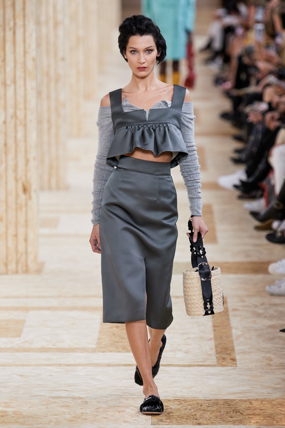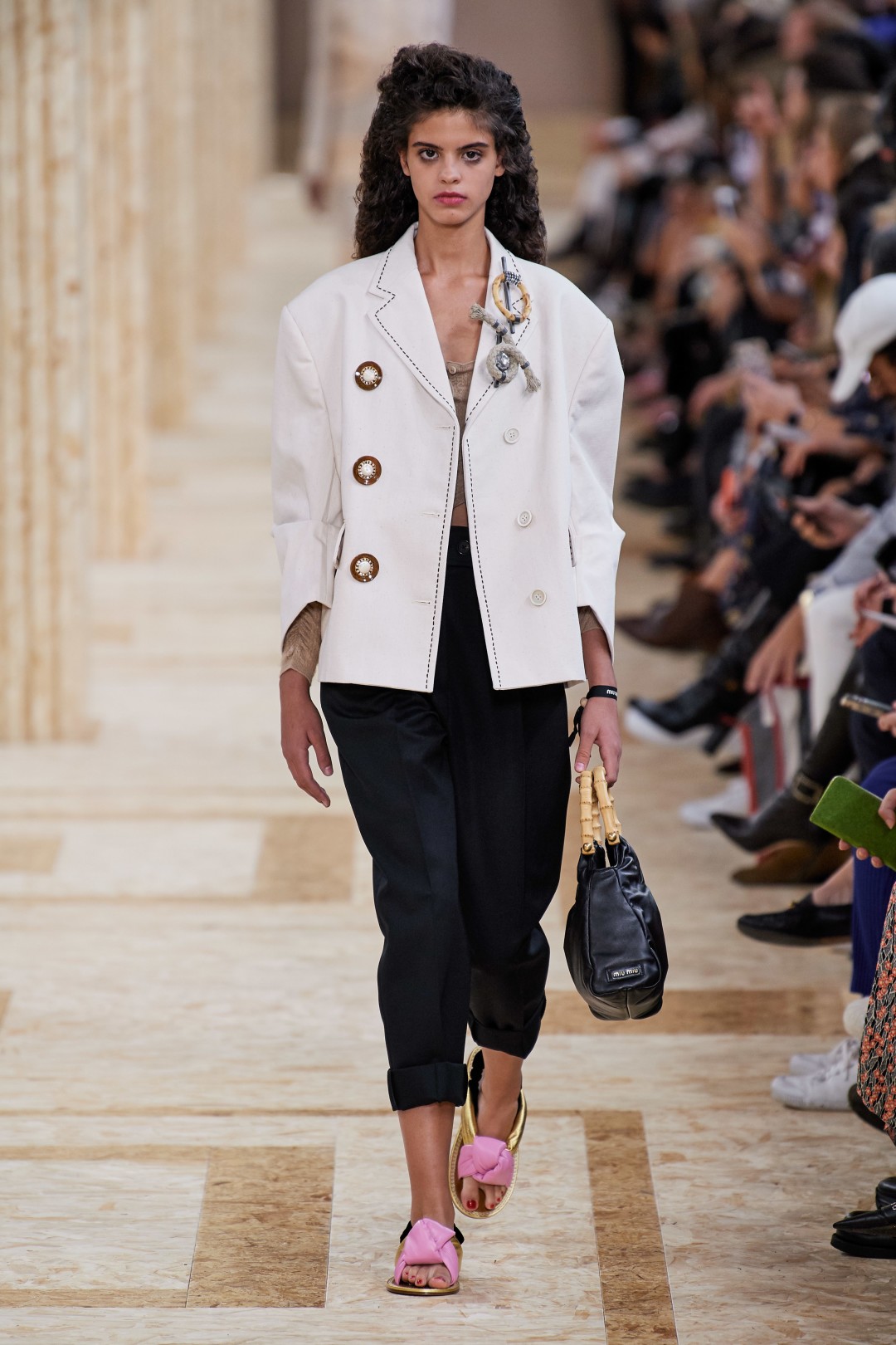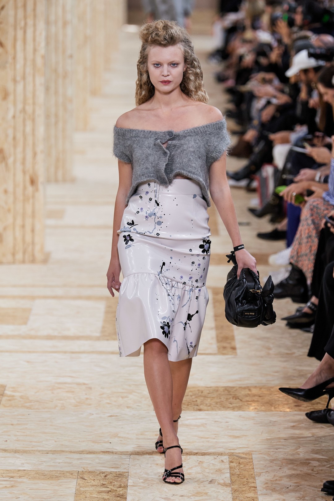 Если у вас еще нет подобного кардигана — с открытыми плечами, фигурным вырезом и всего двумя пуговицами, следующий сезон — отличный повод его купить. И стилизовать высокими сапогами на шнуровке, ботинками на деревянной платформе, сумками с бамбуковой ручкой и плетеными авоськами. Также Миучча Прада показала свою версию сумки-«пельменя», которая ранее появилась у Bottega Veneta, а после — в коллекции Givenchy. Дизайнер выполнила ее из кожи золотого цвета и оттенка «металлик», а также дополнила мягкой «перекрученной» ручкой.