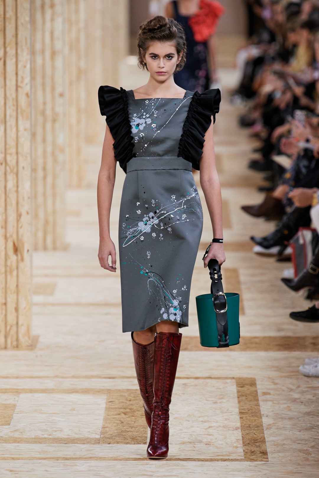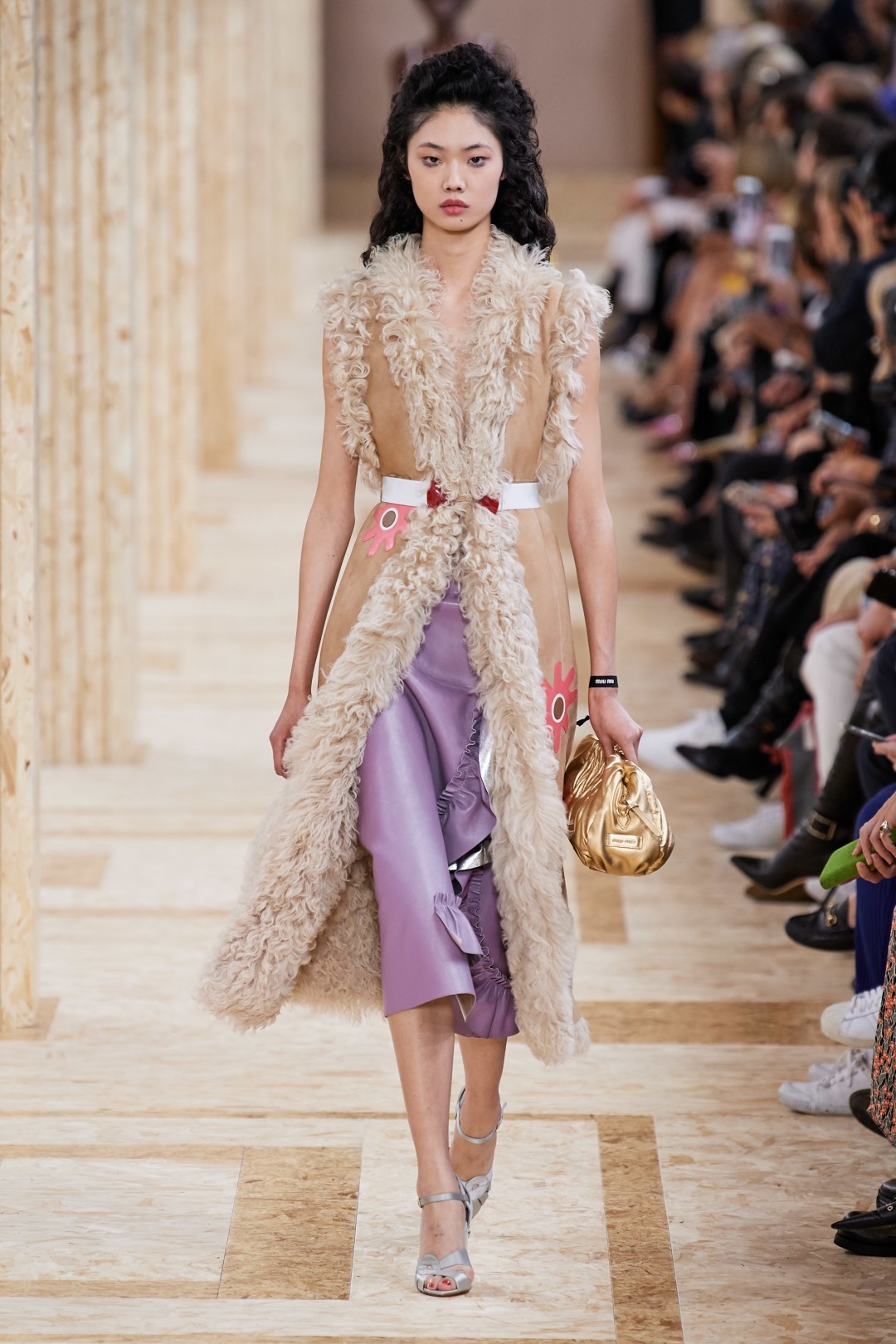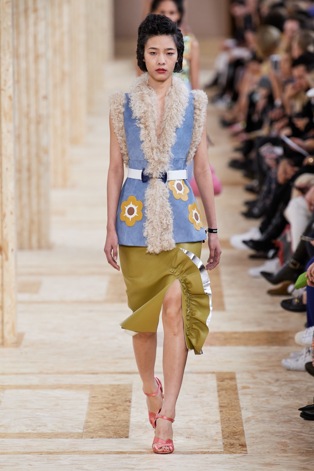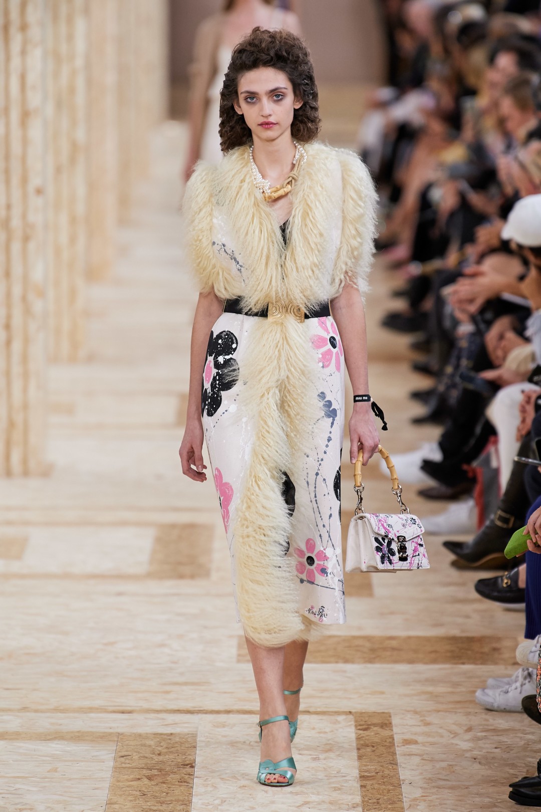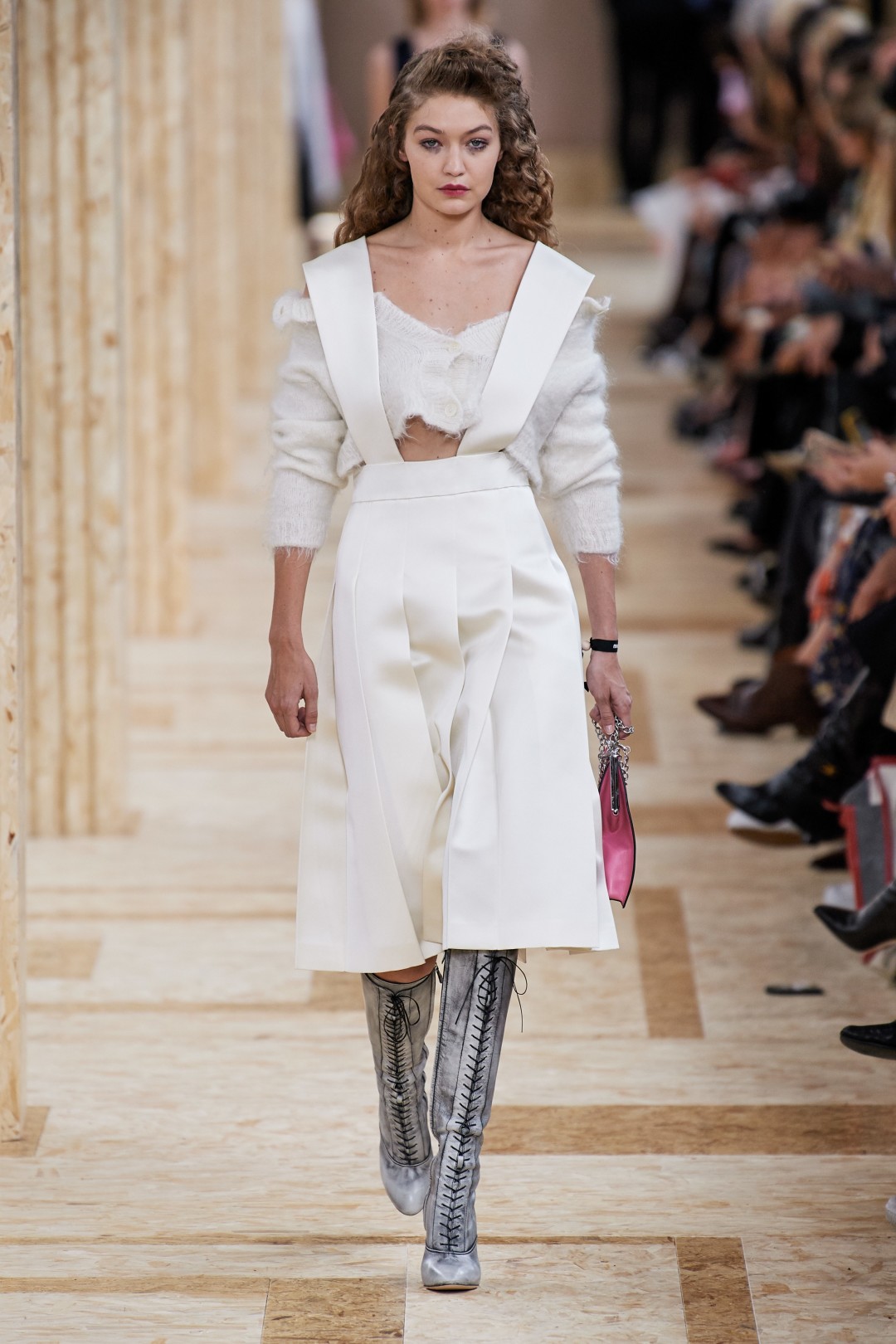 Если у вас еще нет подобного кардигана — с открытыми плечами, фигурным вырезом и всего двумя пуговицами, следующий сезон — отличный повод его купить. И стилизовать высокими сапогами на шнуровке, ботинками на деревянной платформе, сумками с бамбуковой ручкой и плетеными авоськами. Также Миучча Прада показала свою версию сумки-«пельменя», которая ранее появилась у Bottega Veneta, а после — в коллекции Givenchy. Дизайнер выполнила ее из кожи золотого цвета и оттенка «металлик», а также дополнила мягкой «перекрученной» ручкой.
