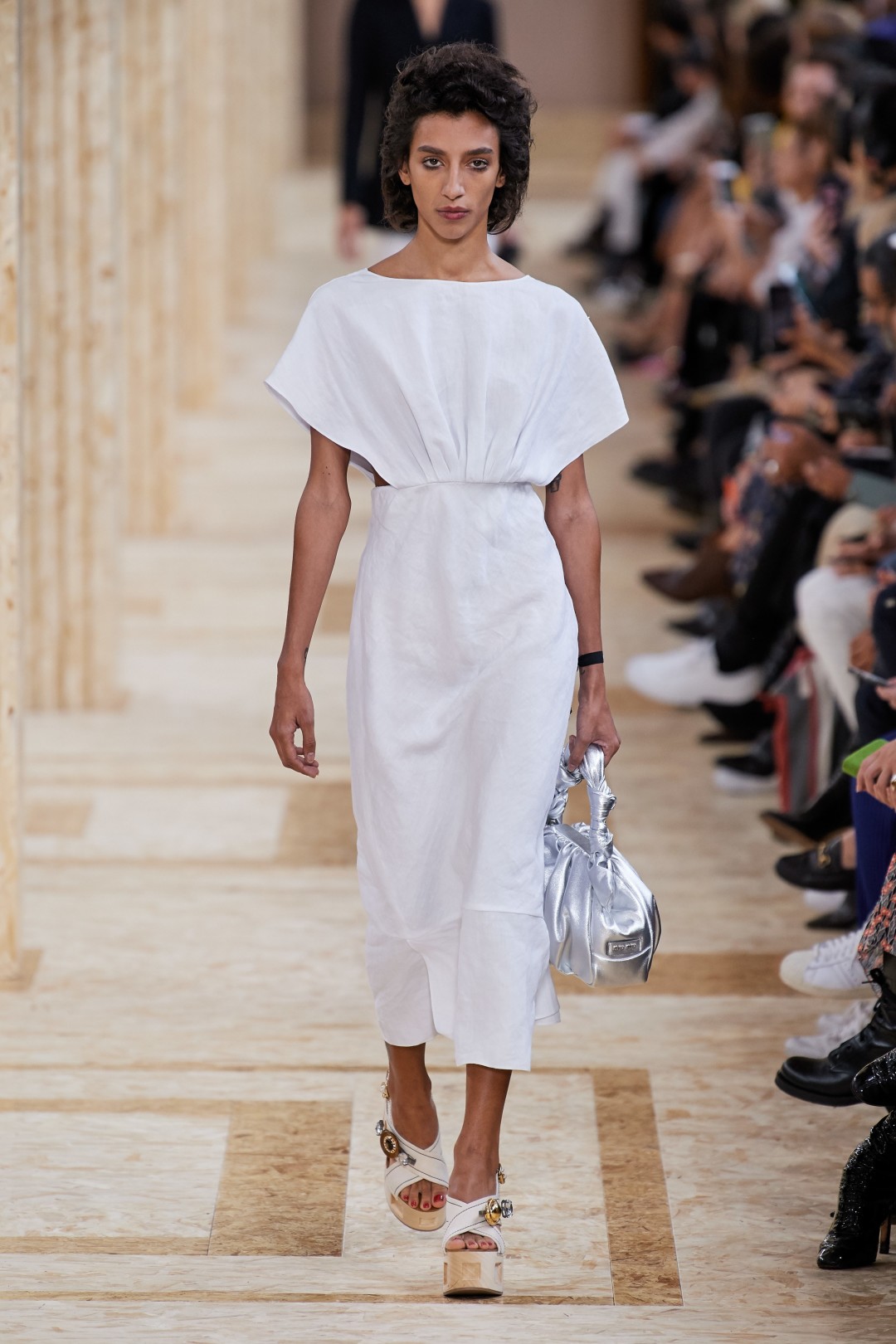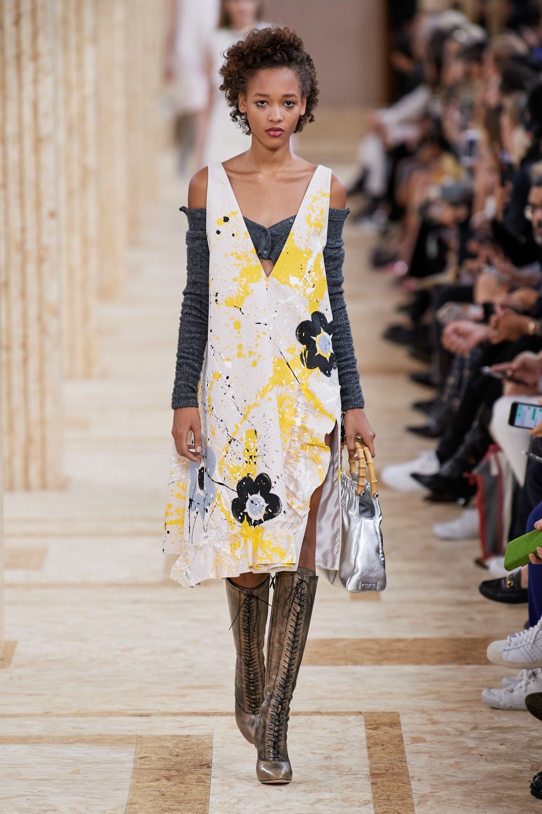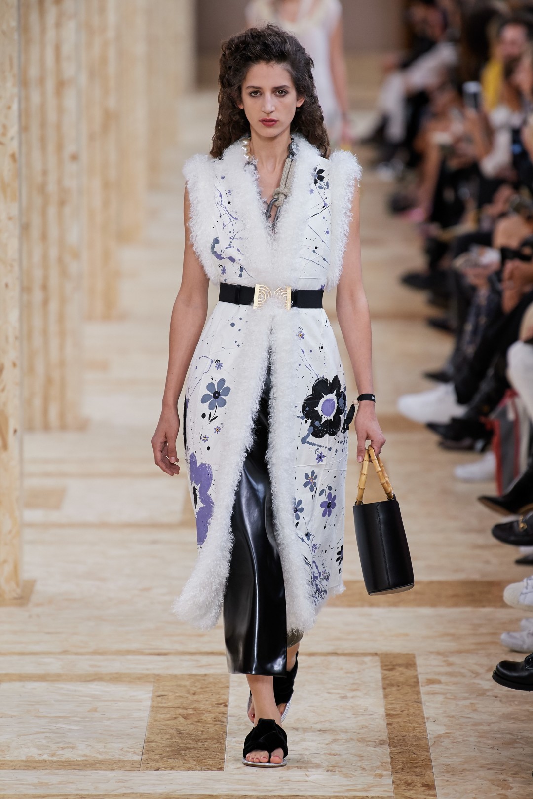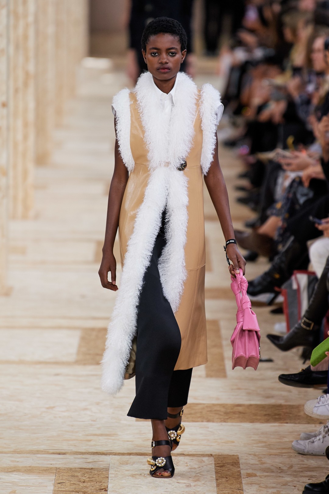 Если у вас еще нет подобного кардигана — с открытыми плечами, фигурным вырезом и всего двумя пуговицами, следующий сезон — отличный повод его купить. И стилизовать высокими сапогами на шнуровке, ботинками на деревянной платформе, сумками с бамбуковой ручкой и плетеными авоськами. Также Миучча Прада показала свою версию сумки-«пельменя», которая ранее появилась у Bottega Veneta, а после — в коллекции Givenchy. Дизайнер выполнила ее из кожи золотого цвета и оттенка «металлик», а также дополнила мягкой «перекрученной» ручкой.