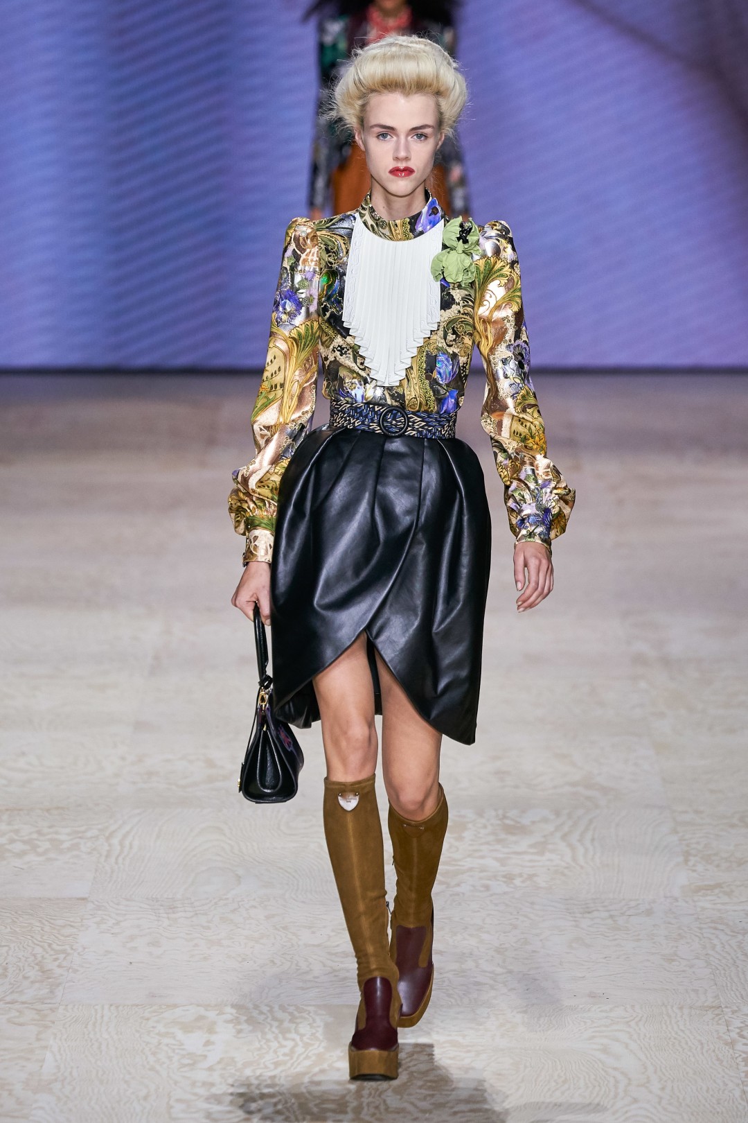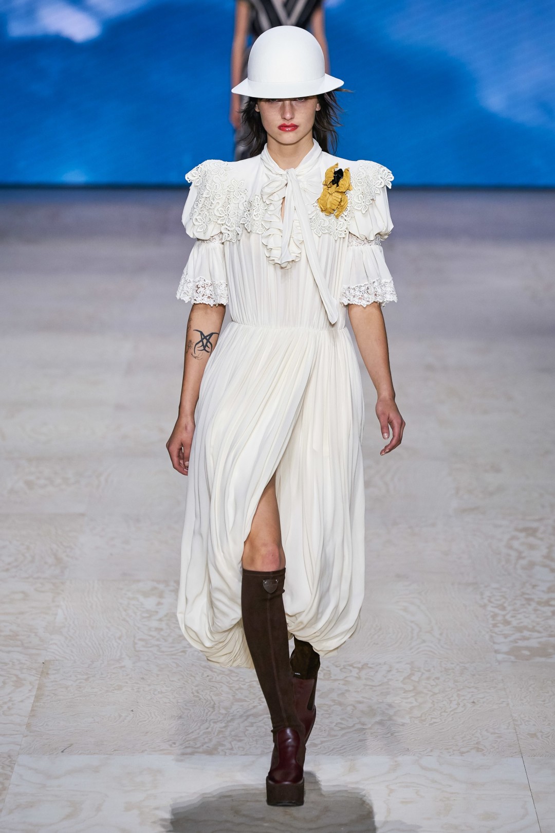 Рисунки на части платьев и пальто, сделанные сотрудниками бренда вручную, также отсылали к работам художников того времени — Альфонса Мухи (ангельские женские лица) и Уильяма Морриса (переплетенные друг с другом цветы). Стайлинг им делали сумки Neonoe, Cannes и Petite Malle с монограммой, напоминающей о том, что Прекрасная эпоха была таковой и для самого Louis Vuitton. В 1854 году модный дом открыл свой первый магазин, в 1850-х расширил линейку чемоданов, а в 1895-м придумал фирменную канву.