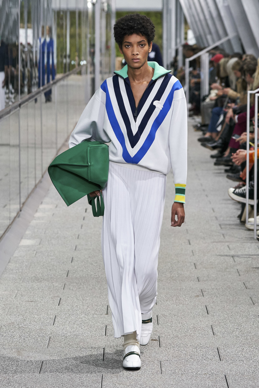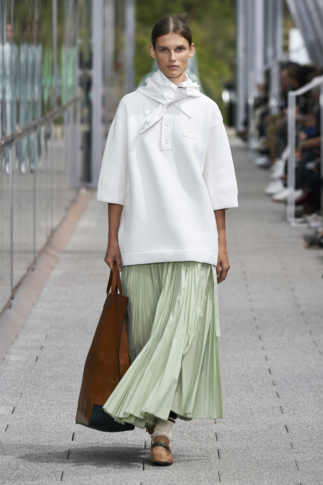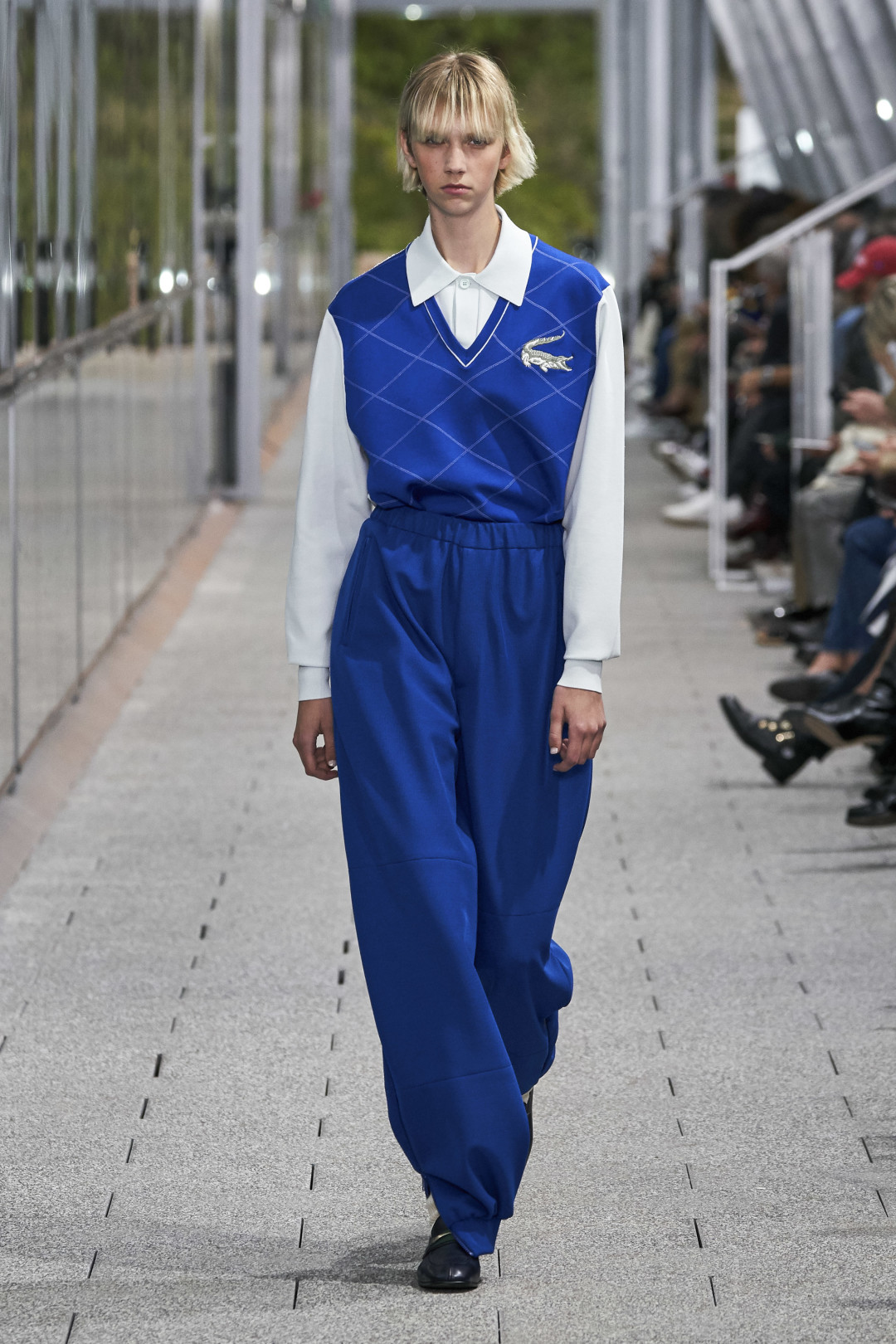 Креативный директор Луиз Троттер, пришедшая на смену Фелипе Оливейре Баптисте, вспоминает не только эпоху «Четырех мушкетеров», но и другие важные для Lacoste события. Например, выход Джона Фицджеральда Кеннеди в фирменном поло во время летних каникул в лагере или поездку Рене Лакоста и теннисистки Сюзанн Ленглен загород. Именно от них в коллекции — вязаные жилеты с треугольным вырезом, белые юбки с заниженной талией и спортивные брюки на резинке, в которых можно и заниматься спортом, и гулять.