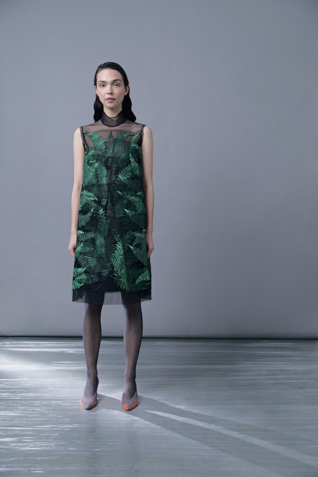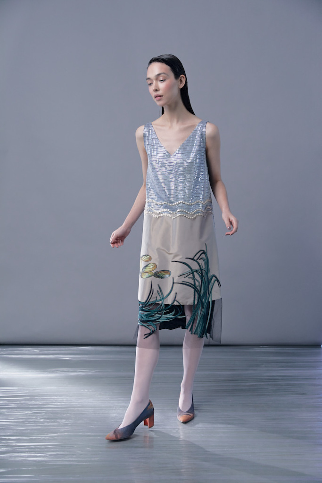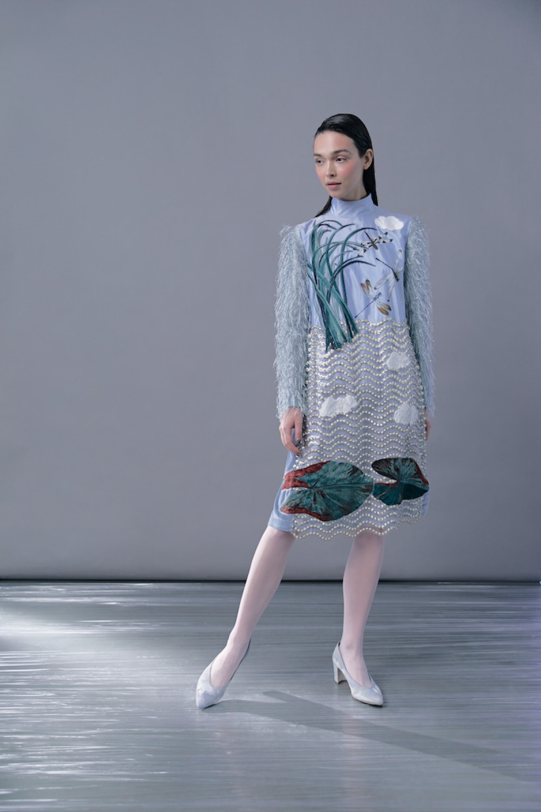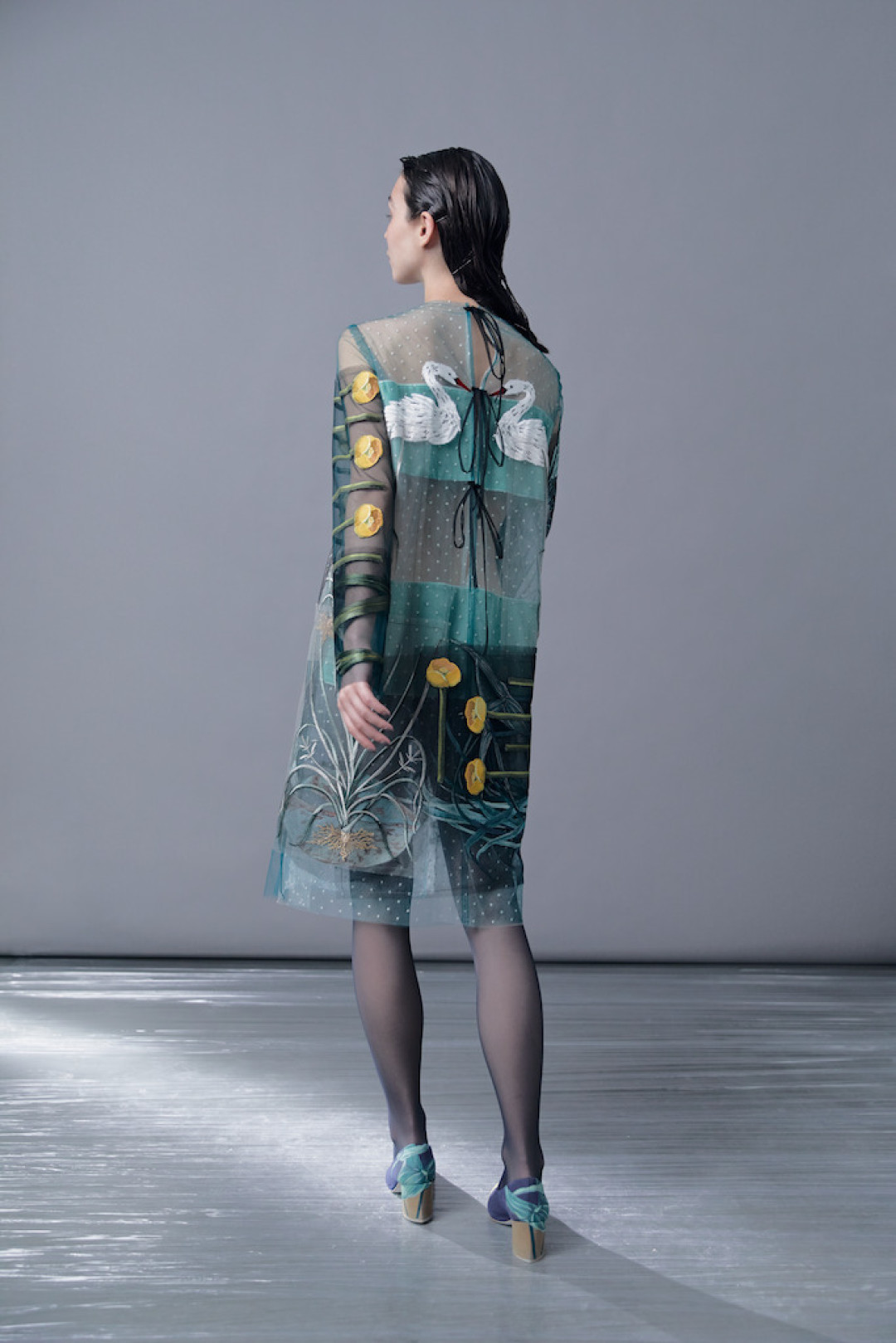 Каждое платье, как это обычно бывает в коллекциях Татьяны Валентиновны, похоже на отдельное живописное полотно — с «нарисованными» кувшинками, осокой, папоротниками, лебедями и теми самыми стрекозами с крыльями, прозрачными, как слюда. Все эти вышивки были созданы в стенах модного дома Tatyana Parfionova в Петербурге, что придает коллекции уникальное кутюрное качество. Однако сама Татьяна Валентиновна не считает важным деление на haute couture и ready-to-wear — «в наше время границы между этими понятиями стираются».