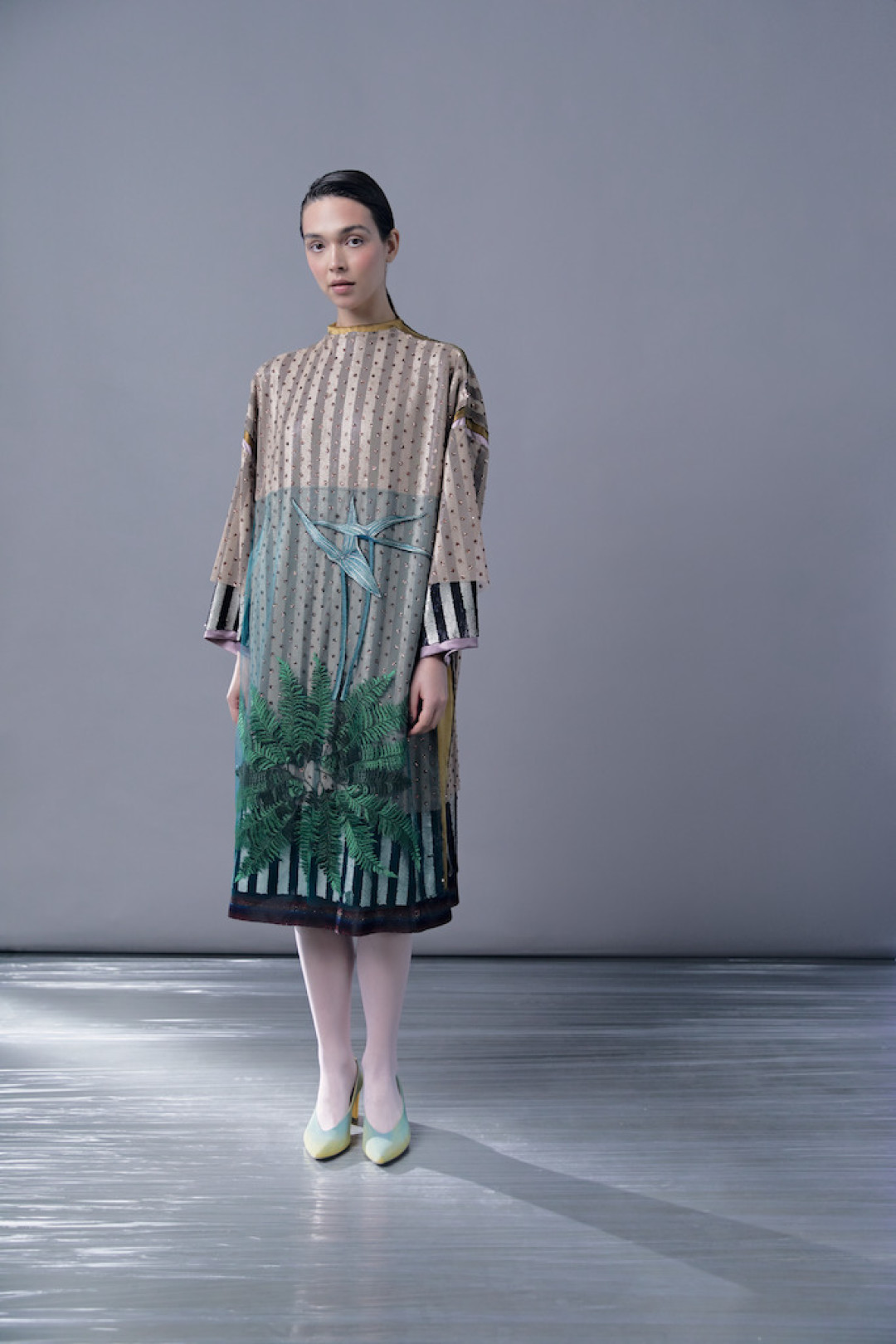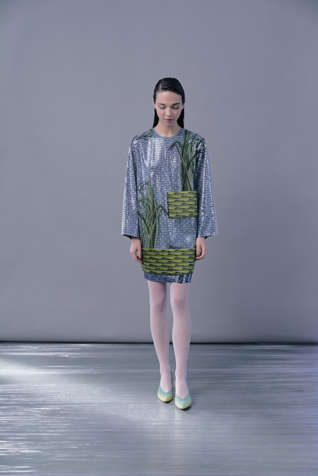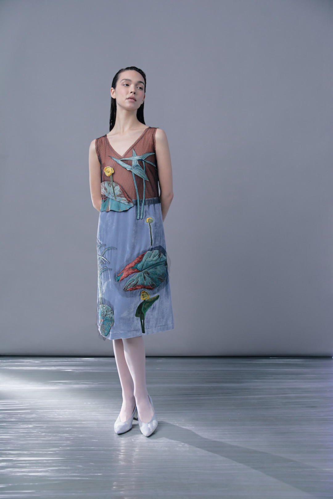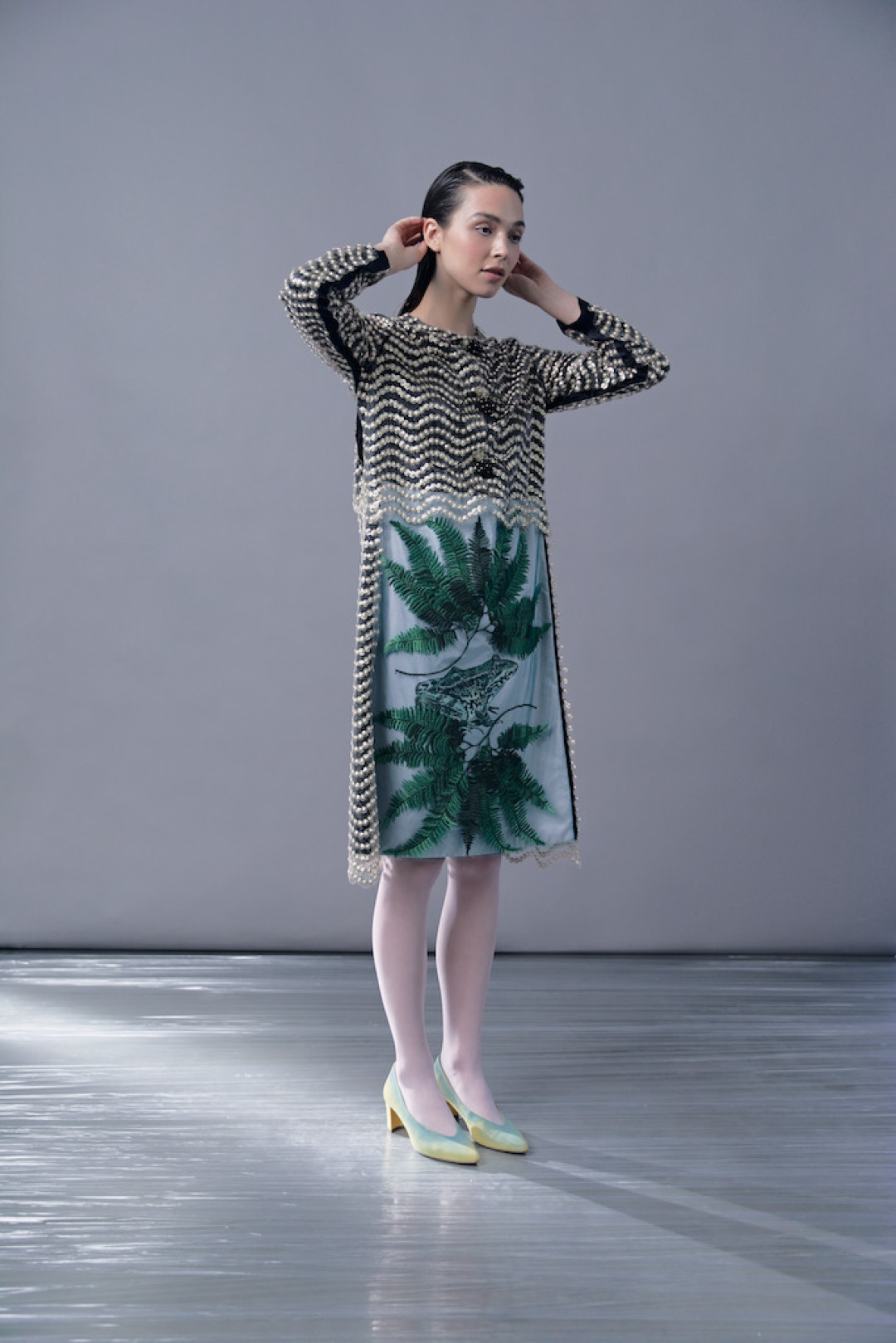 Каждое платье, как это обычно бывает в коллекциях Татьяны Валентиновны, похоже на отдельное живописное полотно — с «нарисованными» кувшинками, осокой, папоротниками, лебедями и теми самыми стрекозами с крыльями, прозрачными, как слюда. Все эти вышивки были созданы в стенах модного дома Tatyana Parfionova в Петербурге, что придает коллекции уникальное кутюрное качество. Однако сама Татьяна Валентиновна не считает важным деление на haute couture и ready-to-wear — «в наше время границы между этими понятиями стираются».