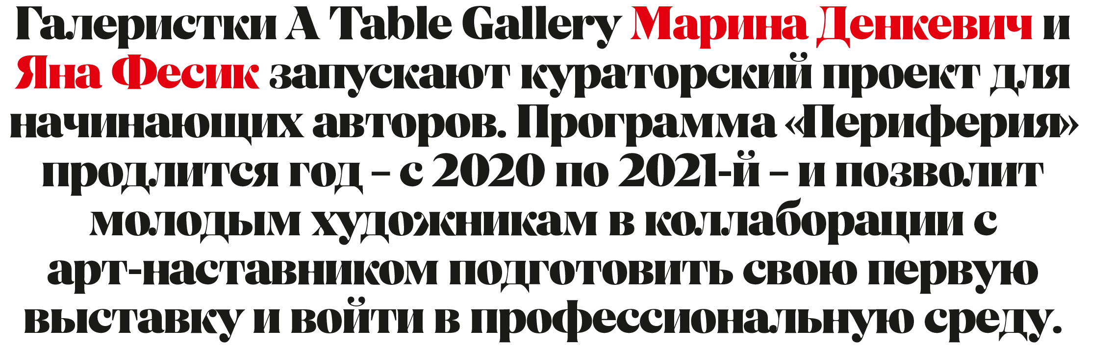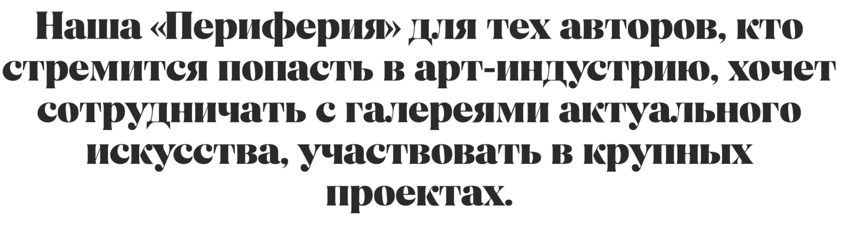 Наша «Периферия» для тех авторов, кто стремится попасть в арт-индустрию, хочет сотрудничать с галереями актуального искусства, участвовать в крупных проектах. Сейчас мы уже чувствуем уверенность в своих силах и имеем нужные ресурсы, чтобы помочь, дать старт будущим звездам.Яна Фесик: Уже давно хотелось системно проработать проблему «периферийных художников», которых не принимают в институции, которым отказывают в выставках. Ведь, по сути, им нужна кураторская поддержка, которую мы можем и готовы оказать.