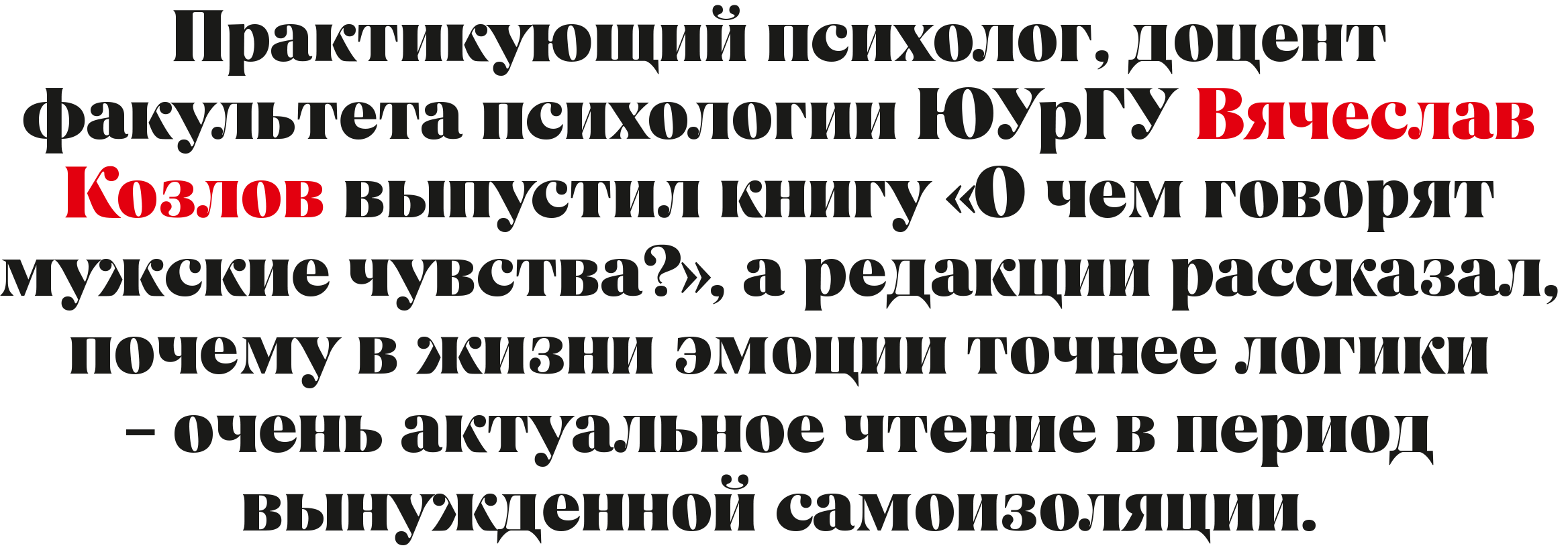 Давайте немного подробнее. Ум лукав. Он докажет, что черное – это белое, а белое – это черное. Каждый из нас уже не раз переживал нечто подобное. Сейчас события выглядят одним образом, а через минуту совершенно иначе. Иногда мы утопаем в ворохе аргументов в пользу того или иного шага, но сделав его, понимаем, что совершили ошибку. Наш ум обводит нас вокруг пальца. А вот чувства просты и честны. Более того, они содержат в себе подсказку, а иногда и прямое указание на то, что именно следует сделать в той или иной ситуации. Но вот беда – подсказка эта звучит на таком языке, которым мы хорошо владели в детстве, но достигнув взрослого возраста, совершенно разучились понимать. Мы глухи к собственным чувствам, мы не понимаем их.Может, это не так уж и важно? Живем же мы как-то, достигаем успеха, решаем жизненные задачи, деньги зарабатываем, детей растим. Все так, вот только качество жизни иногда оставляет желать лучшего. Приведу пример. В доме номер два по улице Кузнецова расположена психиатрическая больница, там есть целое крыло для «наших». То есть это в основном мужчины от тридцати до сорока пяти лет, социально успешные, руководители и собственники бизнеса. Они много и упорно трудились, достигали успеха, но в какой-то момент надорвались. Одних увезли с рабочего места, другие сами дошли по направлению. Там побывало несколько моих знакомых: «Лежишь как овощ три дня под капельницей. В голове туман, потом потихоньку в себя начинаешь приходить…». Они многое бросили на алтарь достижения цели и долго игнорировали то, что с ними происходило. Так или иначе, мы все делаем с собой что-то похожее – подавляем свои чувства, игнорируем переживания, запрещаем себе сильные вспышки и избегаем испытывать «неудобные» эмоции. А ведь именно они нам безошибочно подсказывают самый верный выбор, подталкивают к необходимым действиям или наоборот оберегают от ошибок.Вячеслав ведет индивидуальное и семейное психологическое консультирование. Имеет сертификат EuroPsy и право работать по специальности в странах ЕС без подтверждения диплома.Член Российского психологического общества. Председатель Челябинской областной общественной организации «Объединение Профессиональных Психологов». prof-psychology.ruГенеральный директор Группы компаний «Базовое основание»: управление пакетом предприятий формата «малый бизнес», специализируется на start-up проектах.Бизнес-тренер и консультант по организационному развитию. В портфеле реализованных кейсов – сотрудничество с корпорациями МТС, Ростелеком, Ростех, Теле2, Астана-Импорт-Экспорт.Соведущий рубрики «Вся правда о мужчинах» на 31 канале Челябинского телевидения (2018 год).Это ваше частное мнение, или под этим есть какая-то научная основа? Если говорить о научном подходе, то здесь однозначно утверждается, что чувства необходимо осознавать, проявлять, выражать. Идею того, что они прямо подсказывают нам ответы на наши вопросы, мы активно исследуем с коллегами по факультету психологии ЮУрГУ. Сейчас она воспринимается как нечто новое и оригинальное. Когда мы проводим курсы повышения квалификации для консультирующих психологов и раскрываем эту тему, то слушатели просят, а иногда и требуют посоветовать литературу по этому поводу, но ее практически нет. Поэтому вначале была идея создать методичку – путеводитель по чувствам, и мы даже уже с