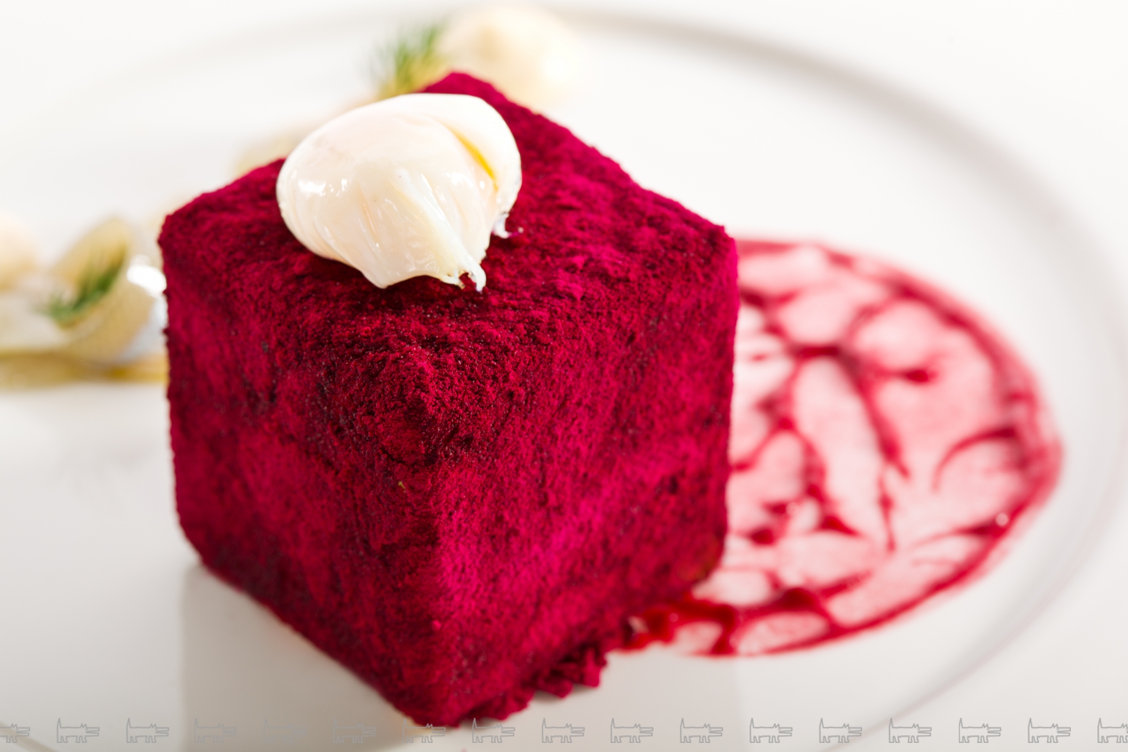Корюшку готовят пряного посола: очищенную рыбу на несколько часов вакуумируют в рассоле, сваренном со специями и морской солью. Прочие ингредиенты традиционны: отварные картофель и морковь, красный лук, запеченная свекла, домашний майонез. Сборка куба: фундамент из картофеля, затем корюшка, в центре - мусс из моркови, сверху - свекла. Куб выравнивают и посыпают свекольной пудрой, которая и придает ему красивую бархатную фактуру. Сервируется пашотом из перепелиного яйца, корюшкой, тарелку орнаментируют пряным свекольным пюре.