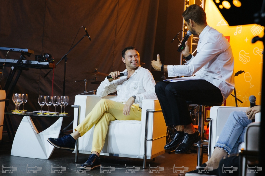 На главной сцене собрались актер Андрей Носков, телеведущая Людмила Ширяева, певица Влада Чупова и резидент Comedy Club Игорь Меерсон, чтобы вместе с ведущим Антоном Забелиным обсудить любимые сорта винограда и выпить за благополучие итальянских виноделов.