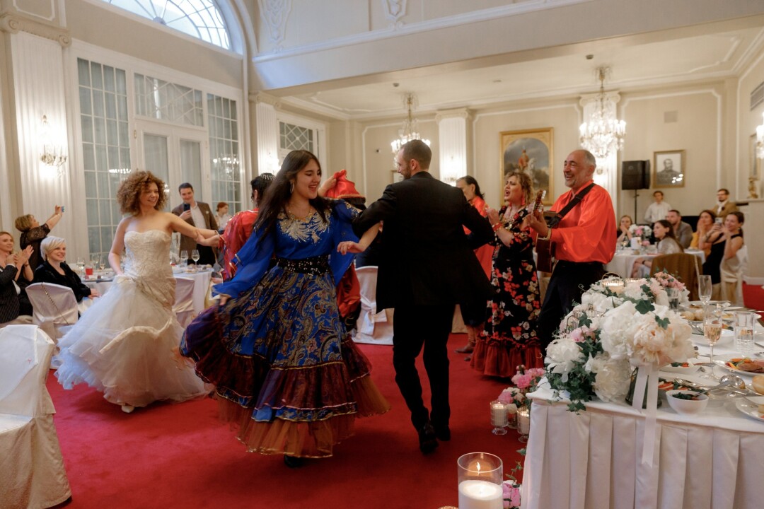Все было максимально классическим: выход невесты с отцом под песню «Александра», обмен клятвами, кидание букета и подвязки, нарядный торт, крики «Горько!», кража невесты, первый танец под адаптированную песню Валерия Сюткина «Москва-Нева» и, конечно, трогательные поздравления друзей. А еще были... настоящие цыгане! За музыкальное сопровождение вечеринки отвечала кавер-группа из Перми «El capitan!», которую мы заприметили еще на совместном обучении в этом городе. Одним словом, это было здорово!