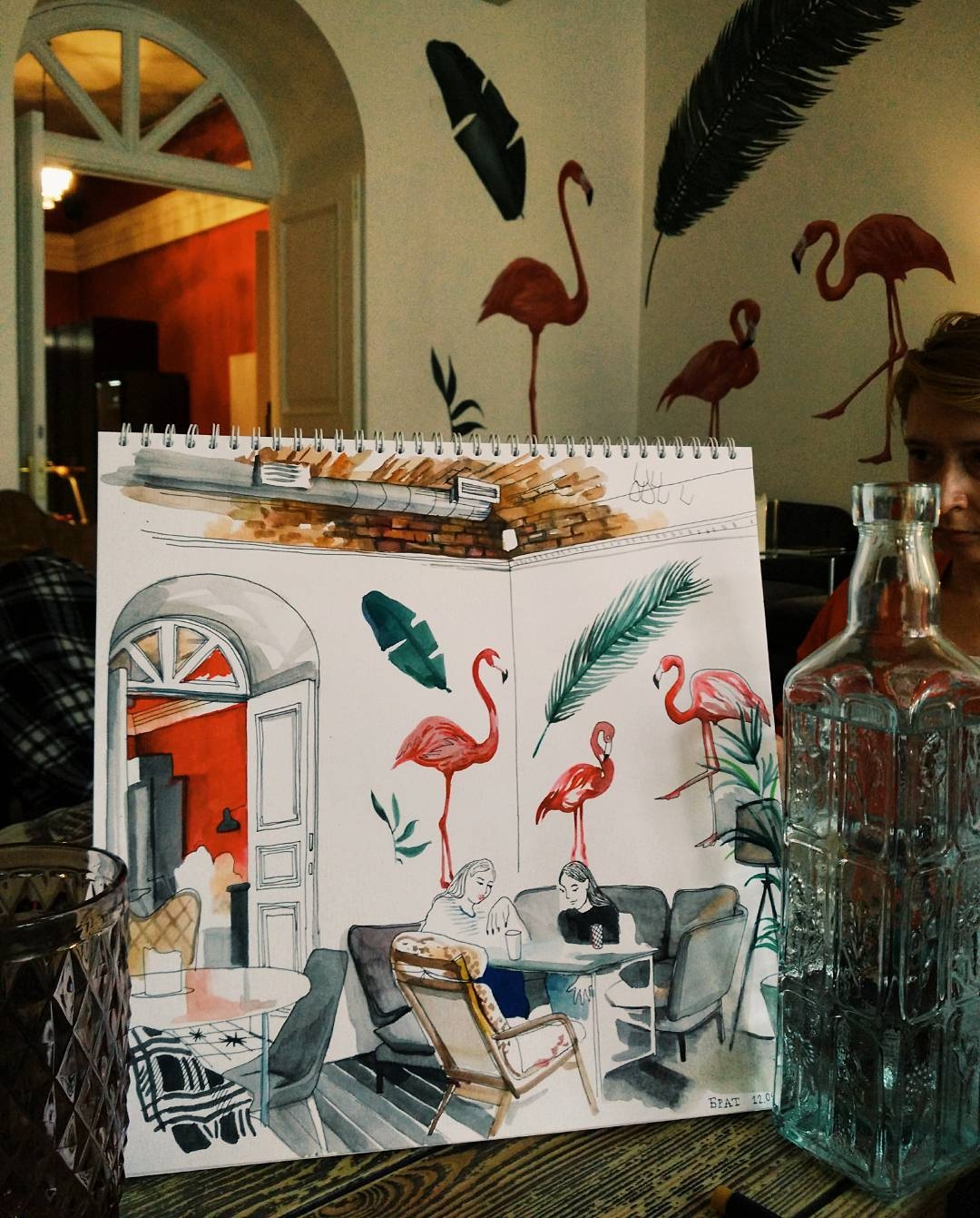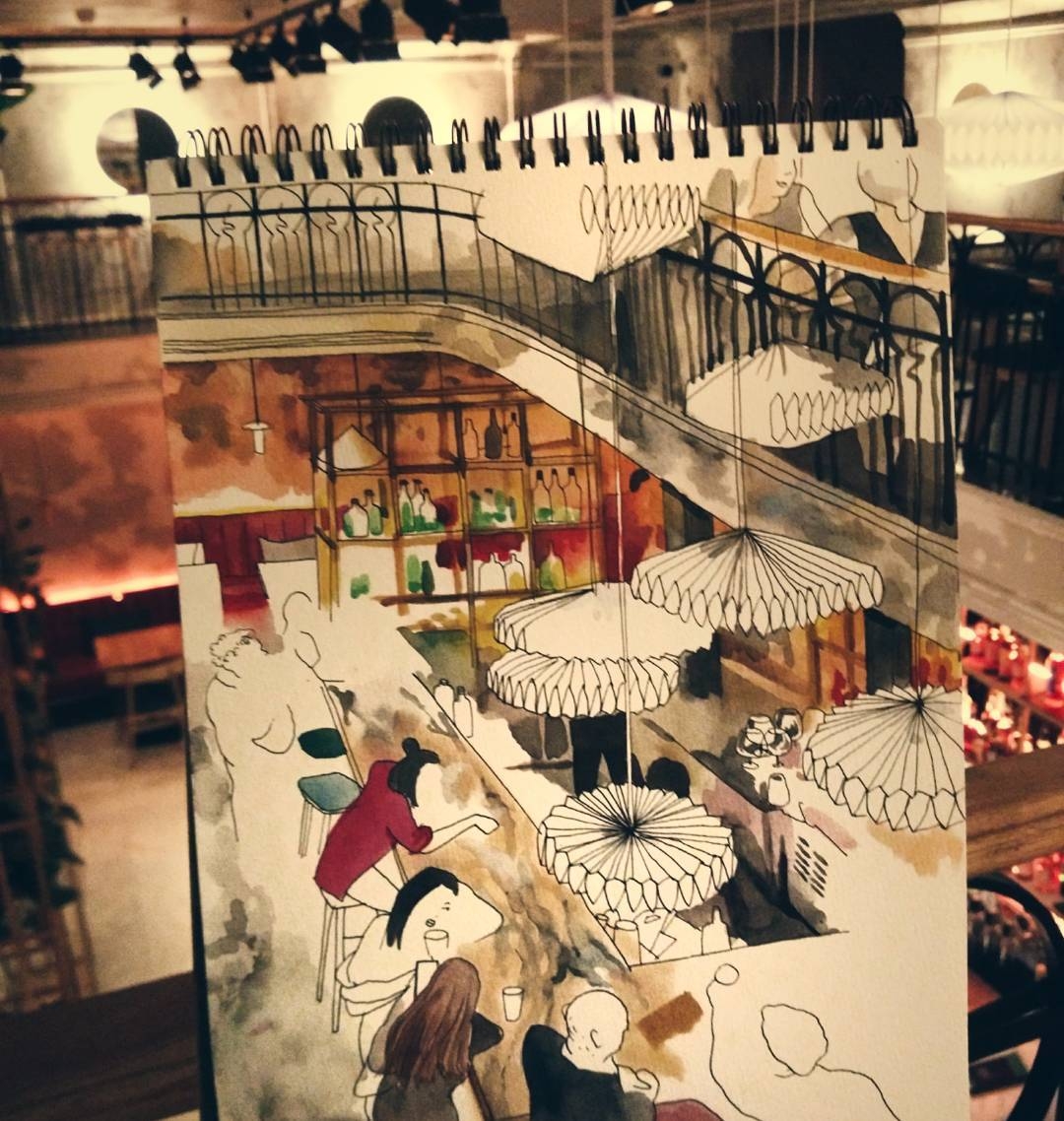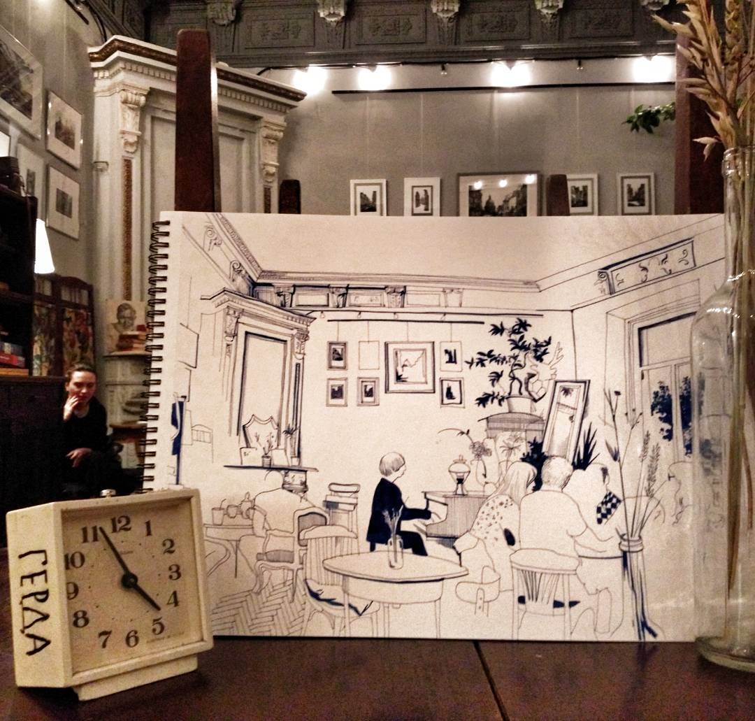Я родилась в Петербурге в художественно-архитектурной семье, поэтому росла среди картин, красок и книг, так что тяга к творчеству и искусству появилась сама собой. Училась в академии Художеств им. Репина на архитектурном факультете. Не могу назвать себя именно иллюстратором, я скорее художник. Все началось с необходимости делать большое количество набросков, чтобы набить руку: я рисовала повсюду, а потом поняла, что в барах и кафе мне нравится делать это больше всего. Постепенно это вошло в приятную привычку, а затем вылилось в проект «Between the bars».