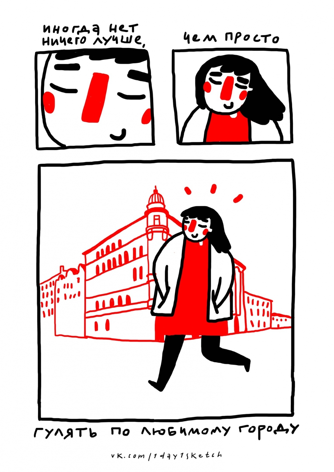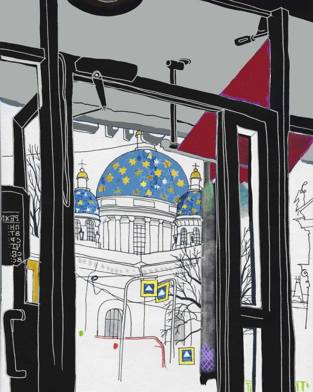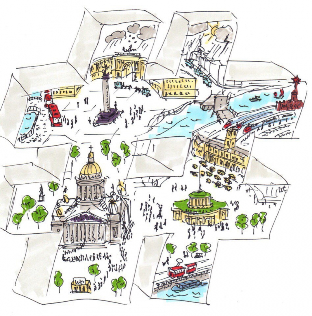 Я не ограничиваю себя одним городом: естественно, рисую и другие места, особенно во время путешествий, но логично, что место, в котором живешь, тем более такое насыщенное и красивое, чаще всего становится источником вдохновения. Я люблю Петербург! Могу часами бродить по городу, разглядывая все подряд: убранство домов, витрины магазинов и кафе, окна квартир на первых этажах, надписи на стенах, объявления и даже рекламу, захожу во дворы, гуляю по набережным, смотрю на воду, любуюсь закатами. Вдохновляет связь между местом и историческими событиями, то, что схожими маршрутами 100-200 лет назад ходили любимые исторические и литературные персонажи.