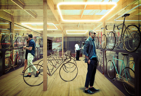 «Проект с очень ярко выраженной велосипедной тематикой. В задании не стояло задачи делать павильон с игровой площадкой, но из-за того что ребята поклонники спорта они продумали рампу, мост, который отсылает к эстетике вело-триала»