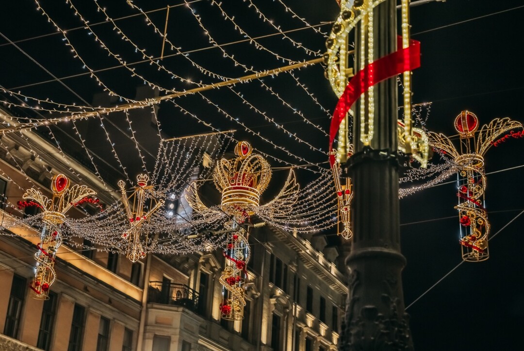 Впервые за долгое время Невский поменял праздничное оформление (старые конструкции прослужили семь лет и их передали в другие районы города). Если елка на Дворцовой должна напомнить о советских временах, то главную улицу города украсили в имперском стиле. Над головами водителей и пешеходов пропалывают светящиеся короны и скипетры.