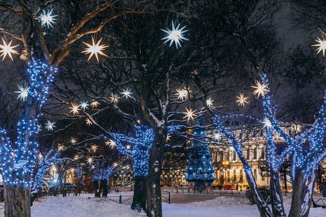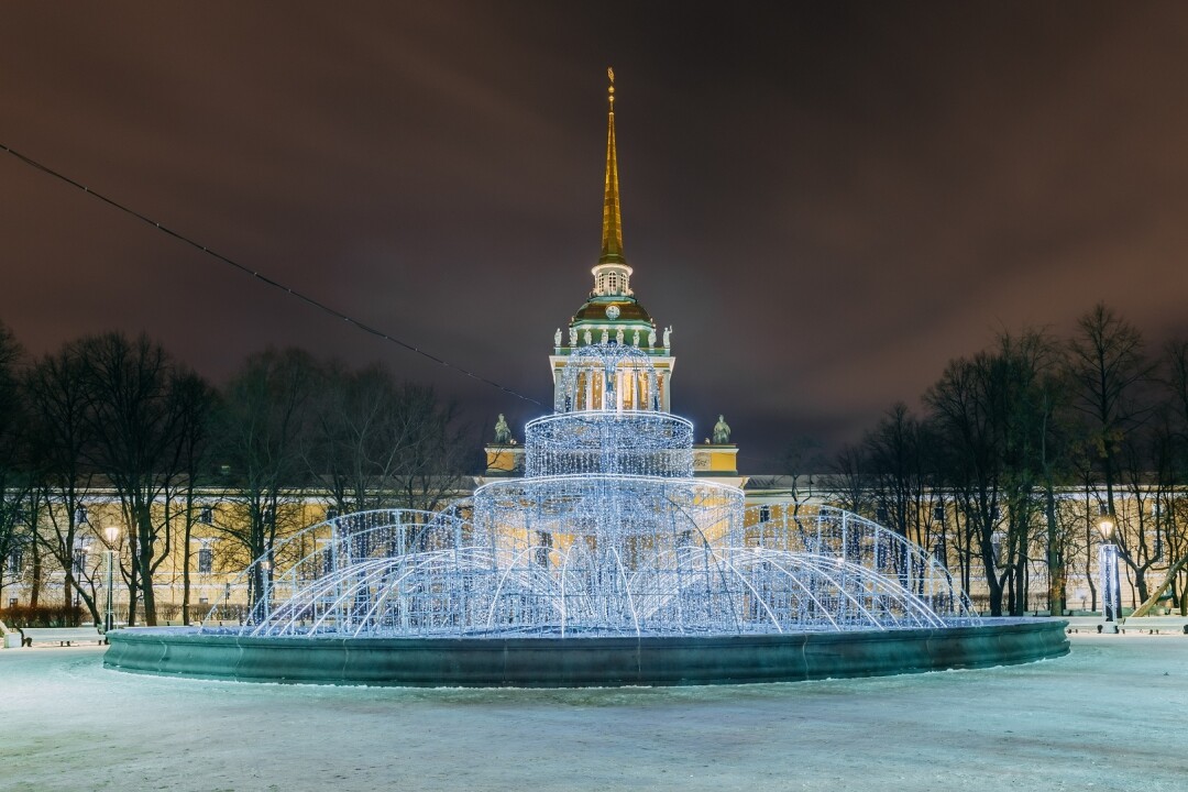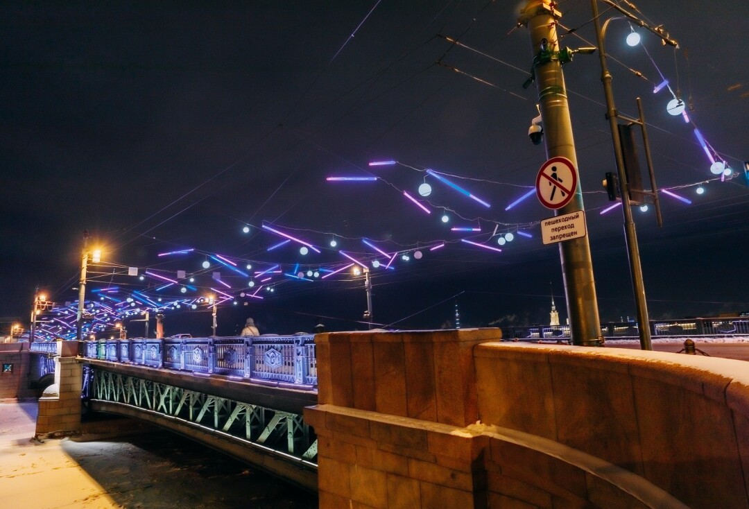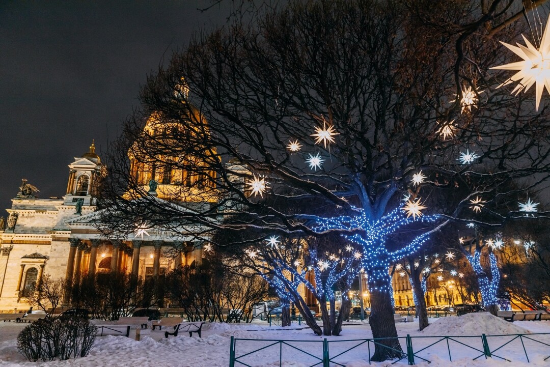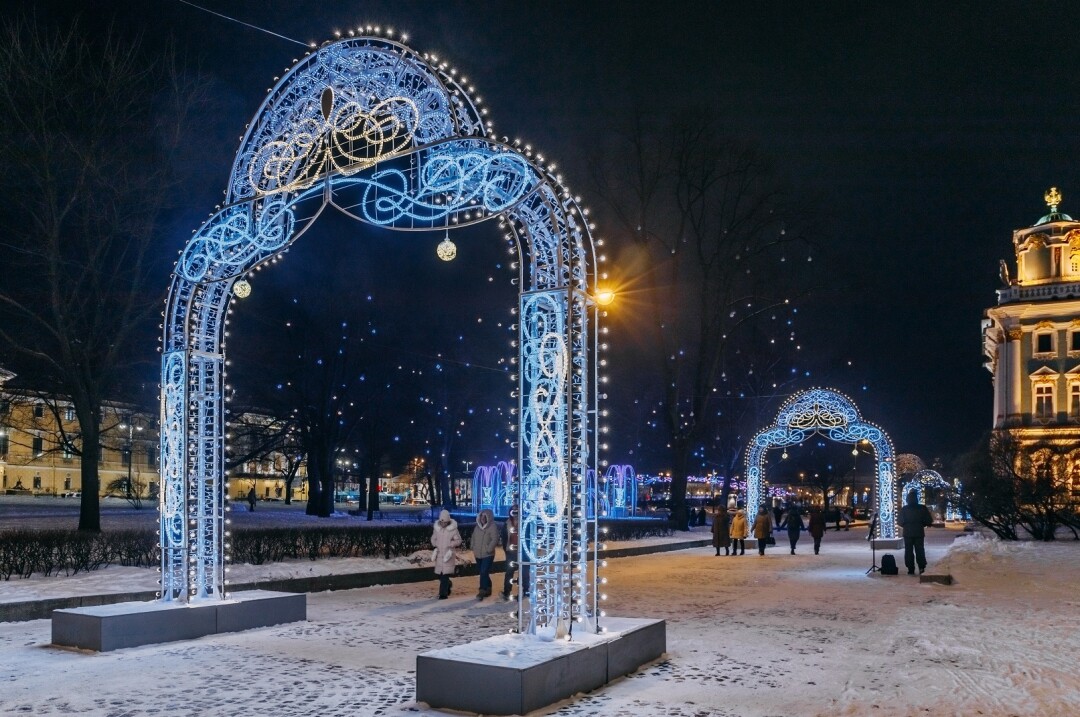 А вот оформление сада Зимнего дворца, Исаакиевской площади, осталось традиционным: звезды, синие гирлянды и диоды, имитирующие струи воды в фонтанах. Над дворцовым мостом вновь появились украшения, создающие эффект «северного сияния». Впервые в этом году такие же установки разместили и над каналом Грибоедова.