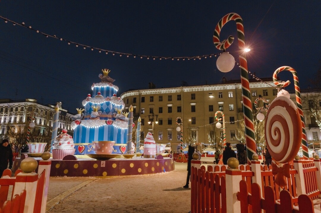 Традиционно она продолжается на Манежной площади, где павильоны построены в стиле европейских старинных домиков, а фонтан накрыт композицией в виде огромного торта. Вдохновлялись авторы сказкой о Щелкунчике: игрушечные солдаты и крысы «снуют» повсюду. На ярмарке работают фудкорт, аттракционы и каток.